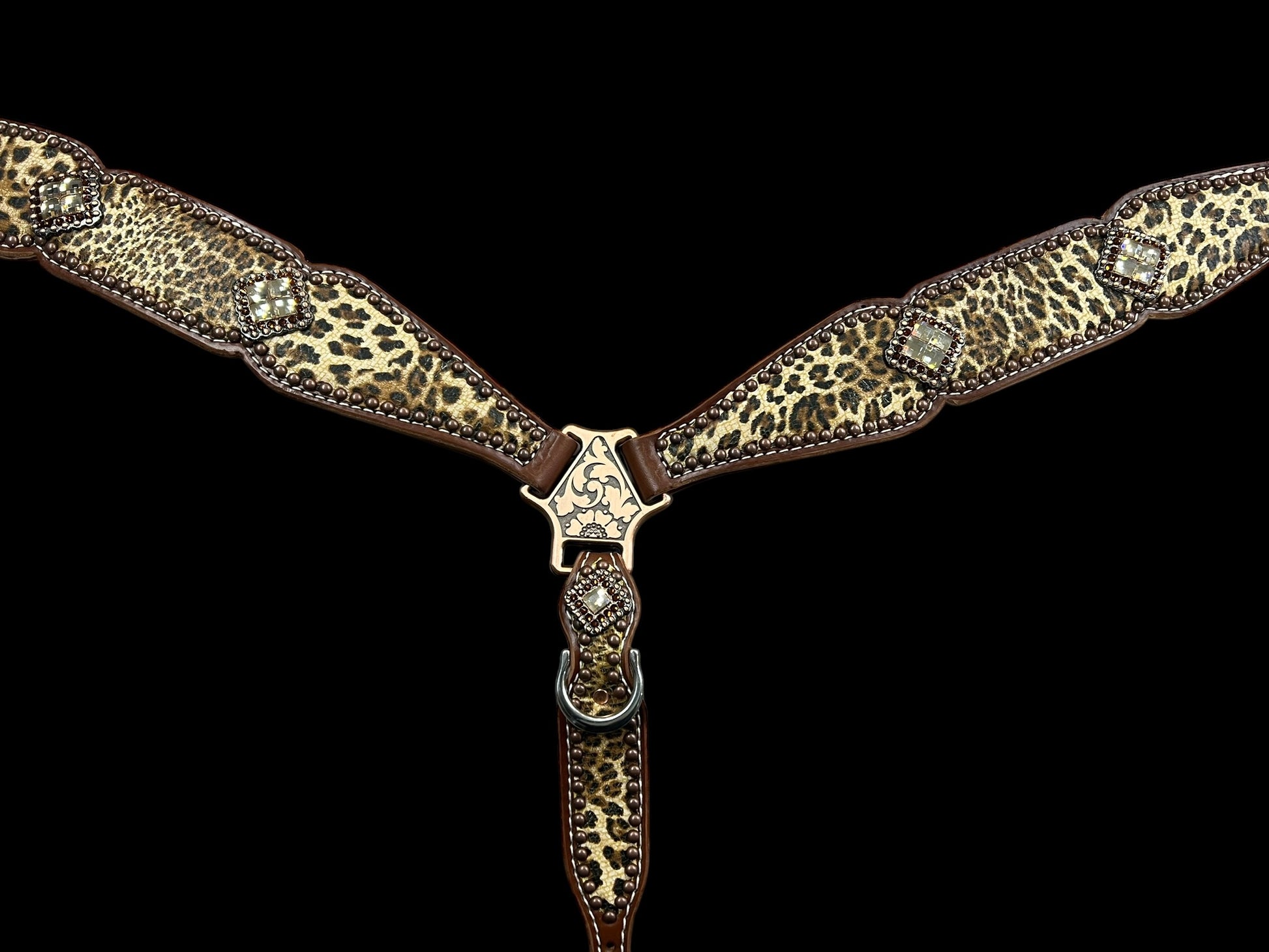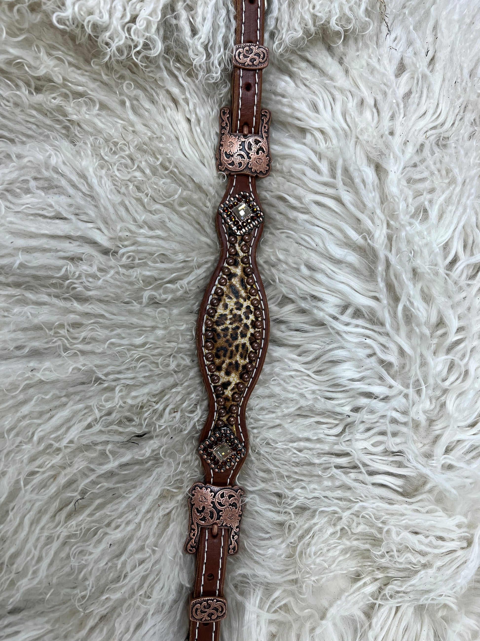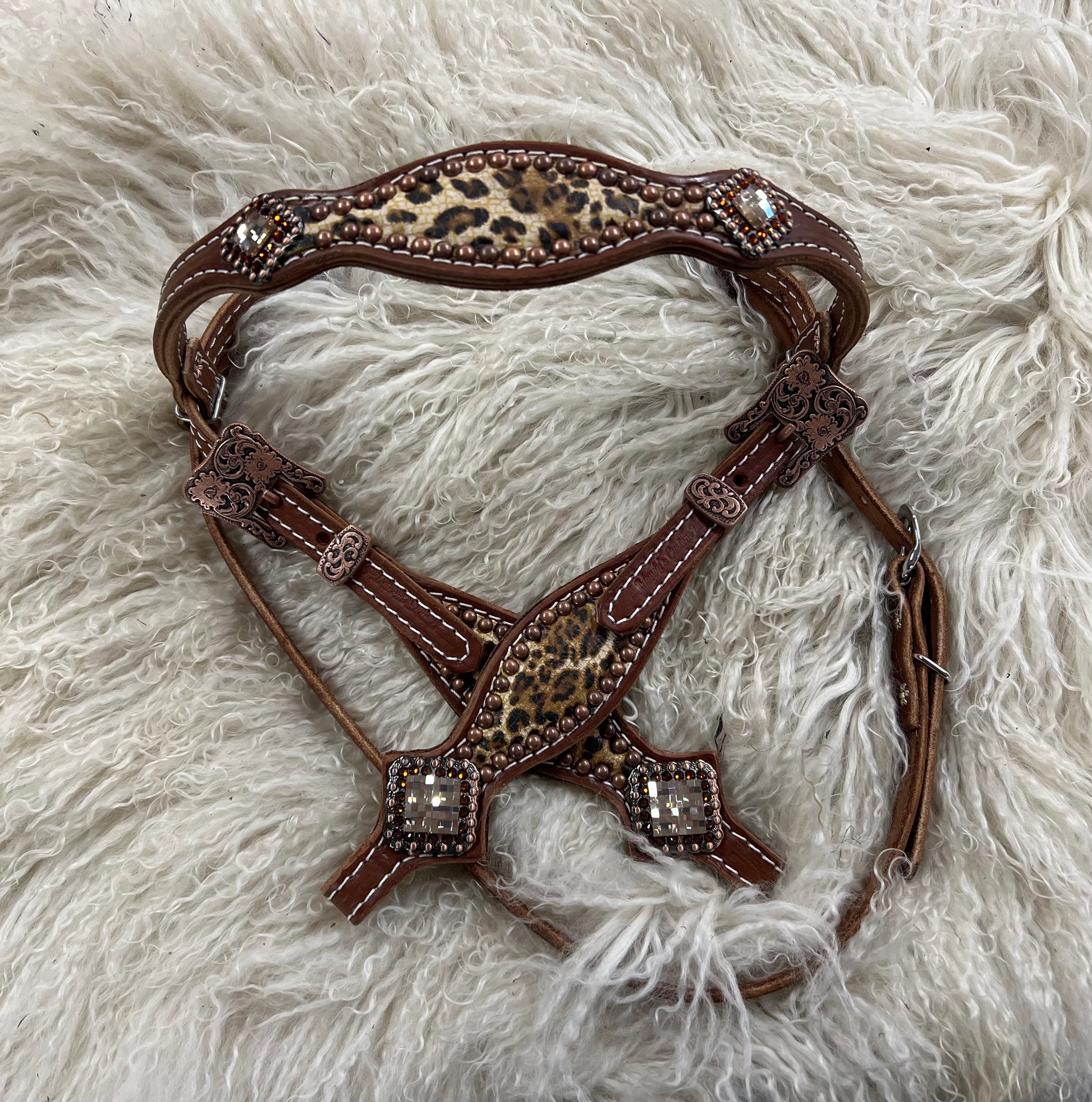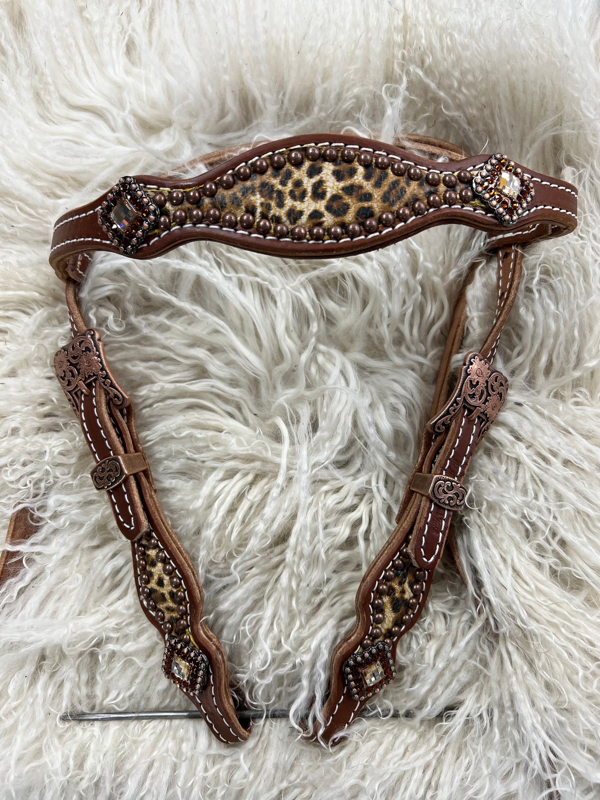 This ensemble features chestnut english bridle leather with cheetah print leather overlay, copper spots, and conchos with Swarovski rhinestones .