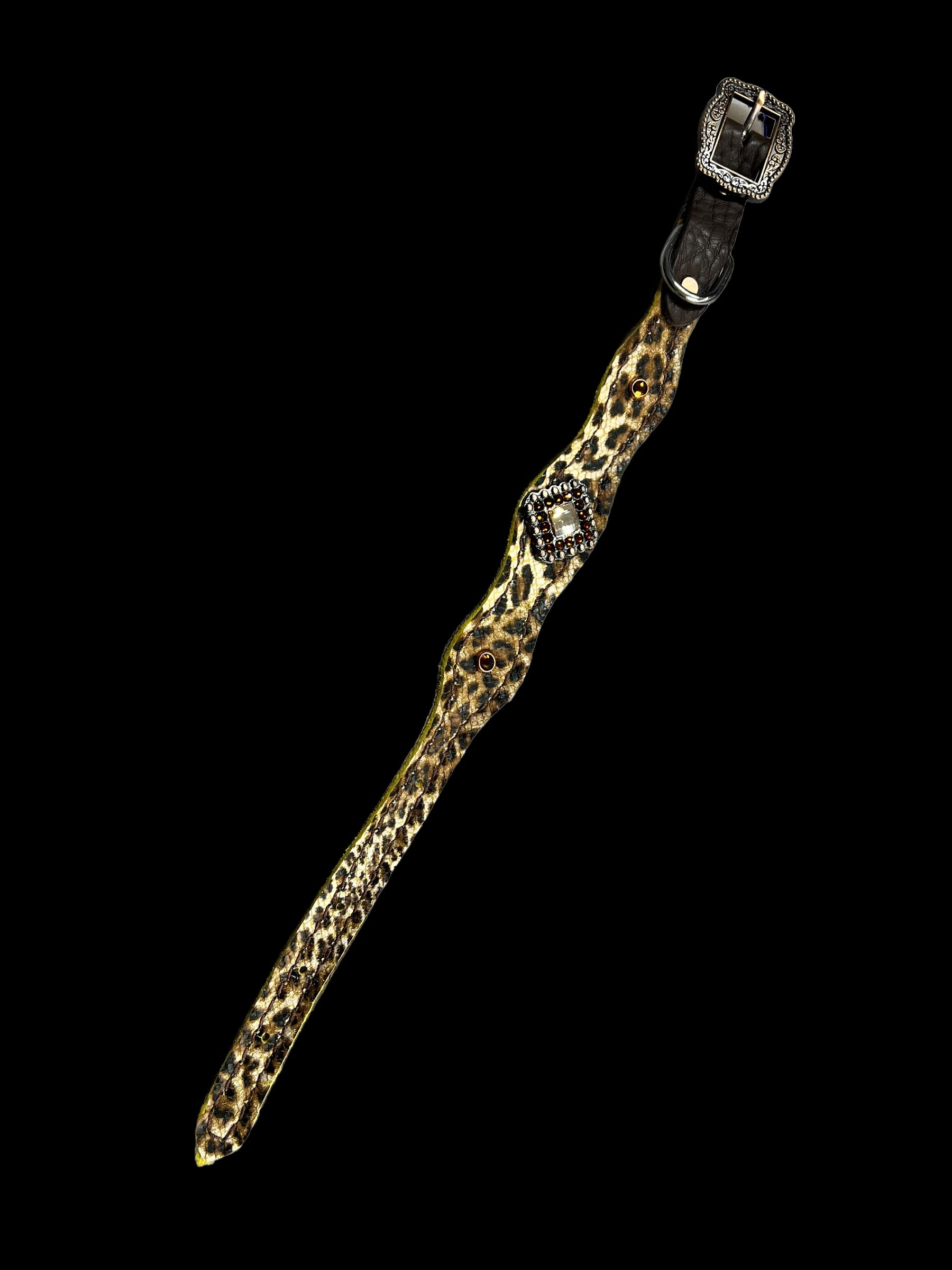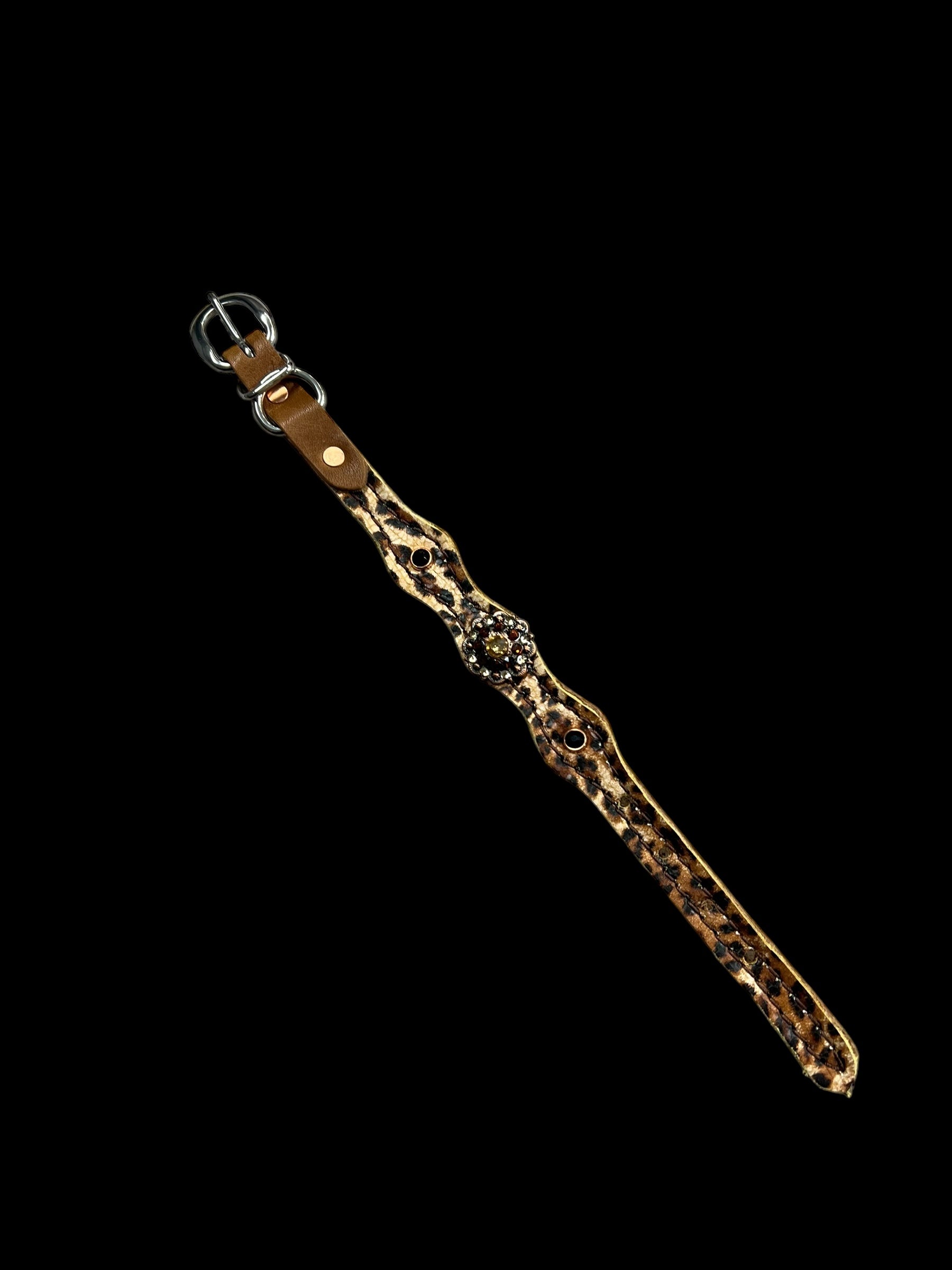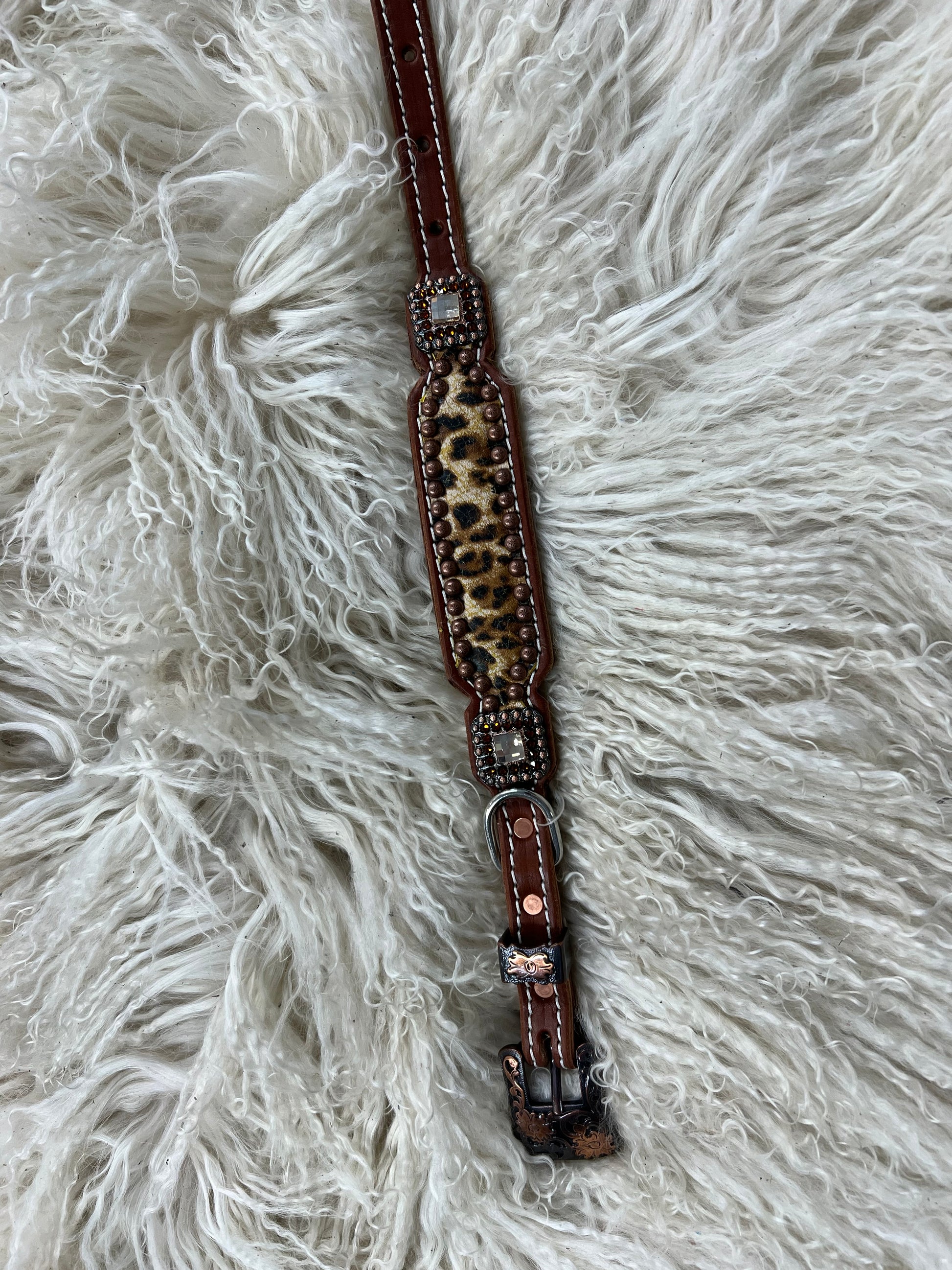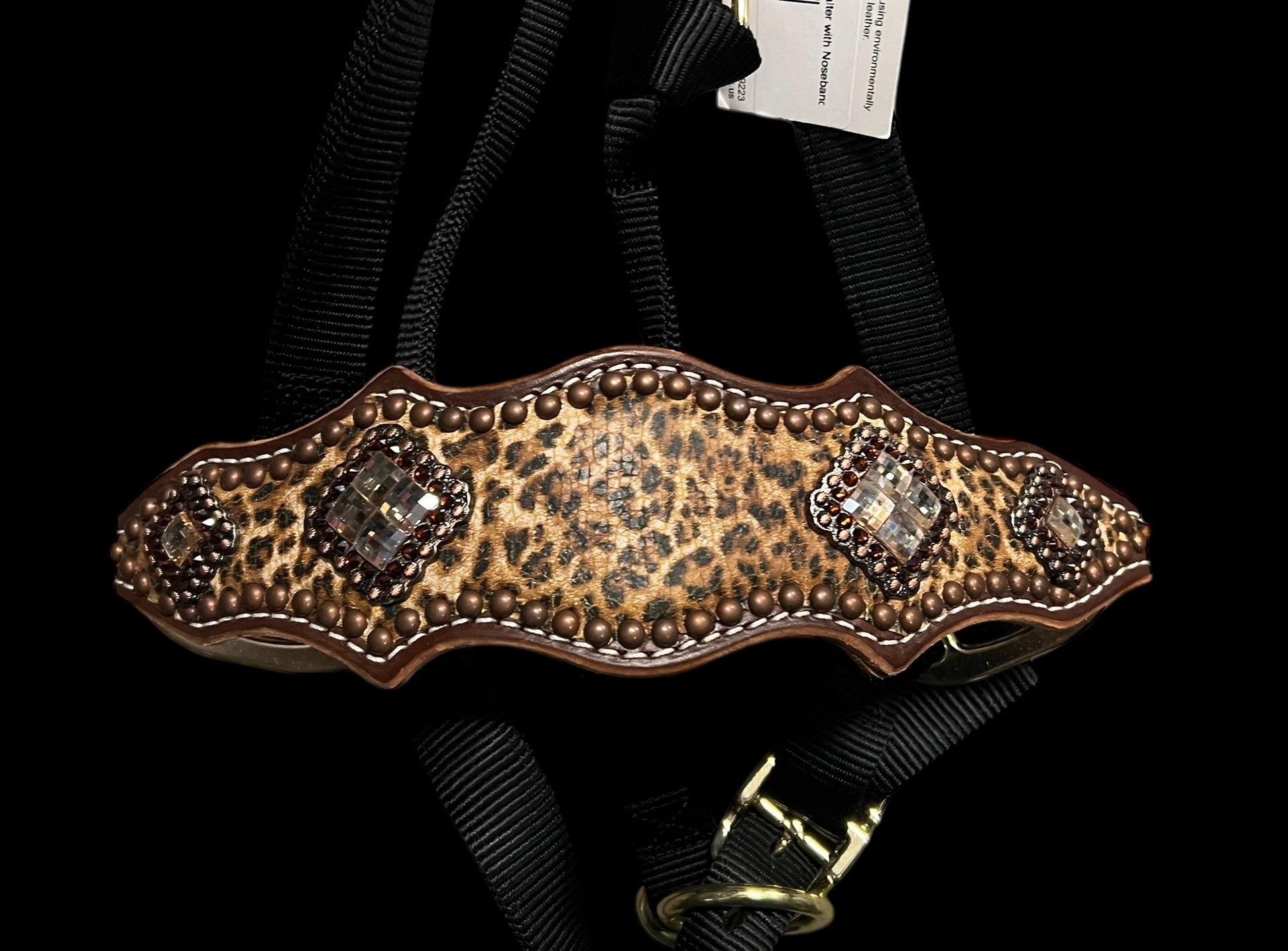 This ensemble features chestnut english bridle leather with cheetah print leather overlay, copper spots, and conchos with Swarovski rhinestones .