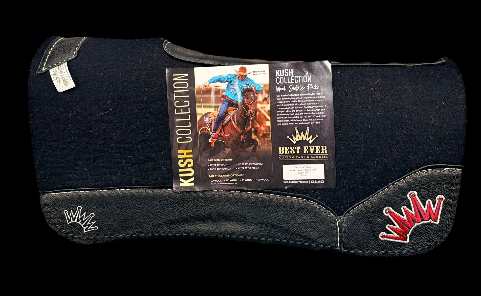 28X28" 3/4" Kush Black leather Crown Emb Crystal Tips Best Ever Saddle Pad