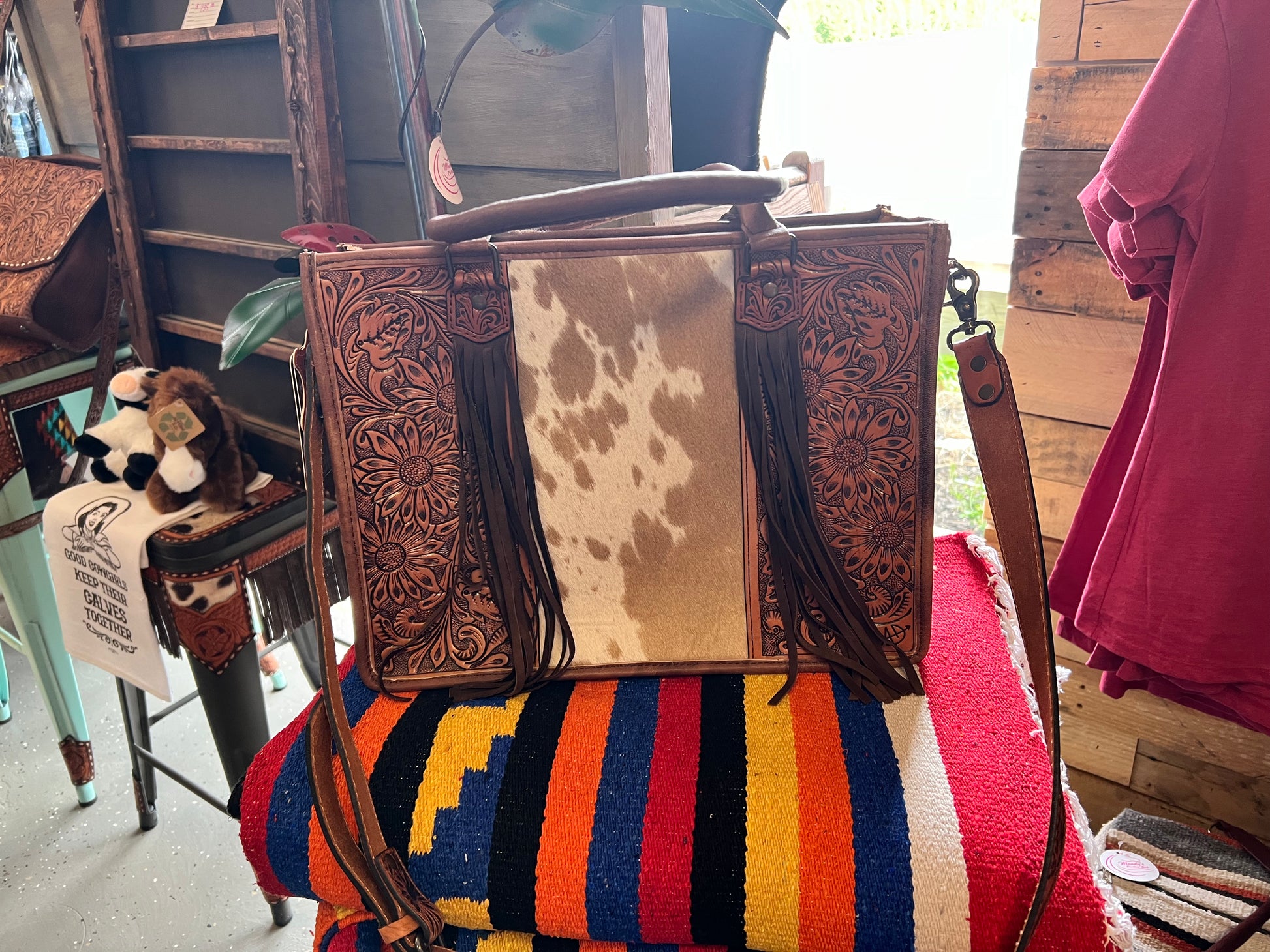 The bag is decorated with a beautiful leather fringe on each side giving it a western look.