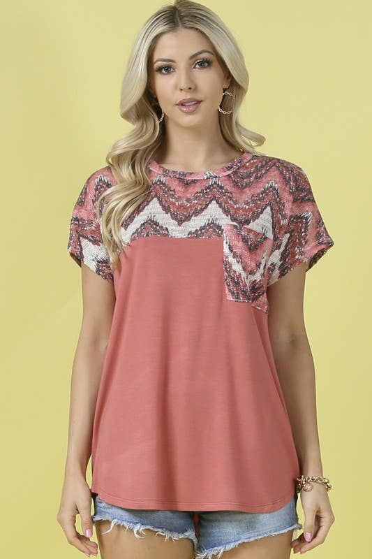Discover the Shirly Chevron Knit Color Block Top from Avery, designed for women who value both comfort and style. This classic piece, crafted from a blend of 78% Polyester, 18% Rayon, and 4% Spandex, offers a missy fit that's perfect for work or any core season occasion. The short-sleeve top boasts a unique chevron knit print that adds a touch of vibrancy to your wardrobe. For maintenance, it's machine-wash friendly. Inspired by generations of family clothing makers, this Avery top is designed to be your clothing best friend - kind, comfortable, and supportive.