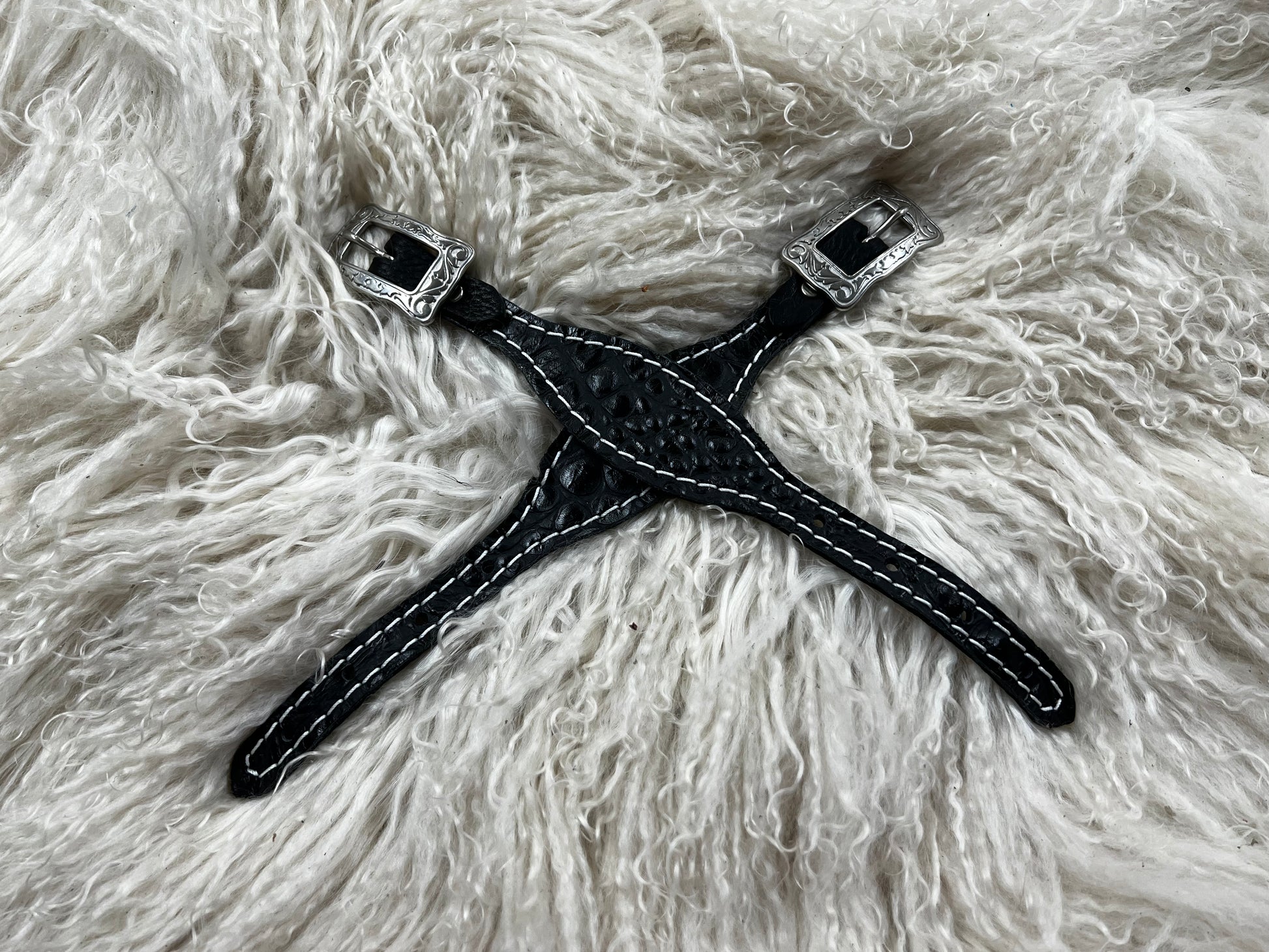 This one ear headstall and breast collar feature medium english bridle leather with black gator embossed leather overlay, stainless spots, and conchos with genuine rhinestones