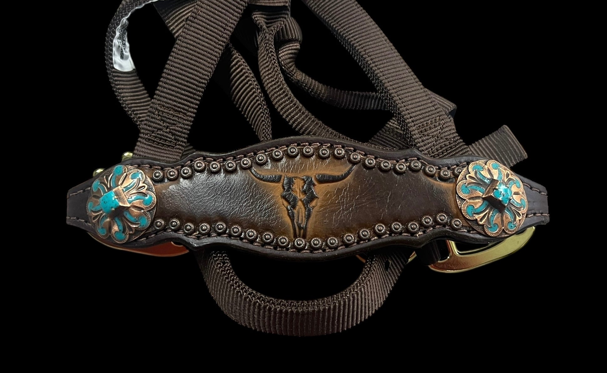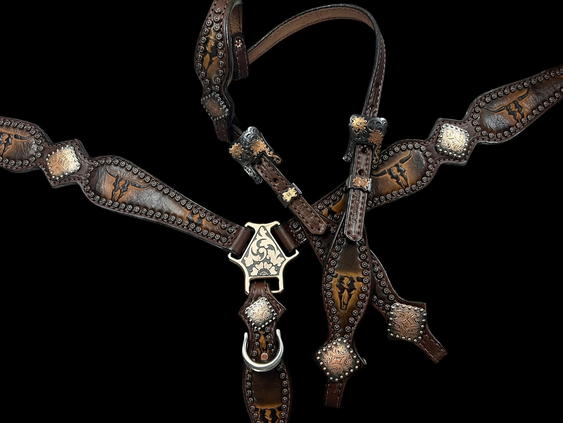 This set features Walnut english bridel leather leather, chocolate longhorns embossed leather hide, copper spots, and copper conchos and buckles.