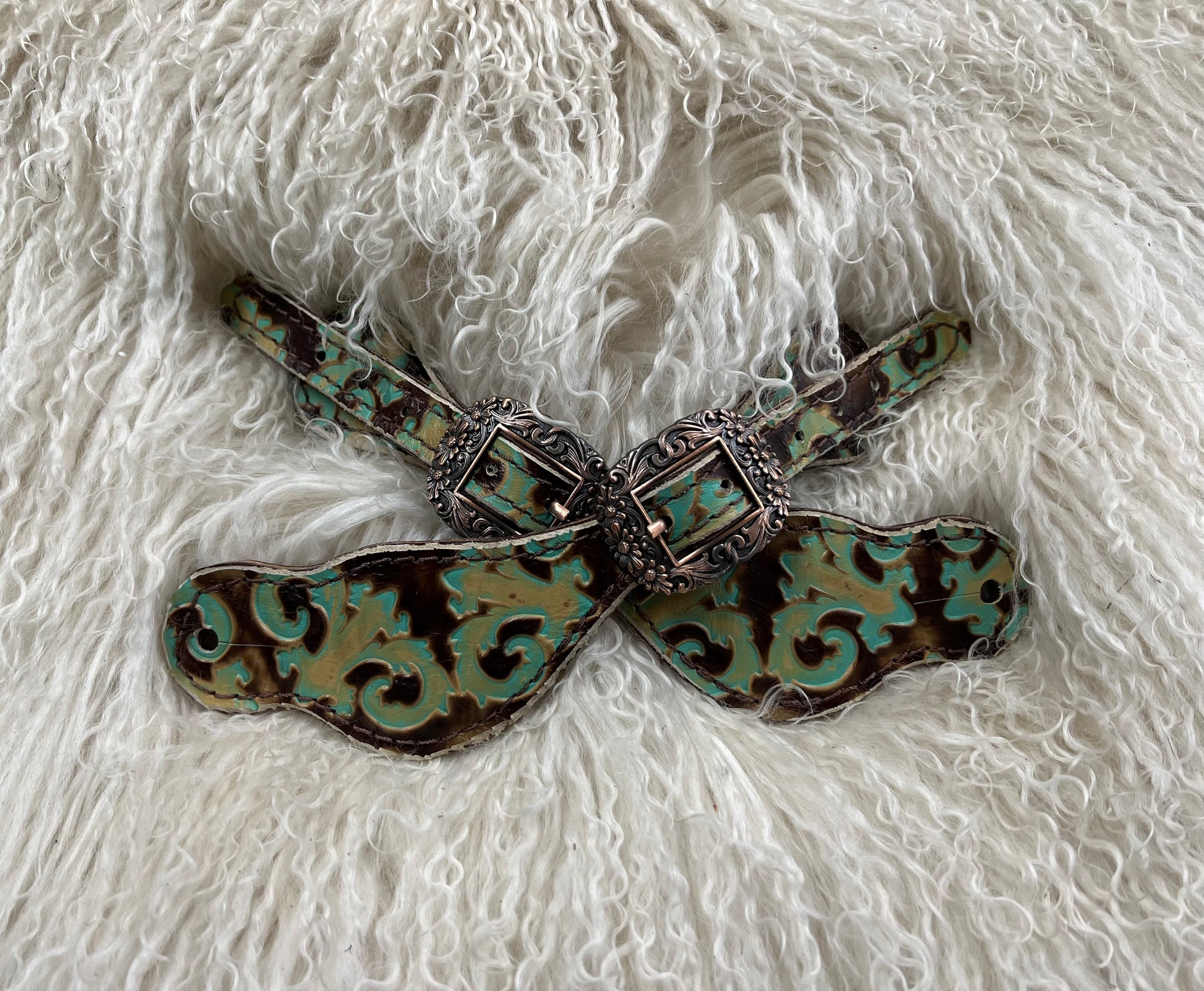 This ensemble features dark chocolate english bridle leather with brown and turquoise Corona embossed leather overlay, copper spots, and copper conchos.