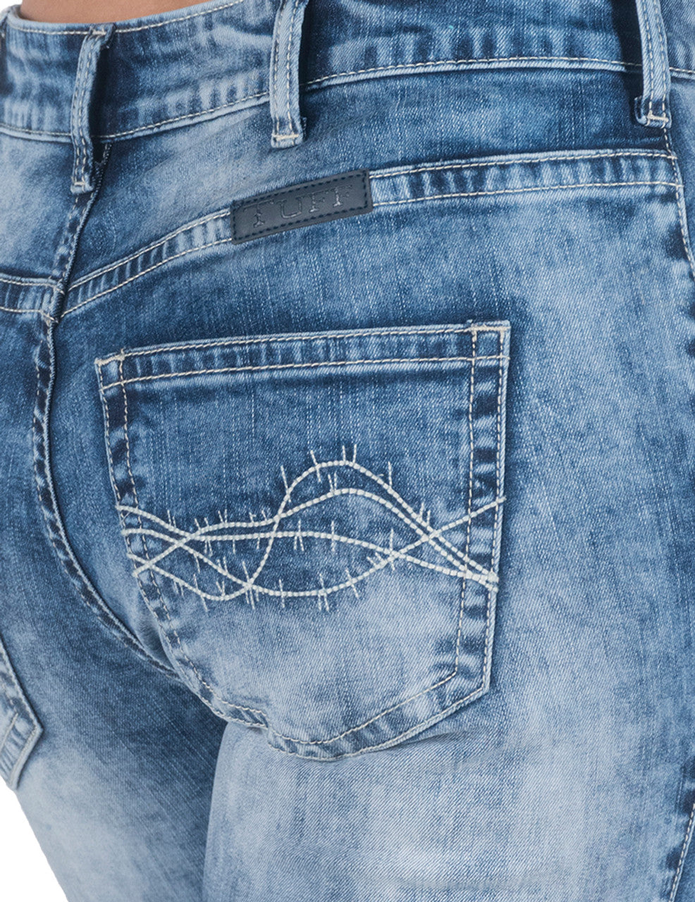 The most requested jean is HERE! 98/2 Tuff Flex lightweight denim, medium stretch, mid-rise, bootcut leg opening, with a light wash that has a subtle worn in look that is ready for you to slide them on for your next big weekend! You can style them up by cuffing the bottoms to show off your latest sandals or stack them up on your favorite cowboy boots. These will be your go-to this summer for the hottest days in the saddle. We love how the subtle overall cream stitching makes them easy to match up with any of your favorite tops.