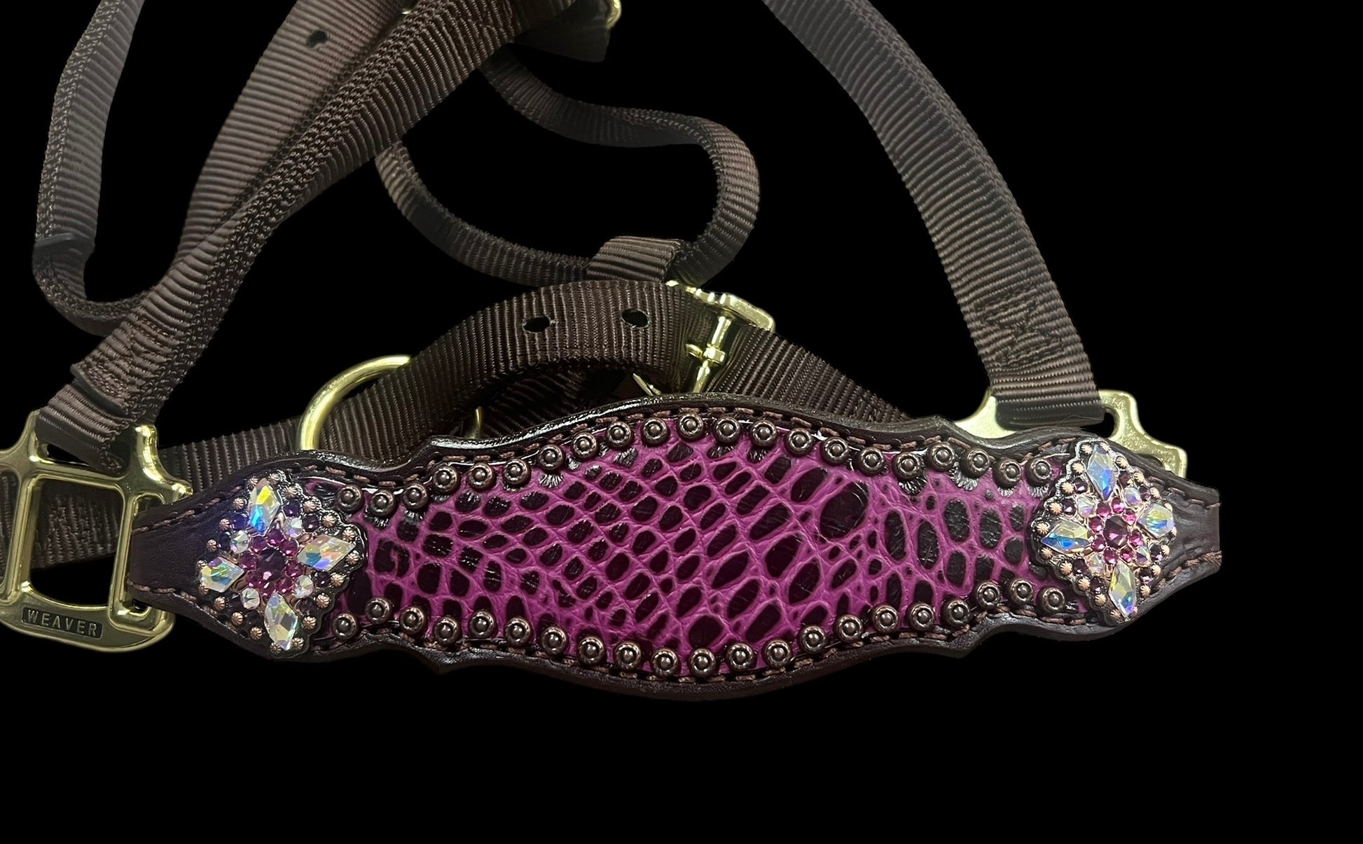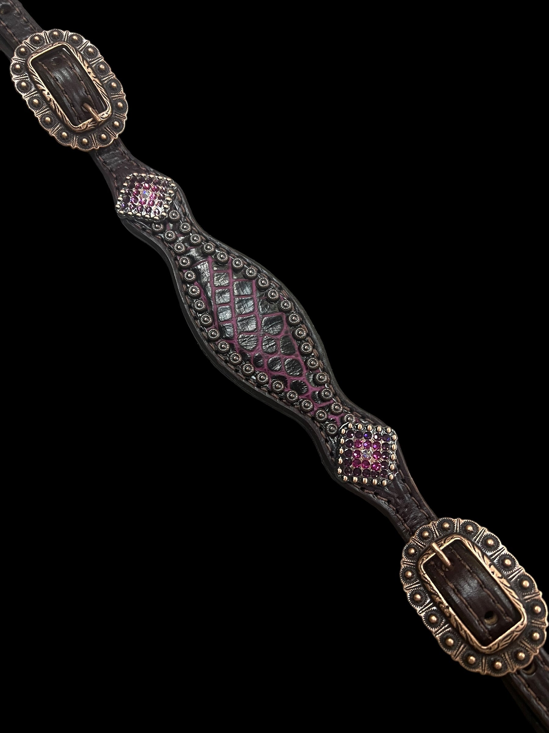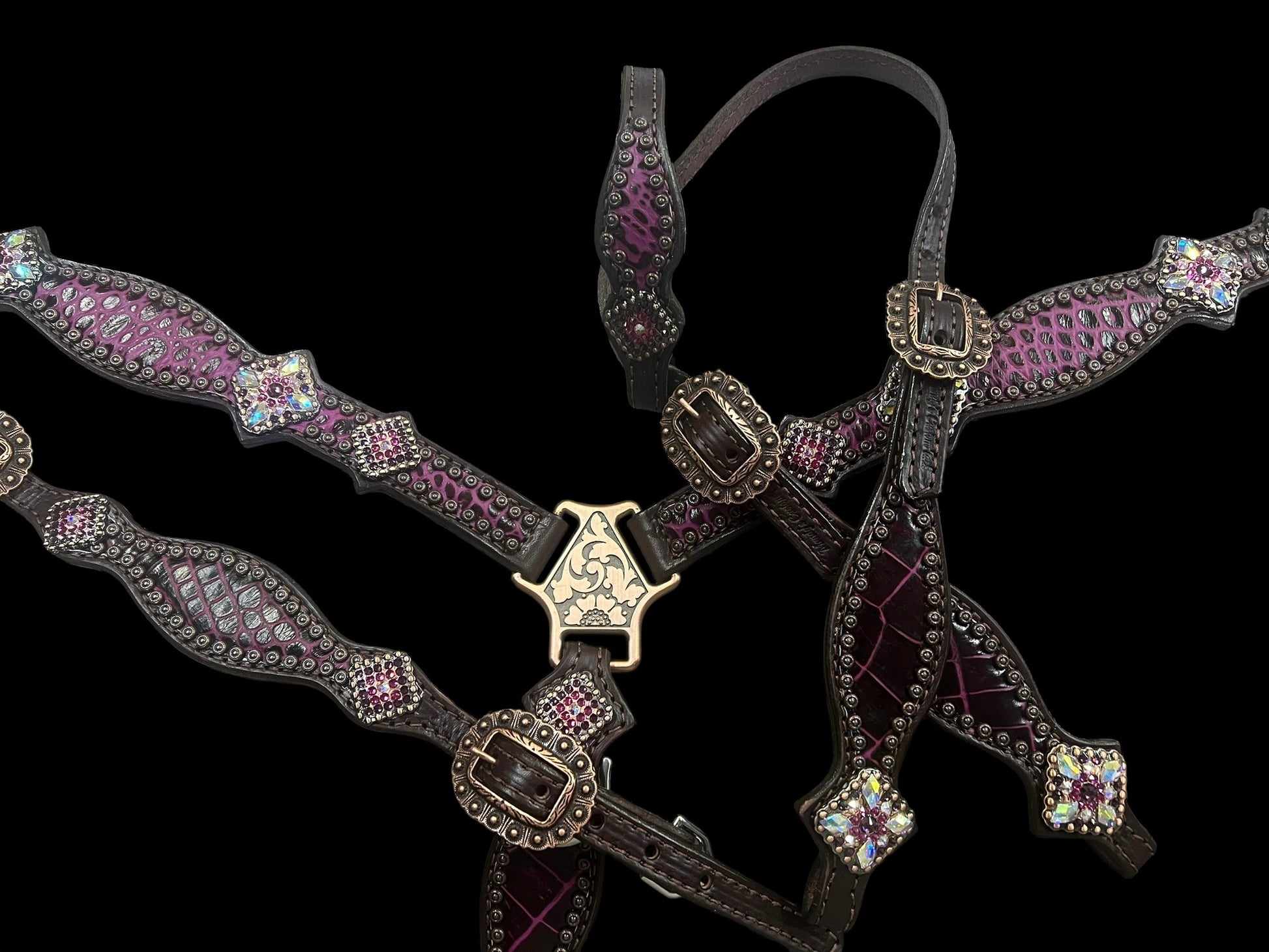 This ensembles features dark brown English bridle leather with fuchsia gator embossed overlay, copper spots, and conchos with genuine rhinestones.