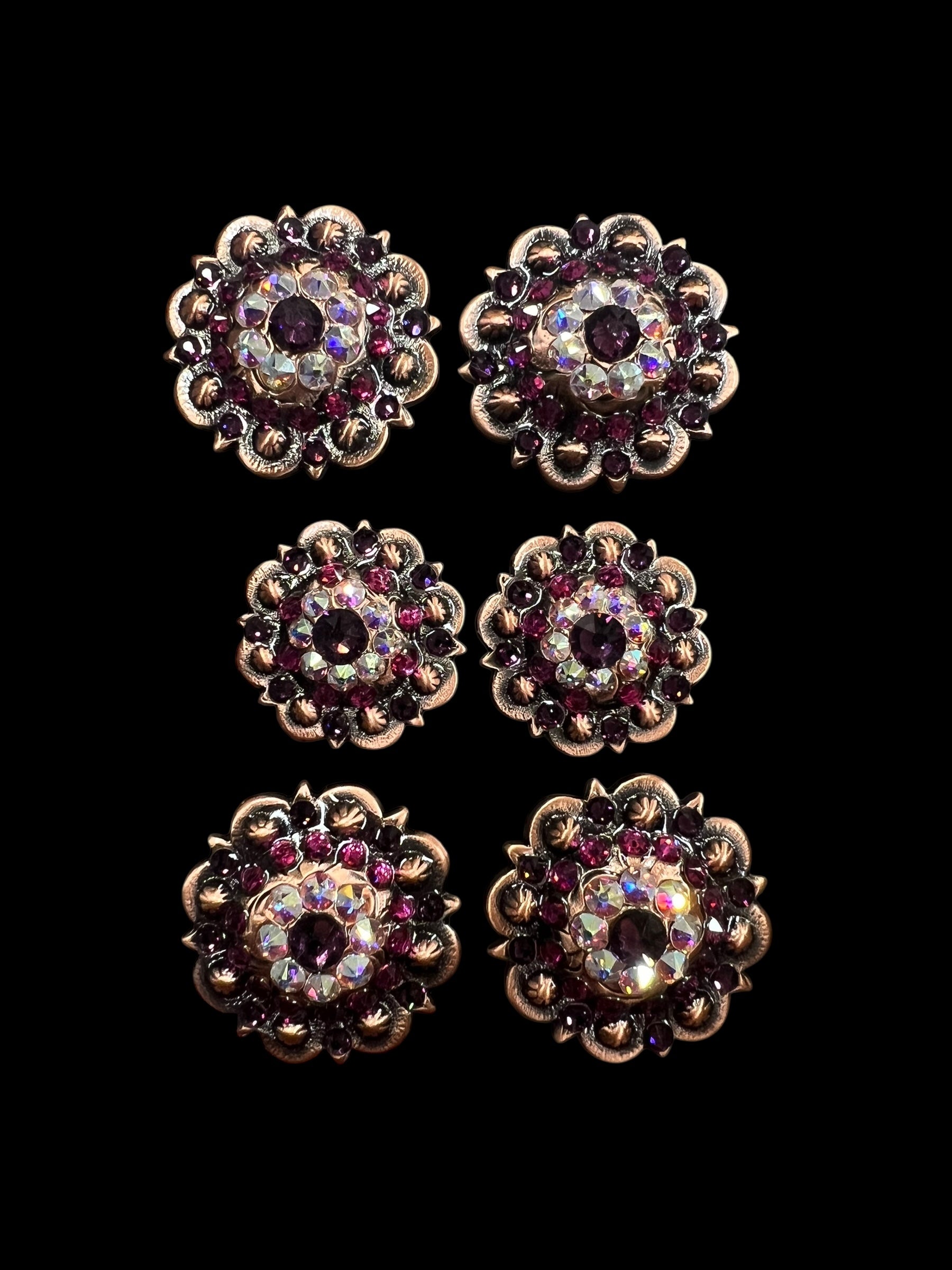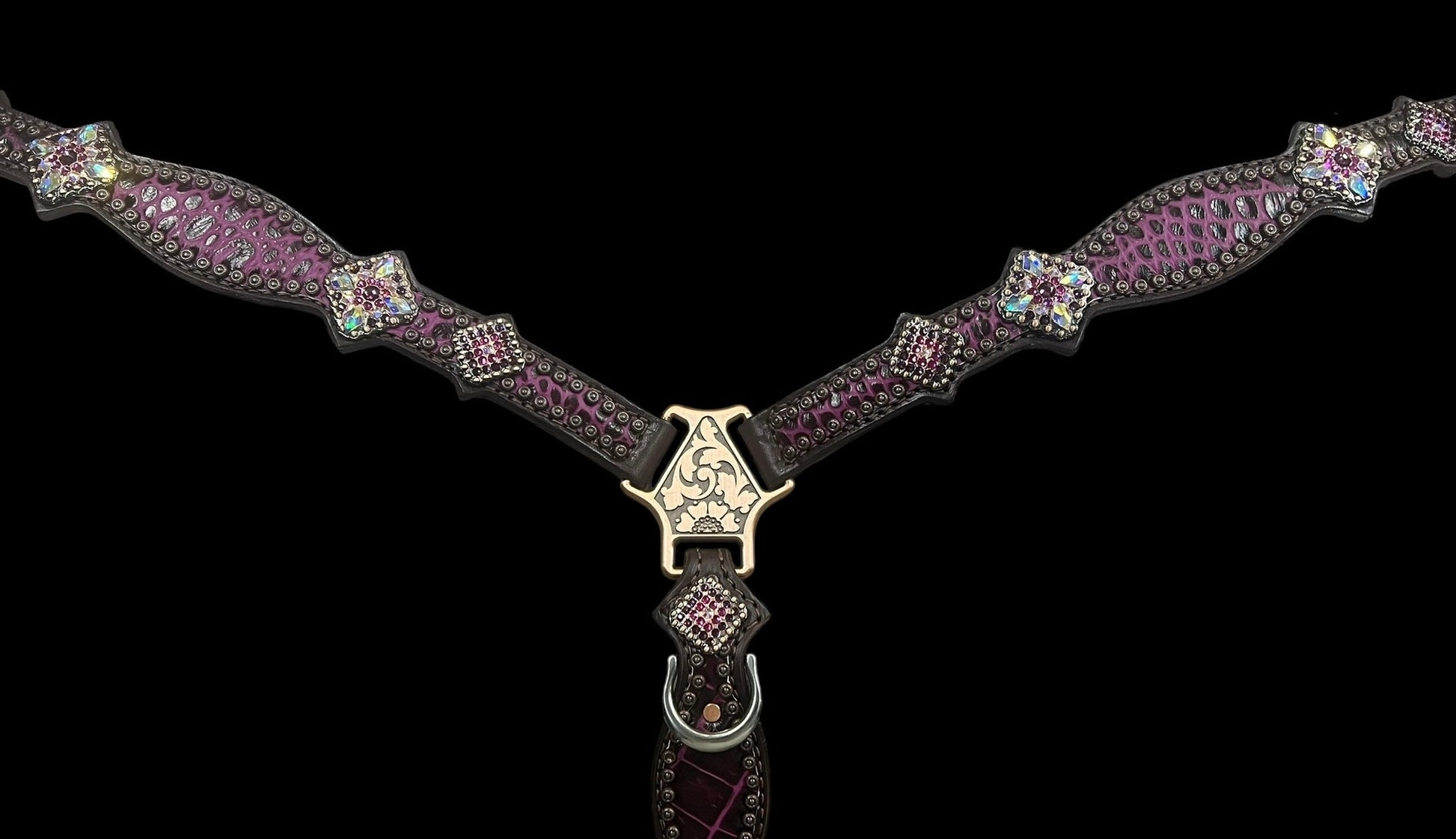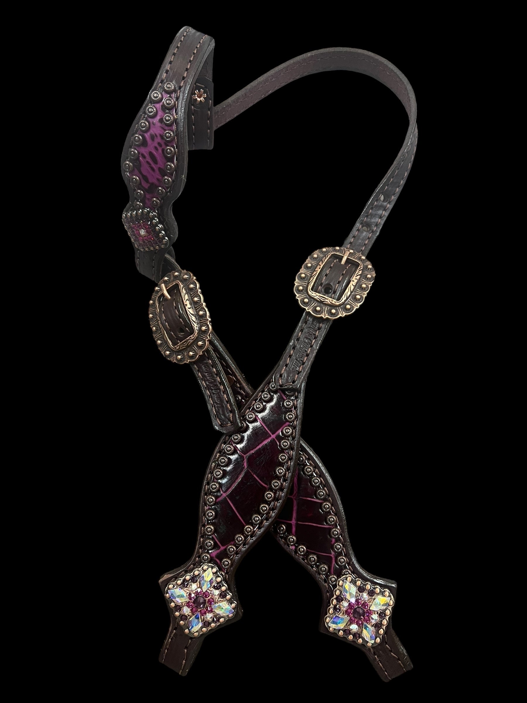 This ensembles features dark brown English bridle leather with fuchsia gator embossed overlay, copper spots, and conchos with genuine rhinestones.