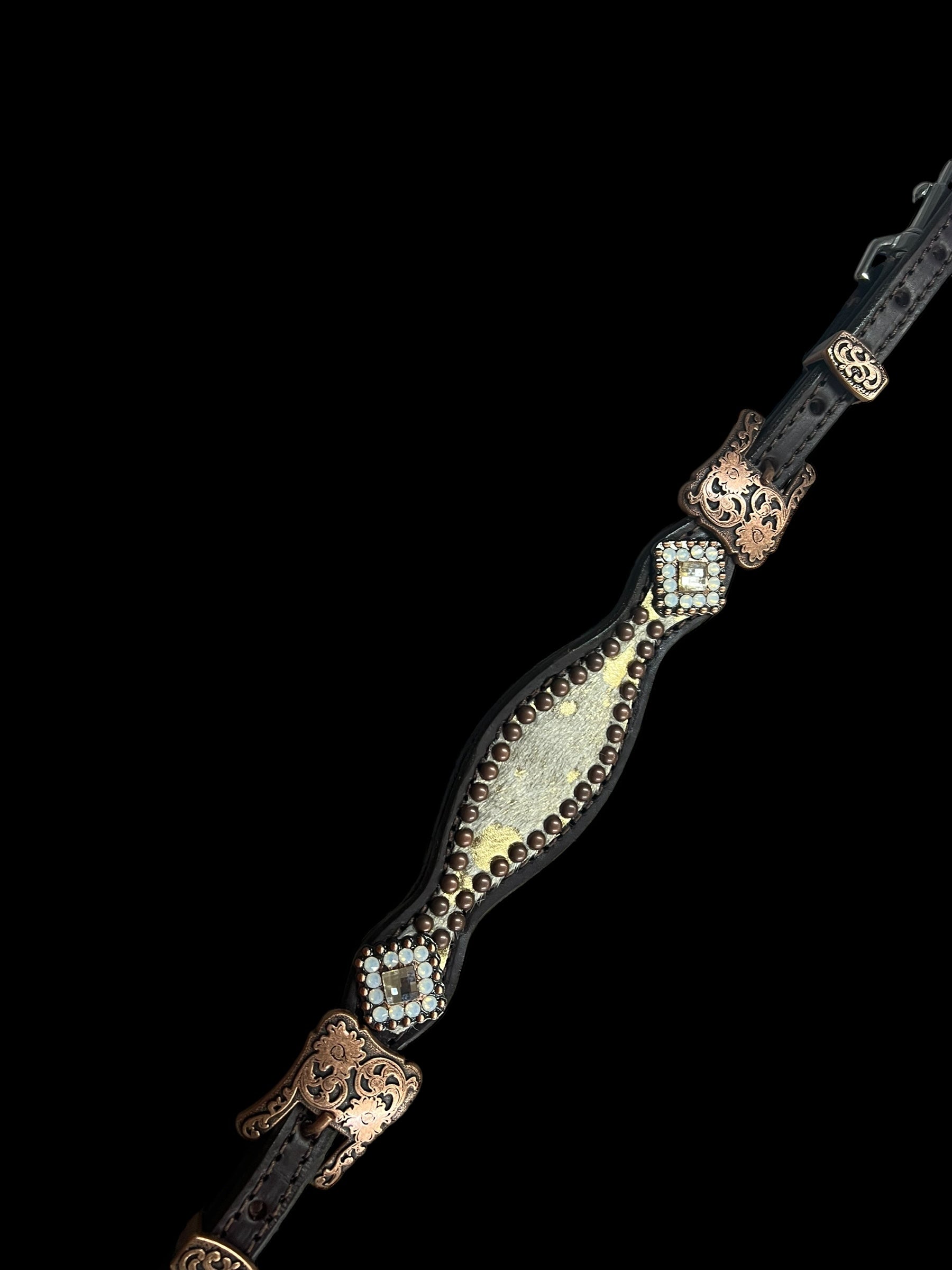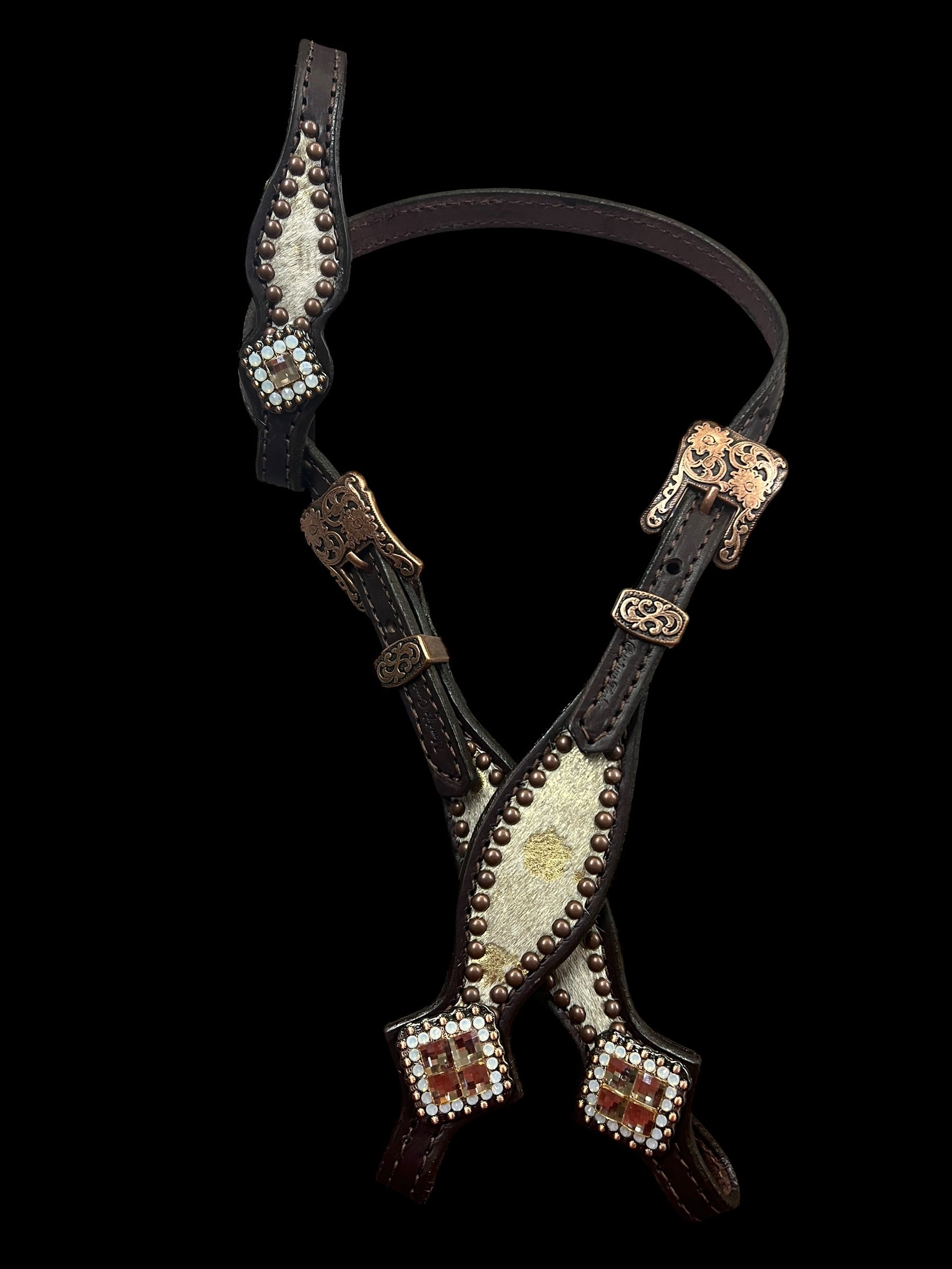 This ensemble features chocolate english bridle leather with white with gold acid wash hair on hide leather overlay, copper spots, and conchos with genuine rhinestones.