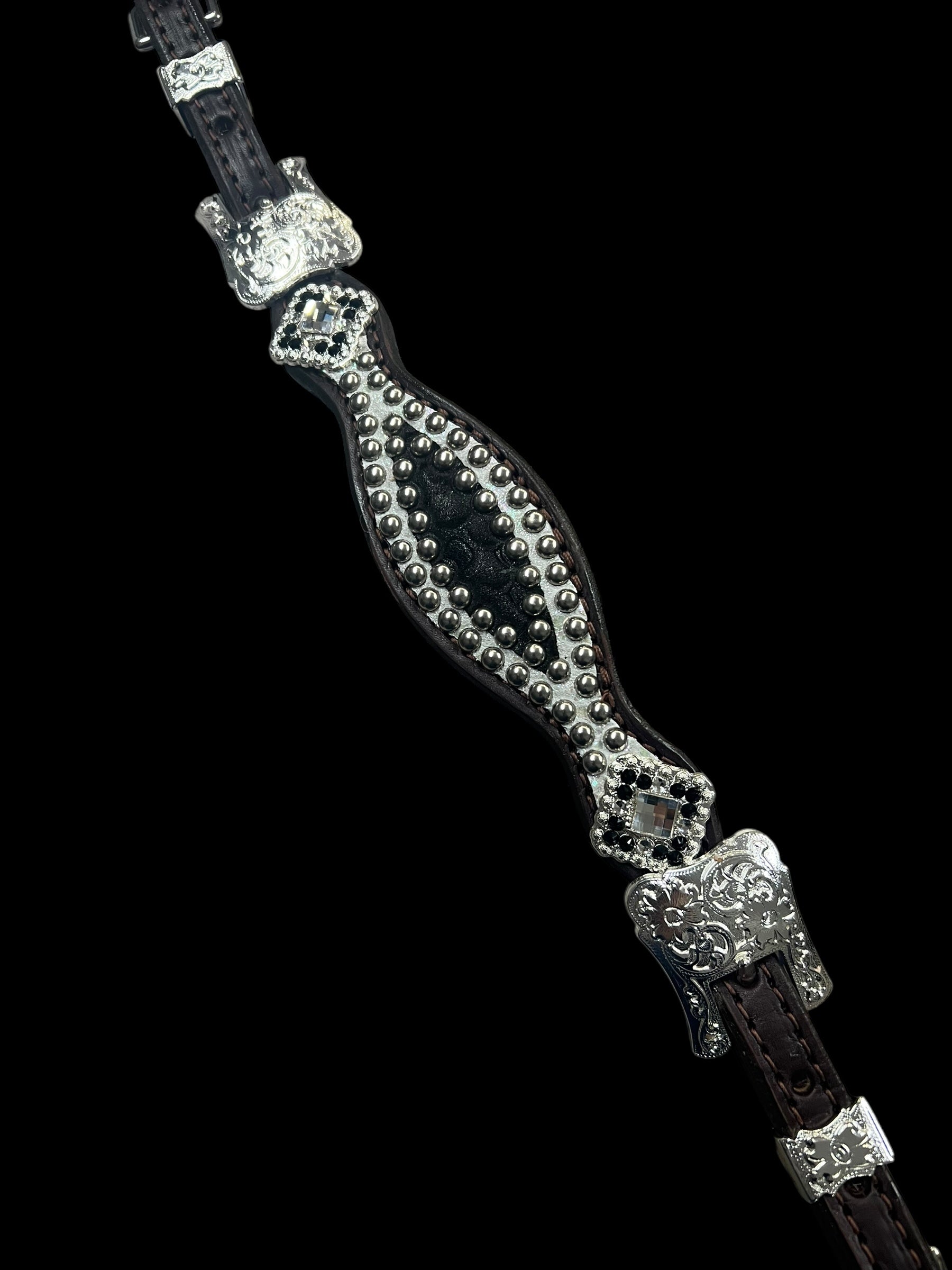 This ensemble features dark english bridle leather with white mystic and Black mystic leather overlays, stainless spots, and conchos with genuine rhinestones.