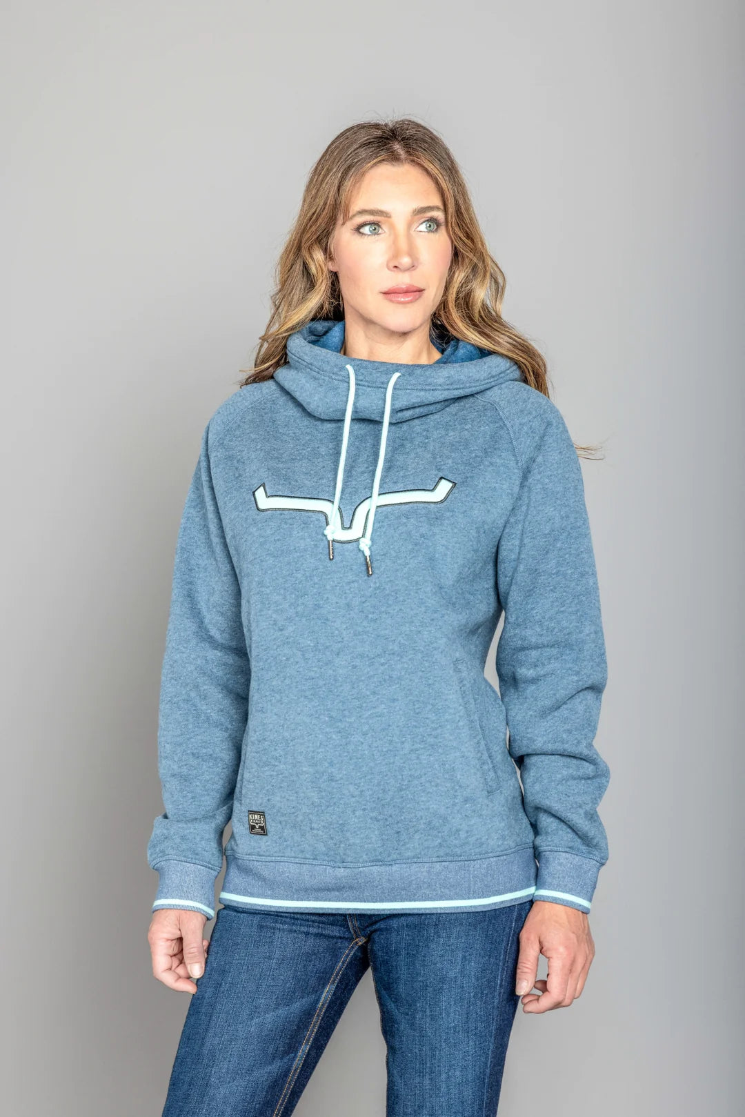 The Two Scoops Hoodie features a cowl-neck hood and relaxed fit for comfortable everyday wear. The contrasting knotted hood drawstrings and single stripe hem and cuffs make this hoodie stand out. Details are completed with a large embroidered horn applique at the chest and a small Kimes Ranch logo patch at the large pouch pocket. This hoodie takes the cake for most comfortable.