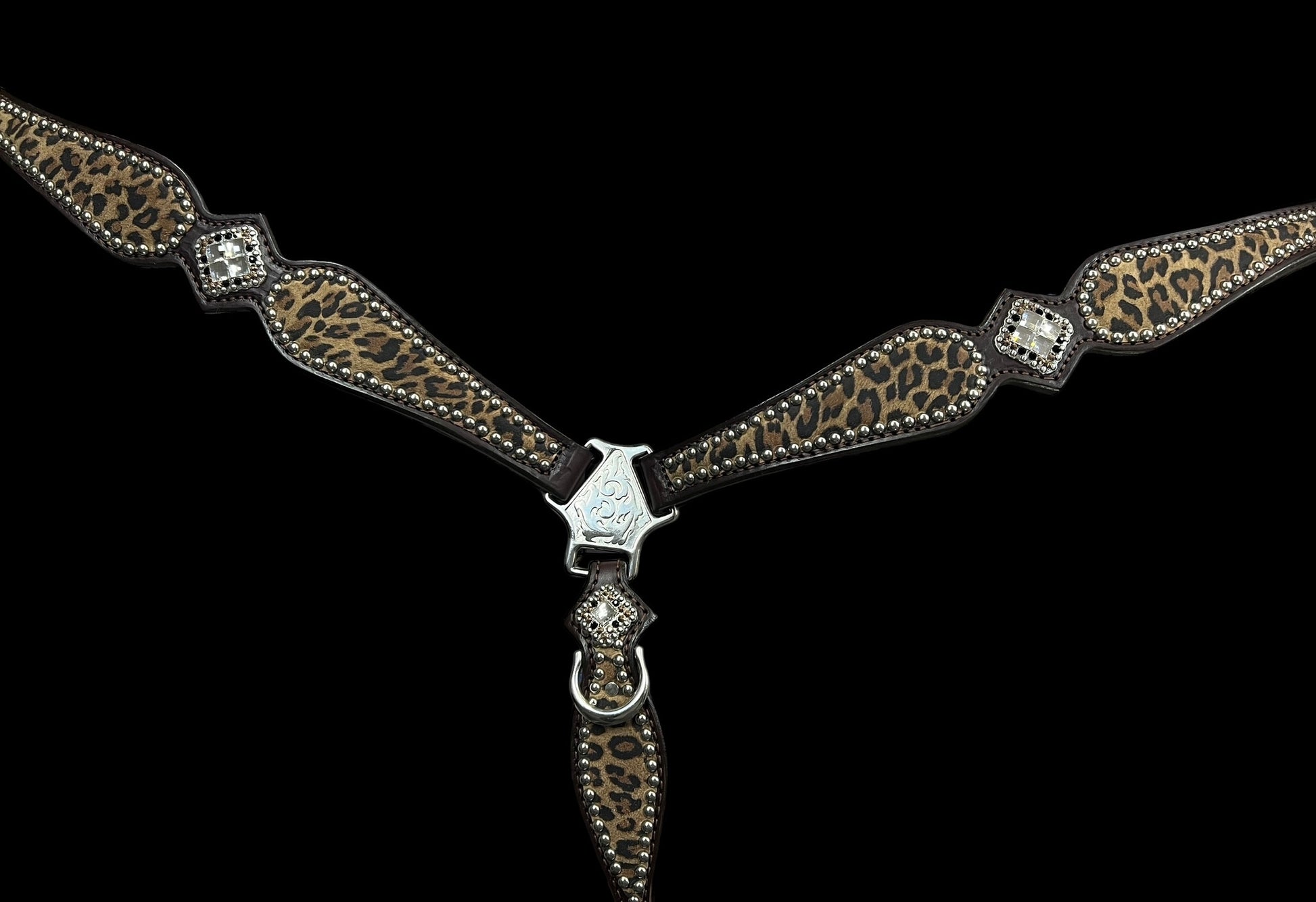 This ensemble features dark chocolate english bridle leather with leopard print leather overlay, stainless spots, and conchos with genuine rhinestones.