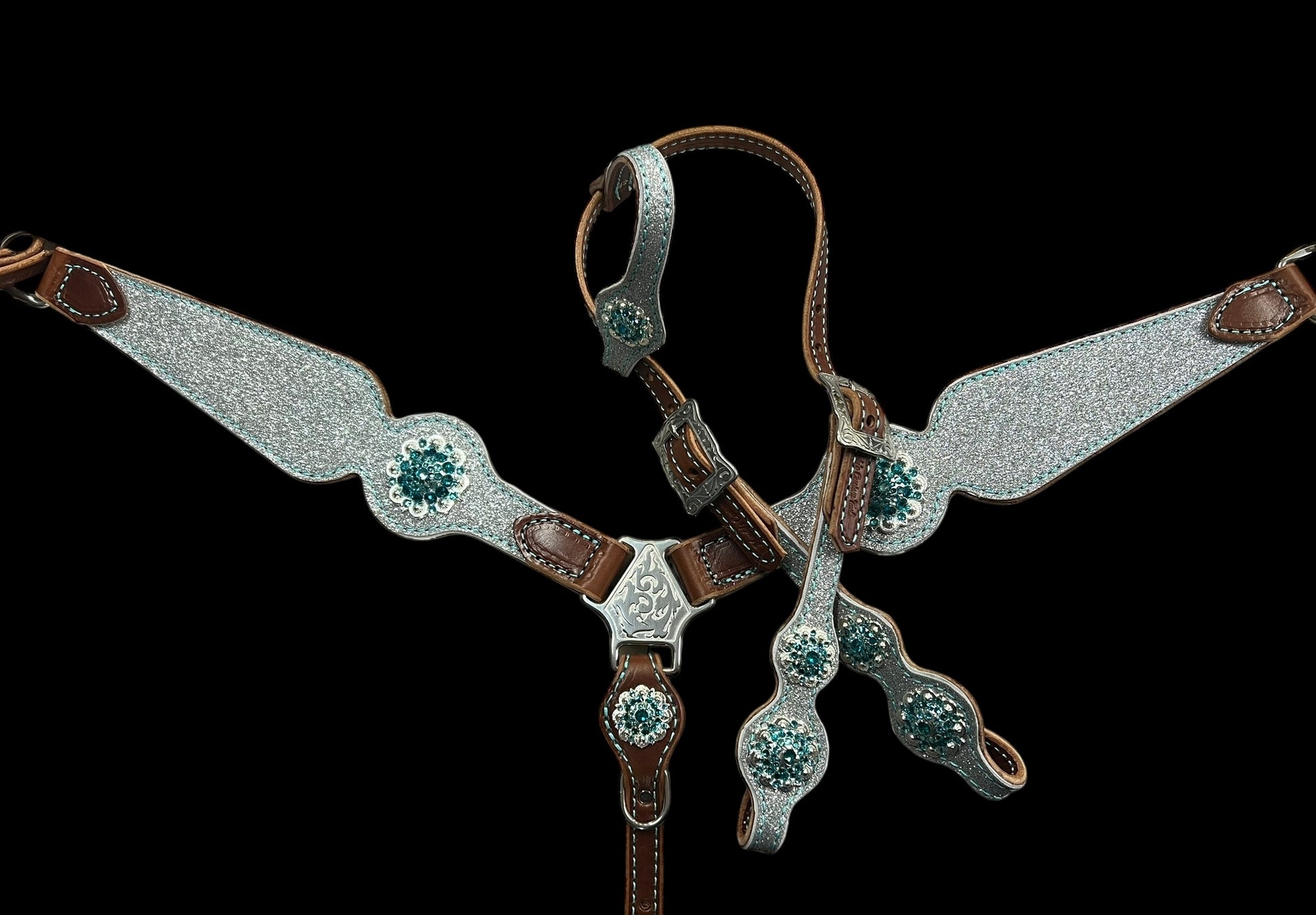 These sets are made from quality harness leather, silver glitter overlay, stainless hardware, and genuine rhinestones. Sold as a set only