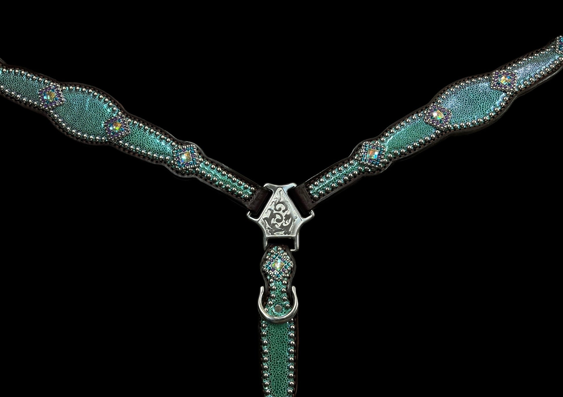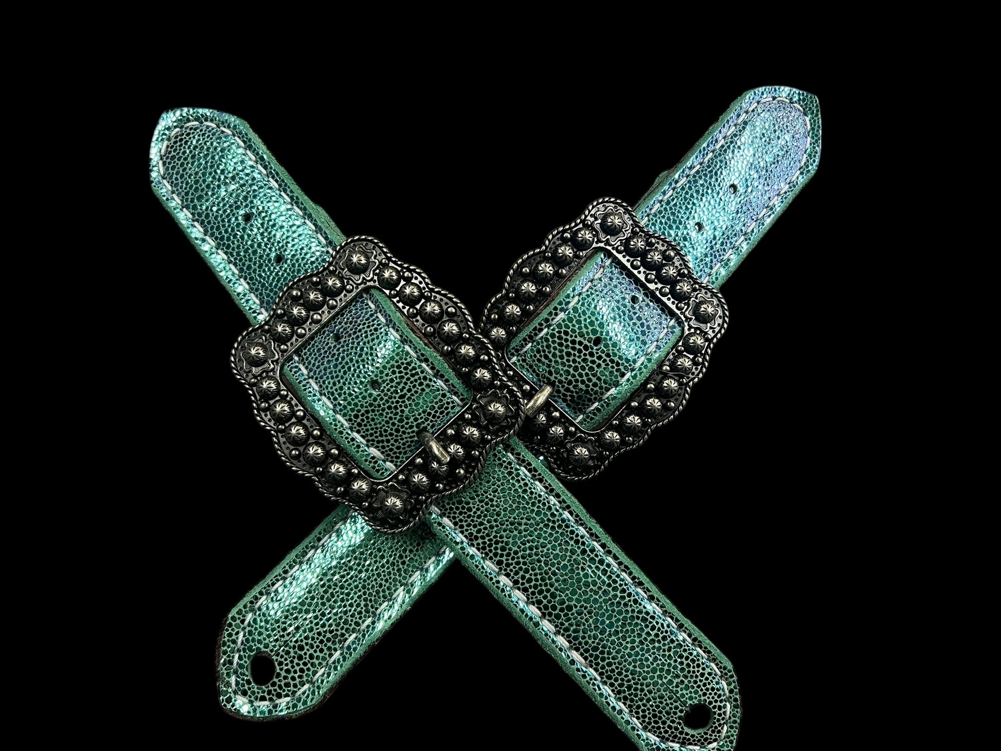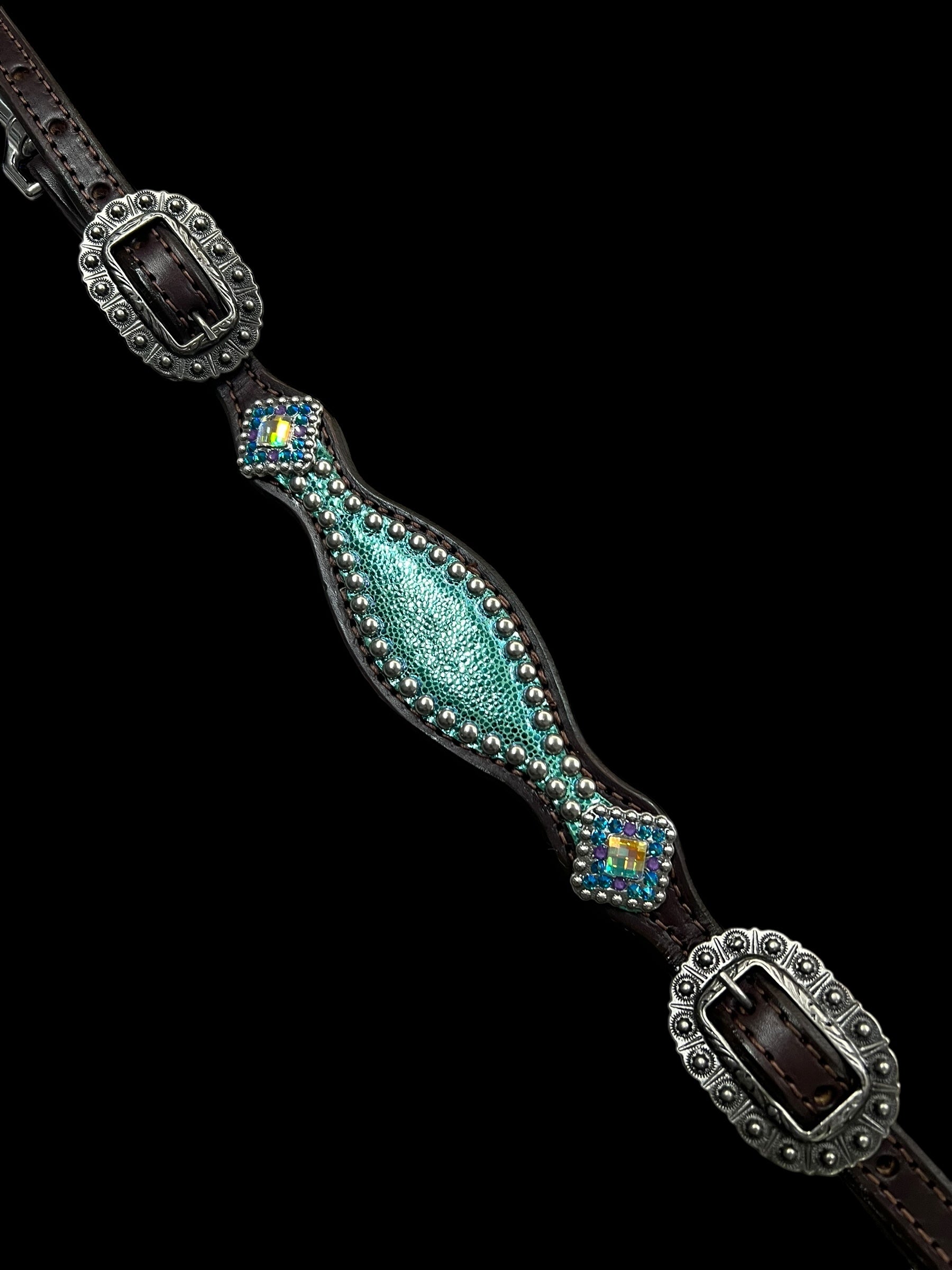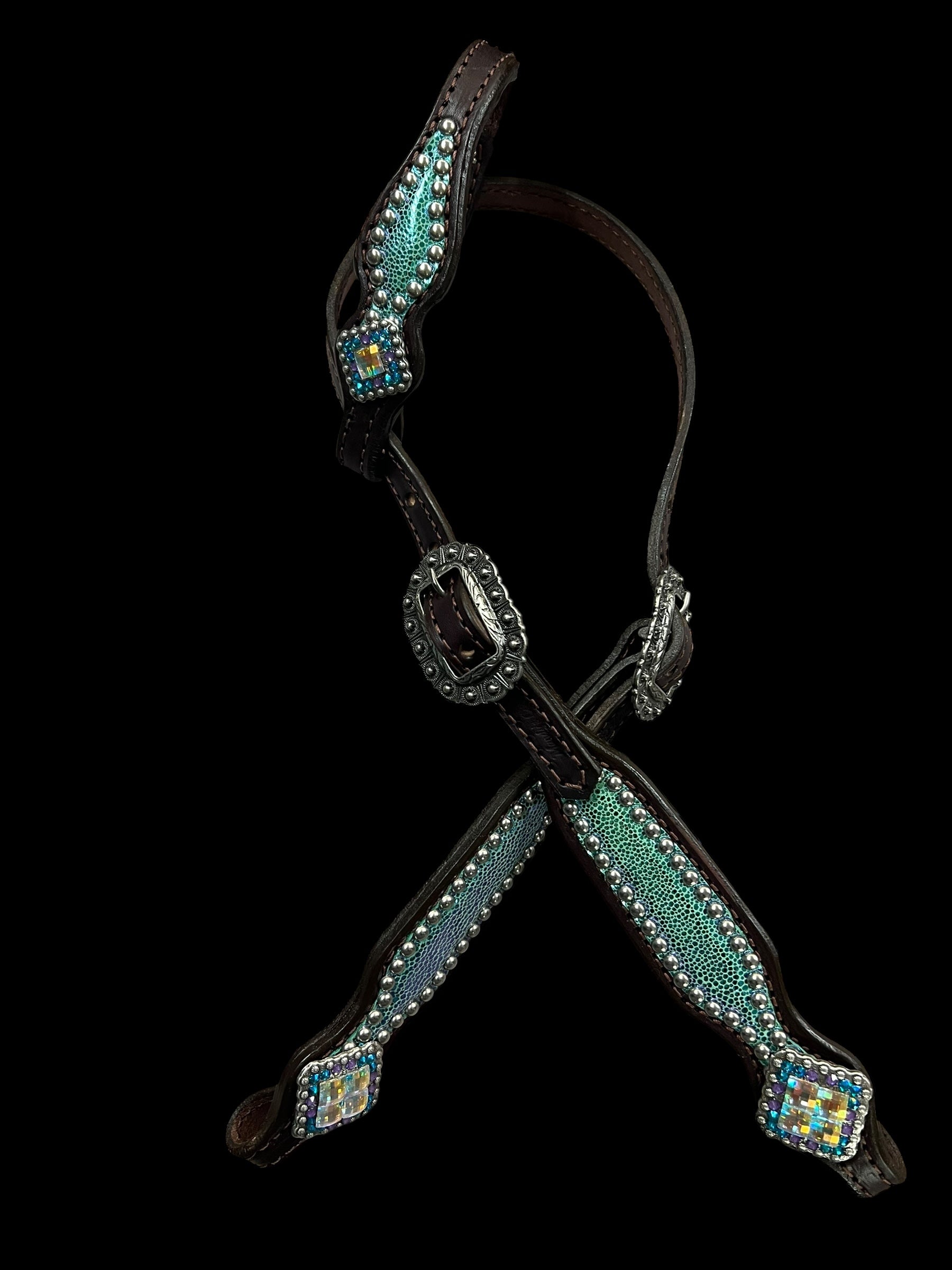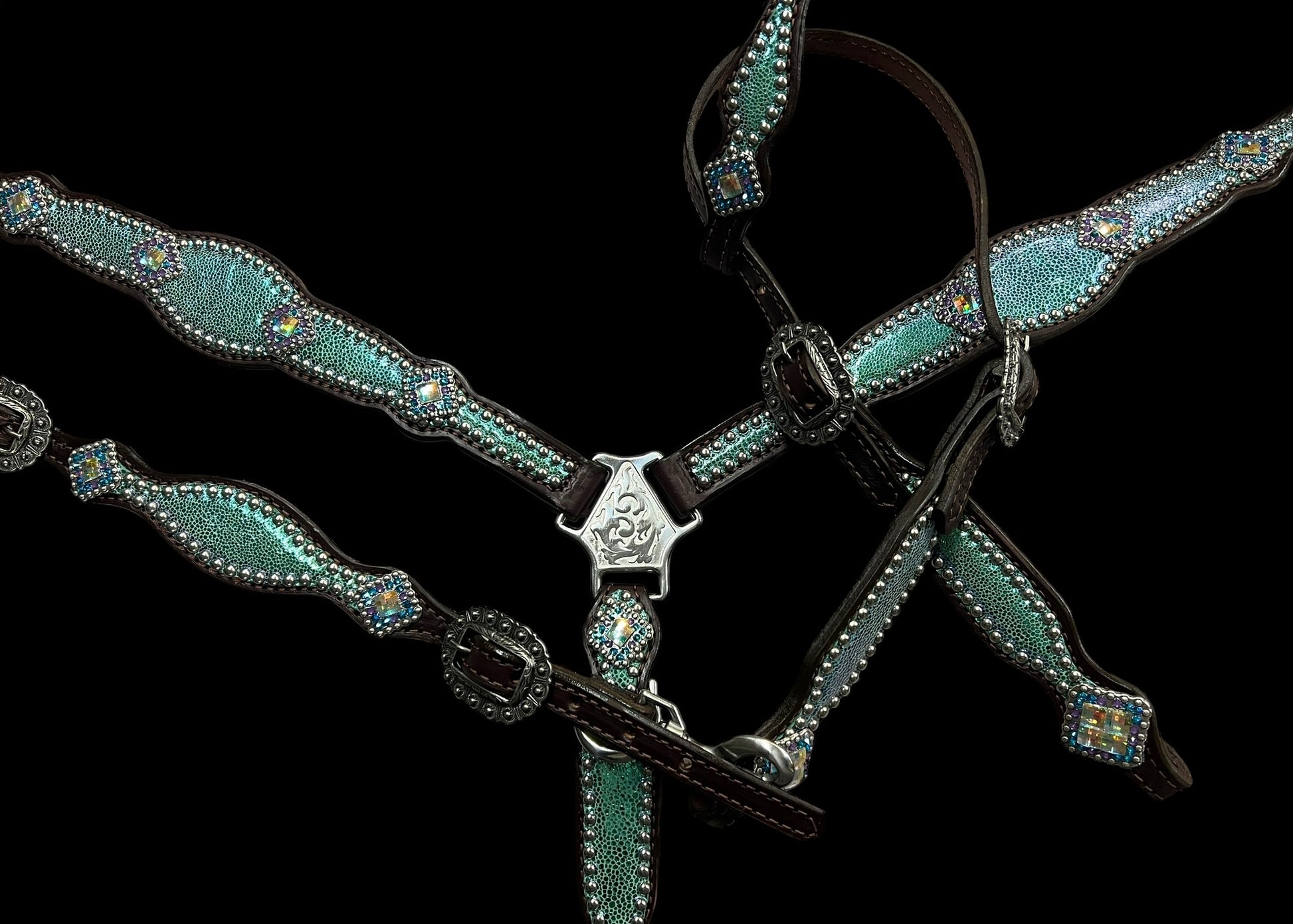 This ensemble features dark brown english bridle leather with mermaid glitter overlay, stainless spots, and conchos with genuine rhinestones.