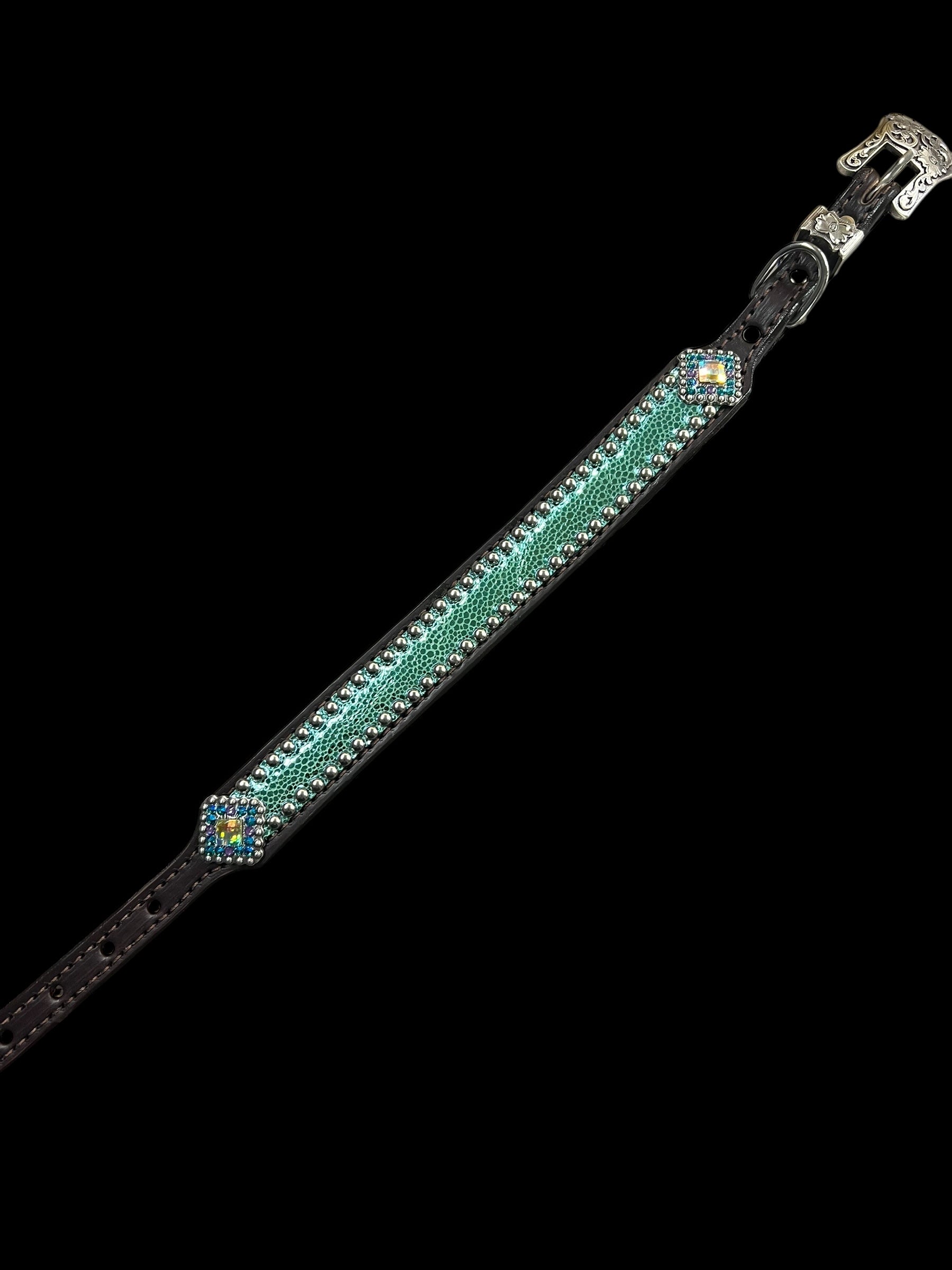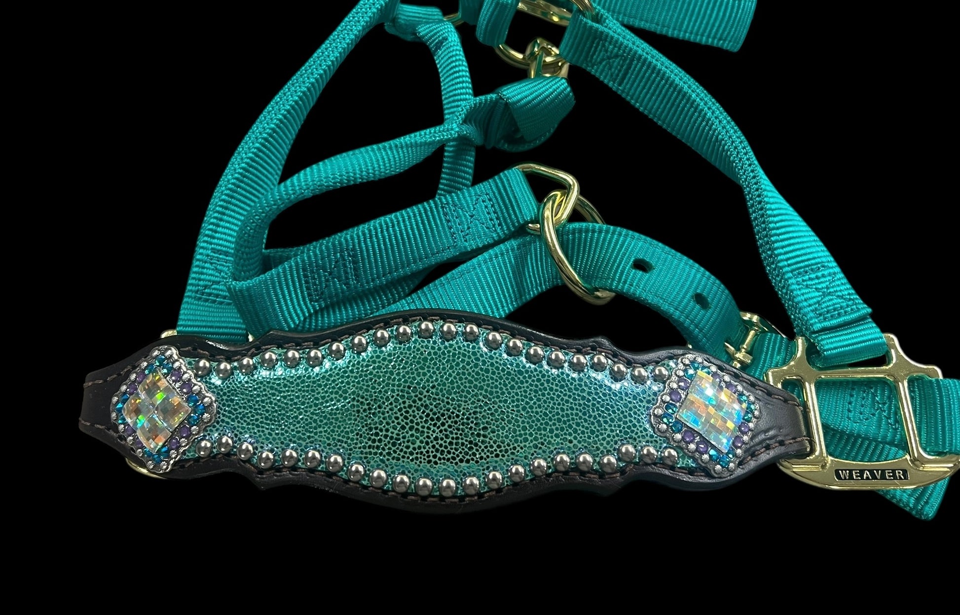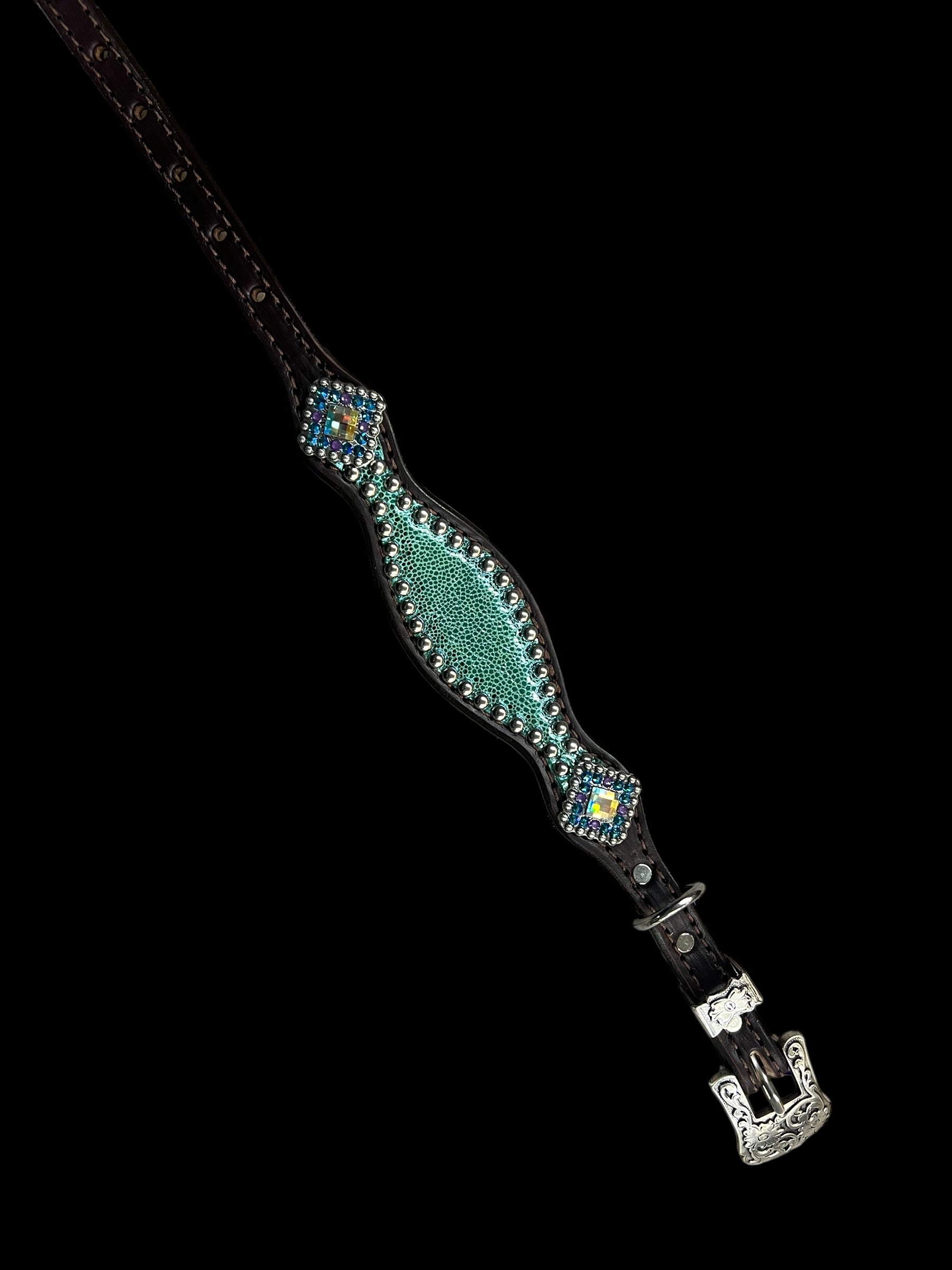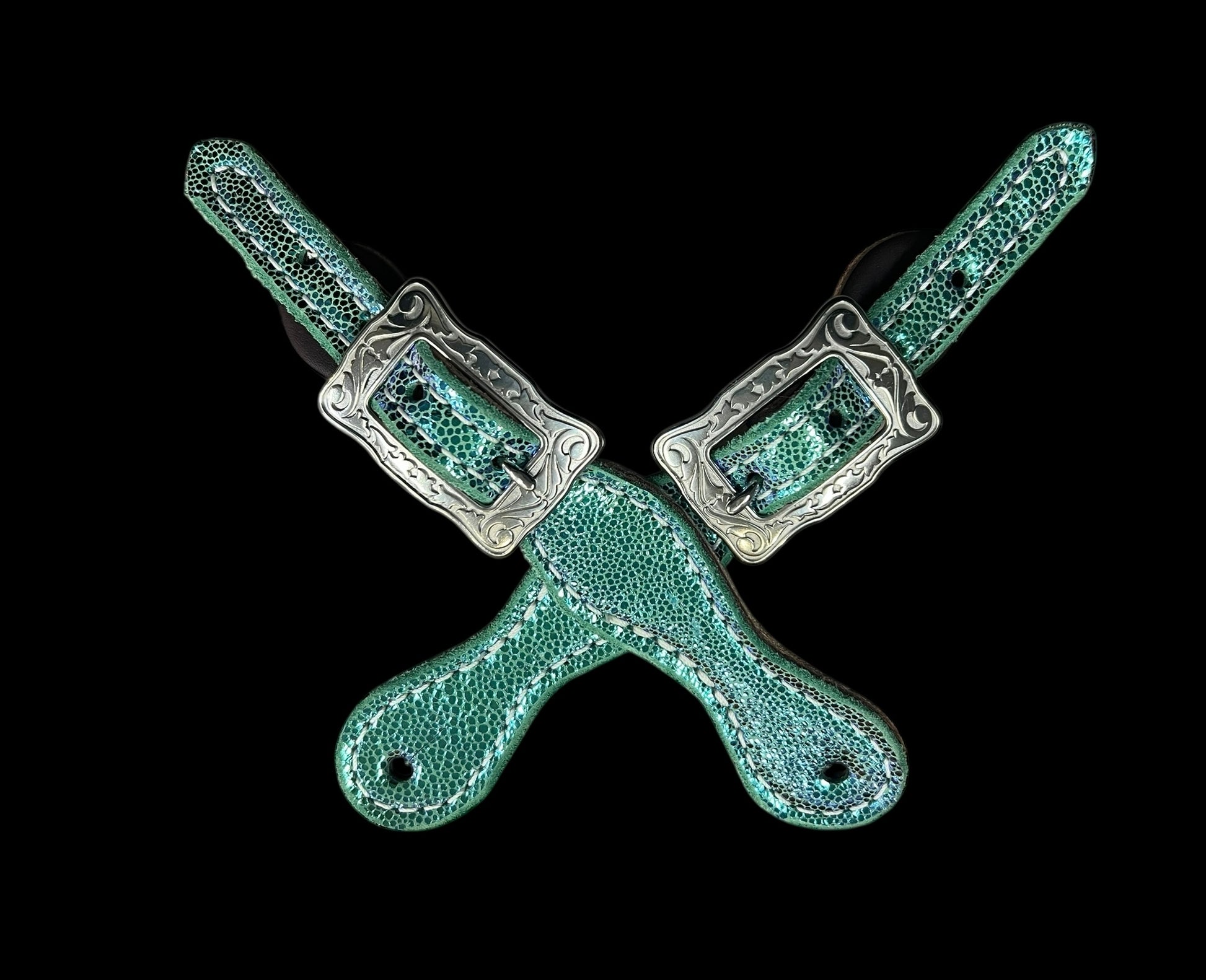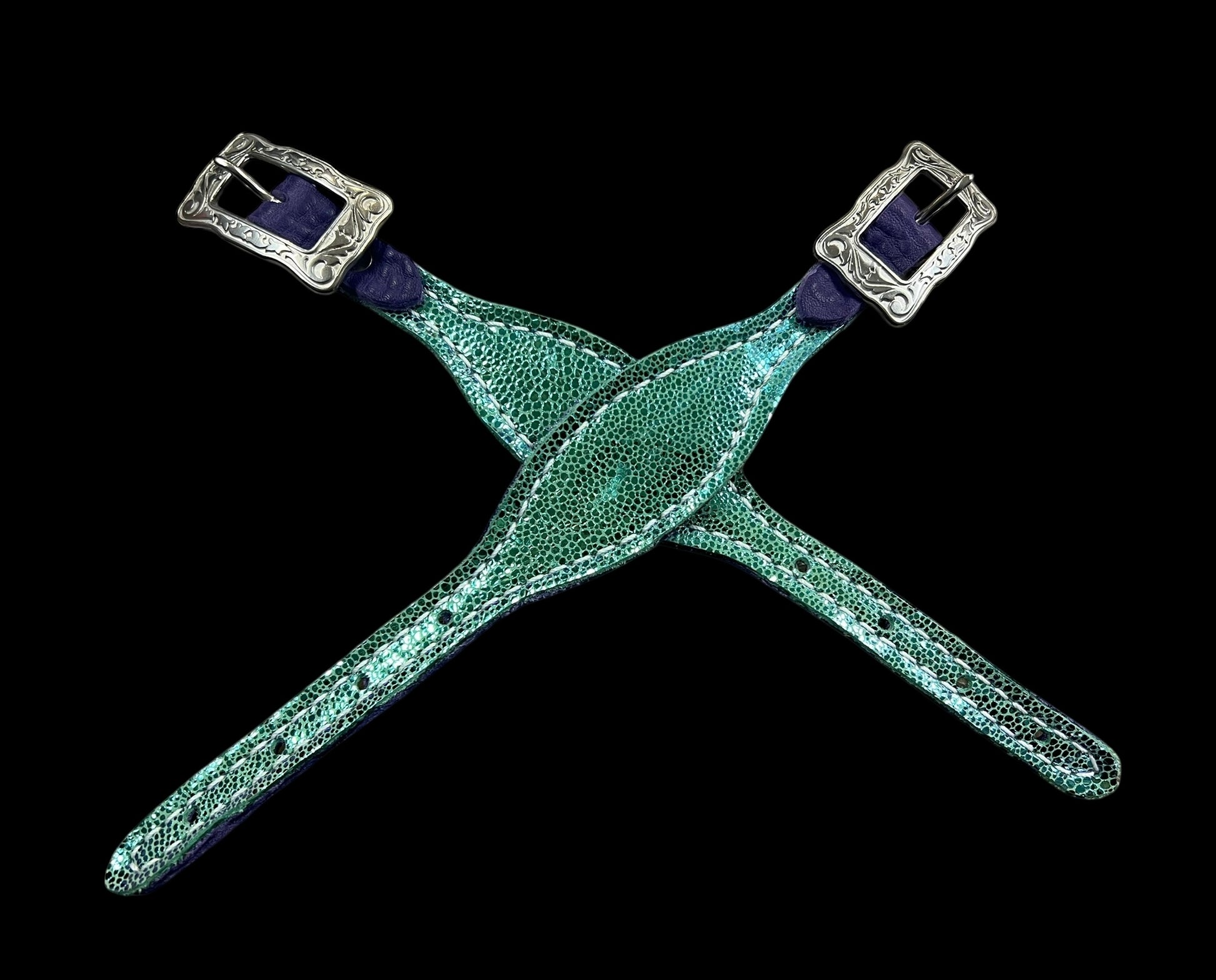 This ensemble features dark brown english bridle leather with mermaid glitter overlay, stainless spots, and conchos with genuine rhinestones.