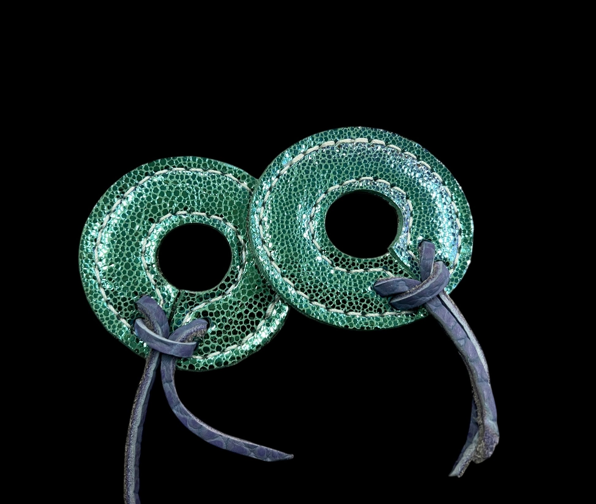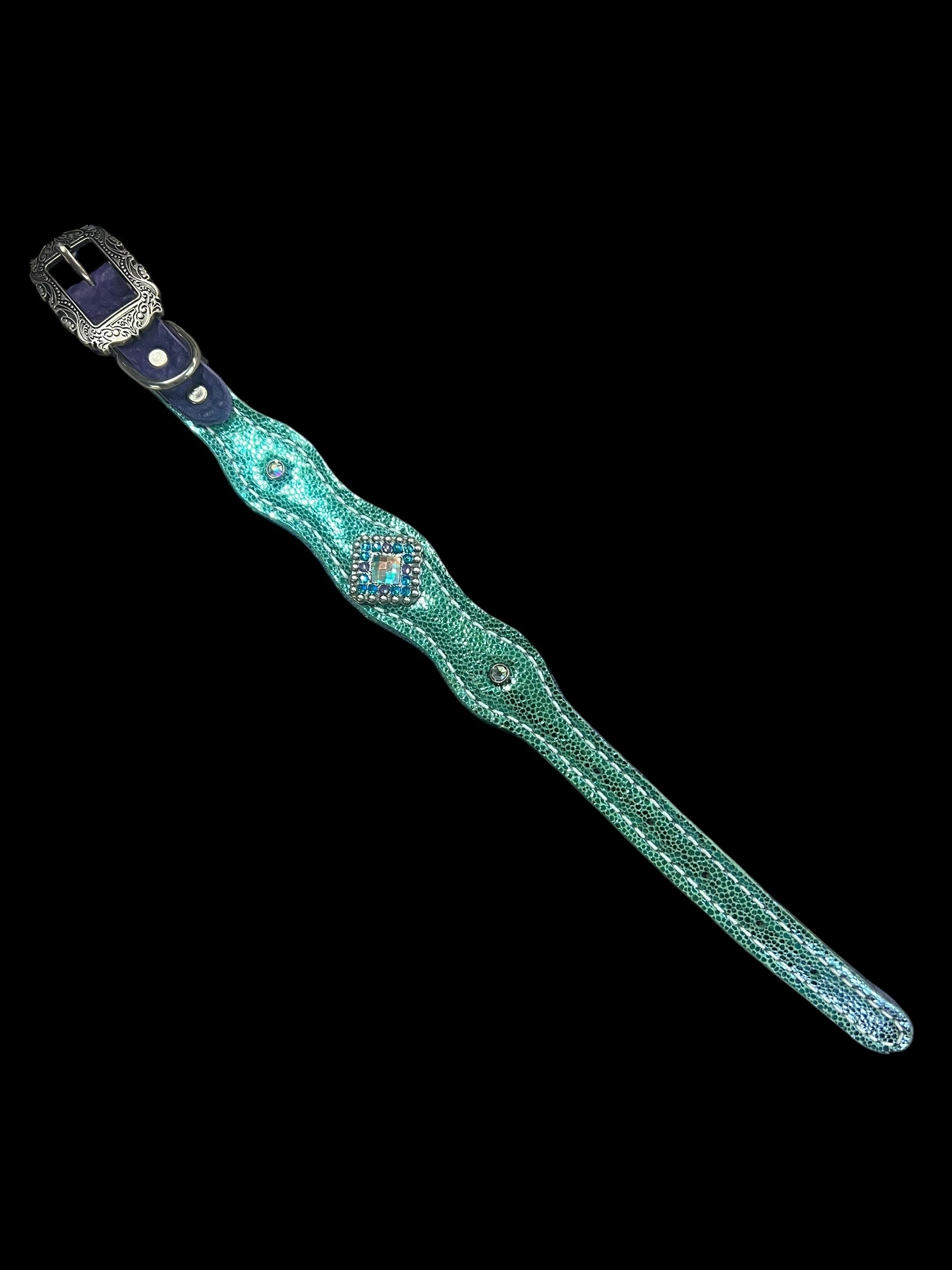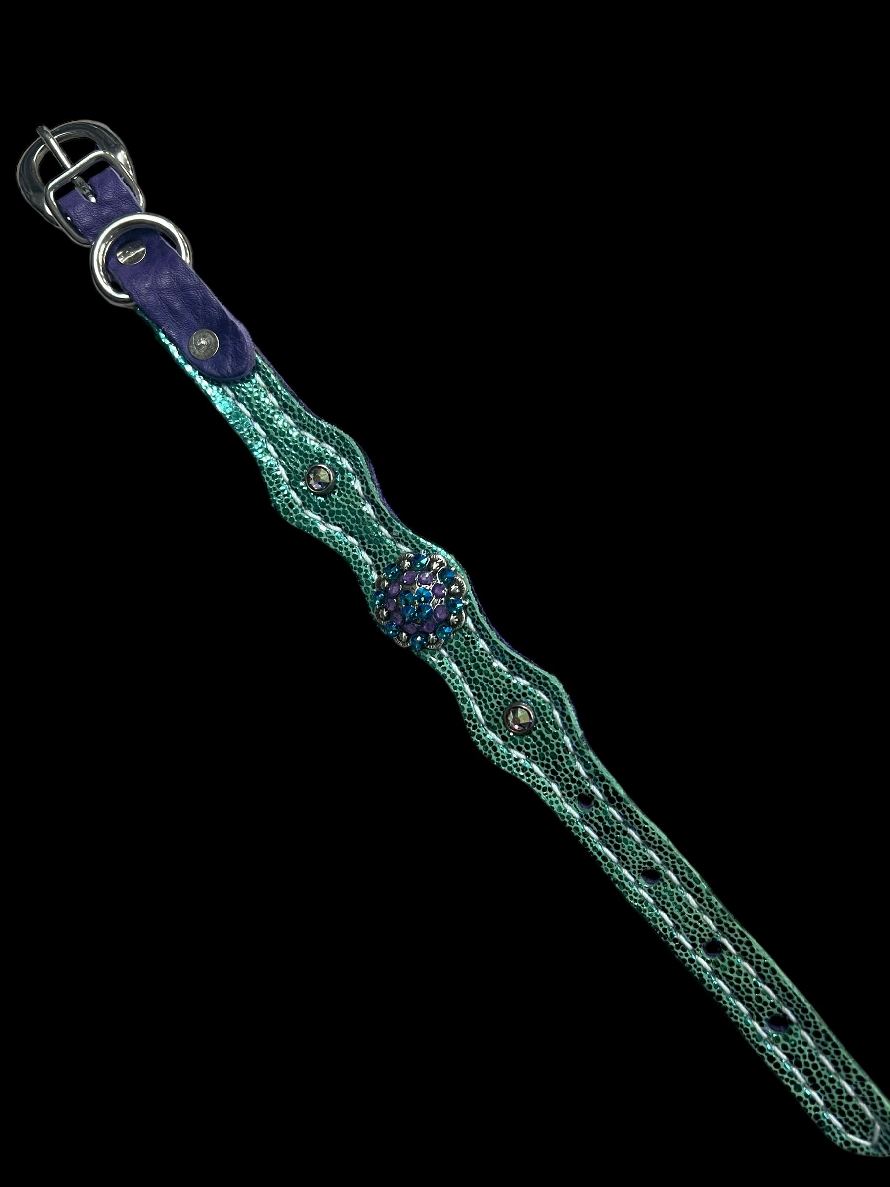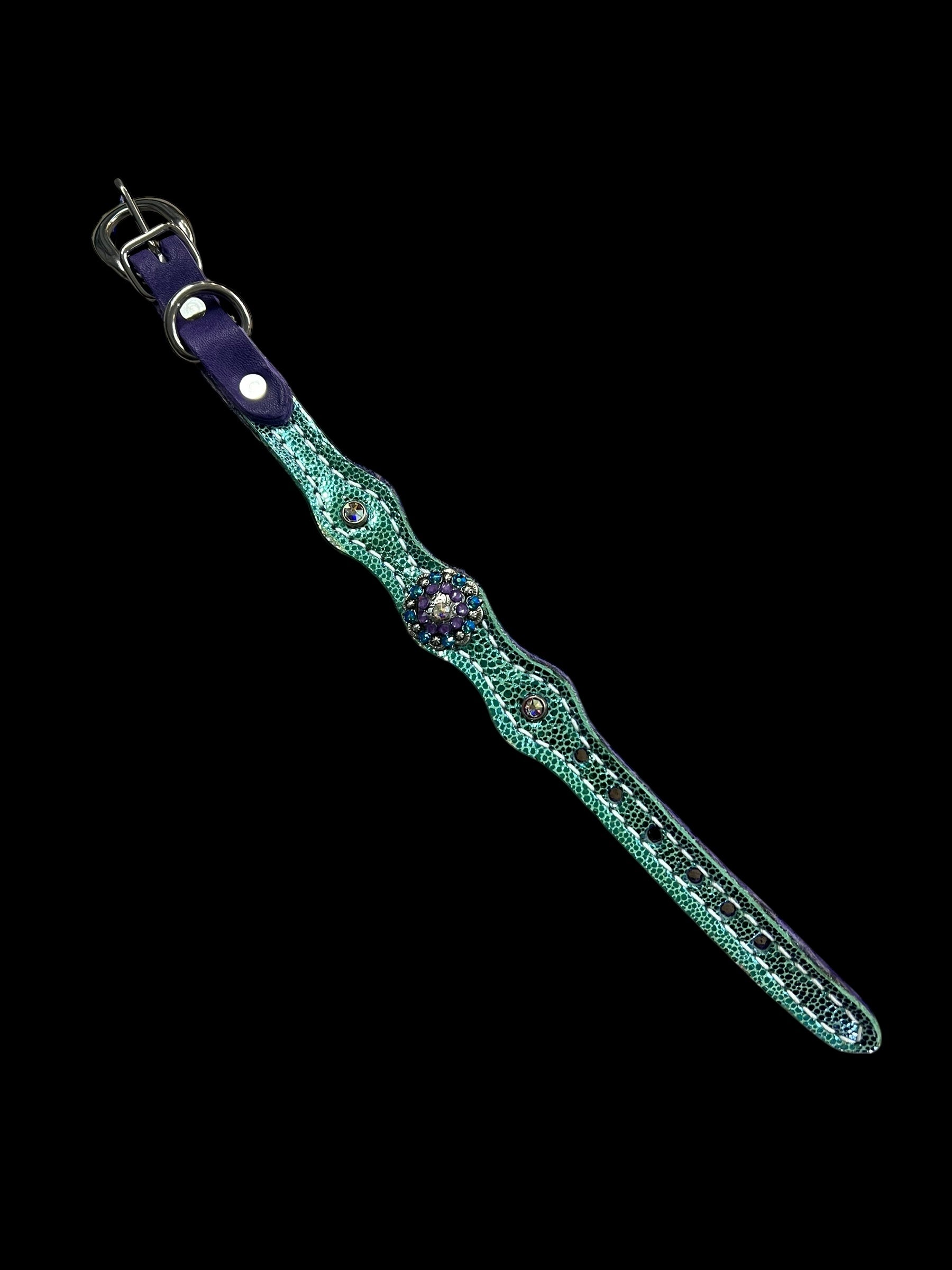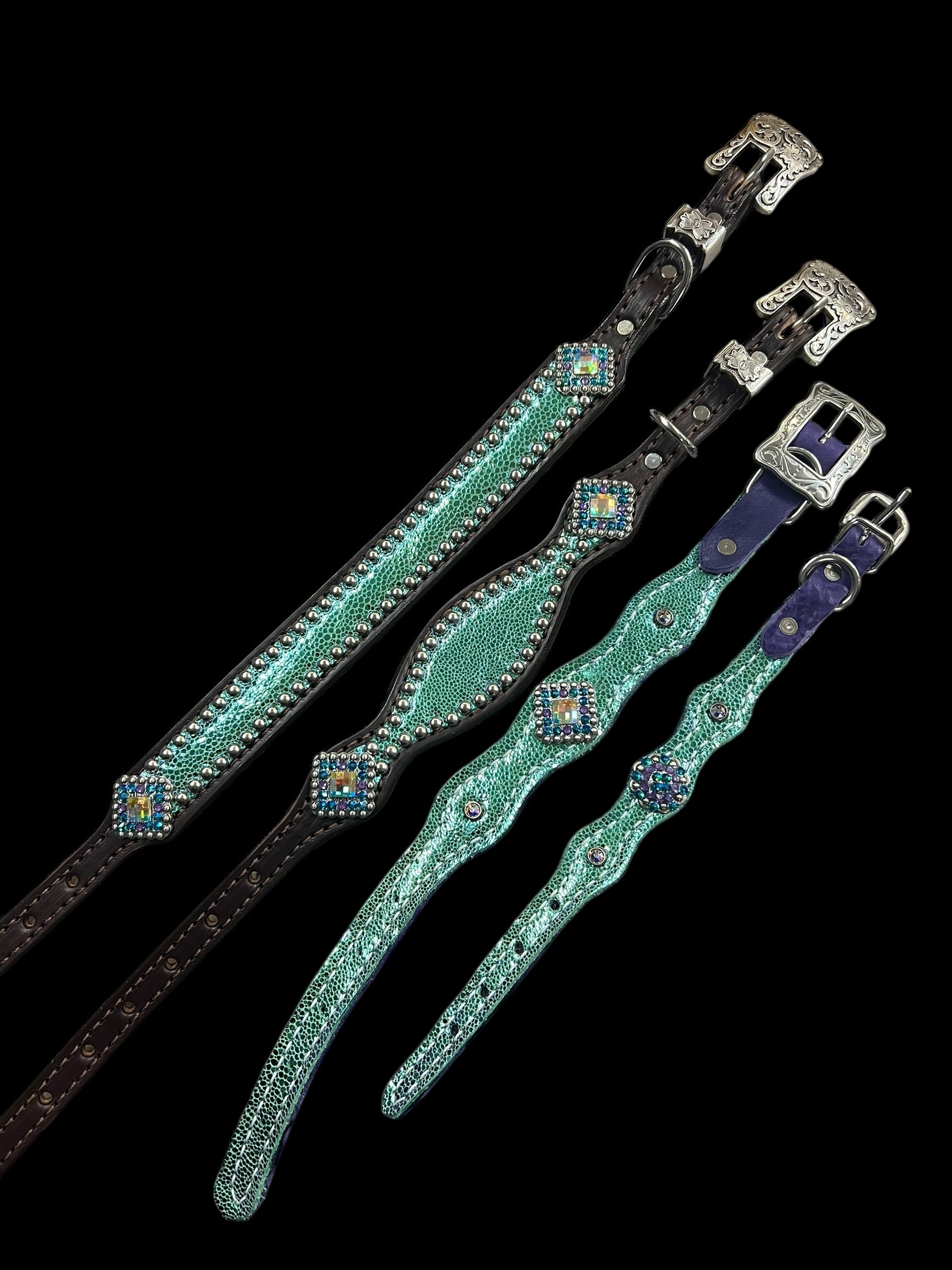 This ensemble features dark brown english bridle leather with mermaid glitter overlay, stainless spots, and conchos with genuine rhinestones.
