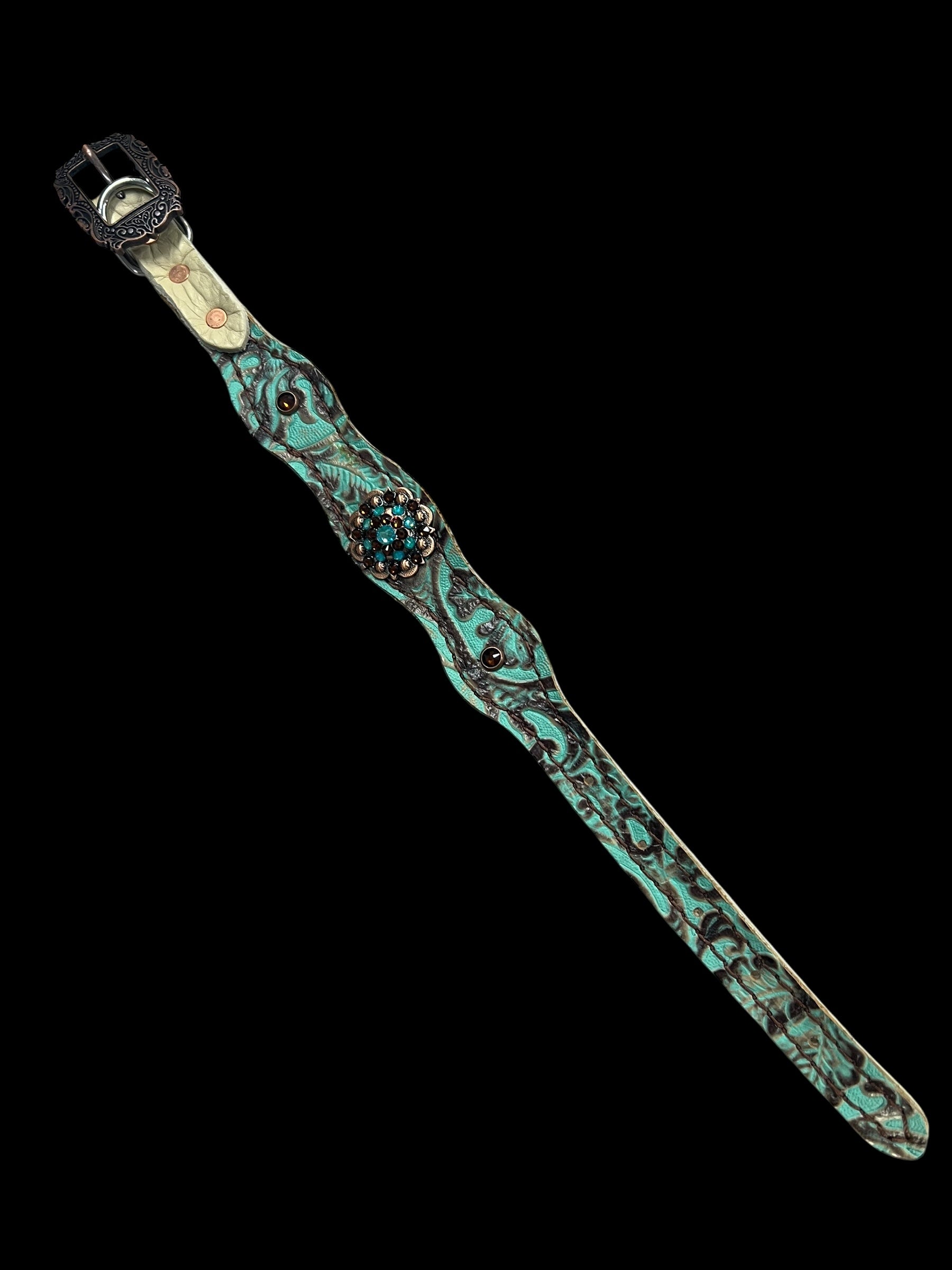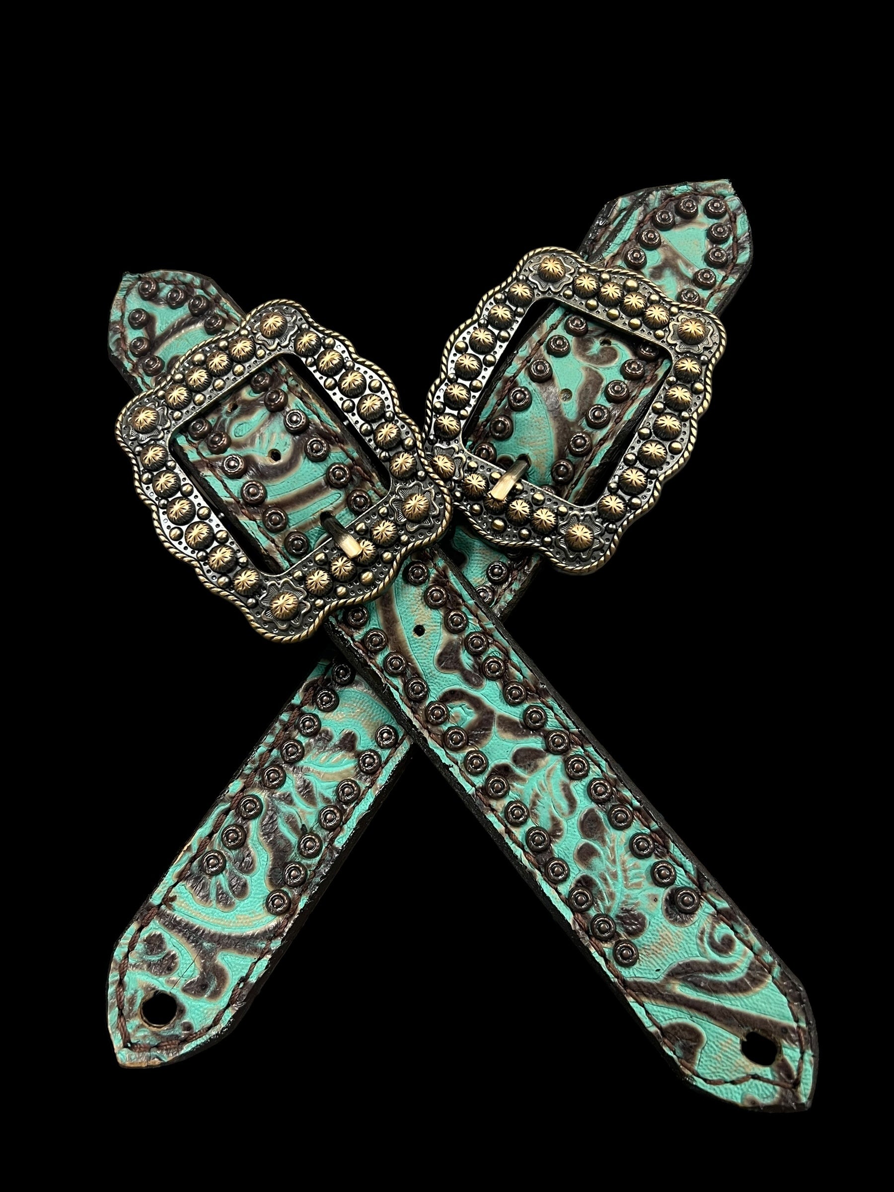 This ensemble features dark chocolate  english bridle leather with mint and brown floral embossed leather overlay, copper spots, and conchos with genuine rhinestones.