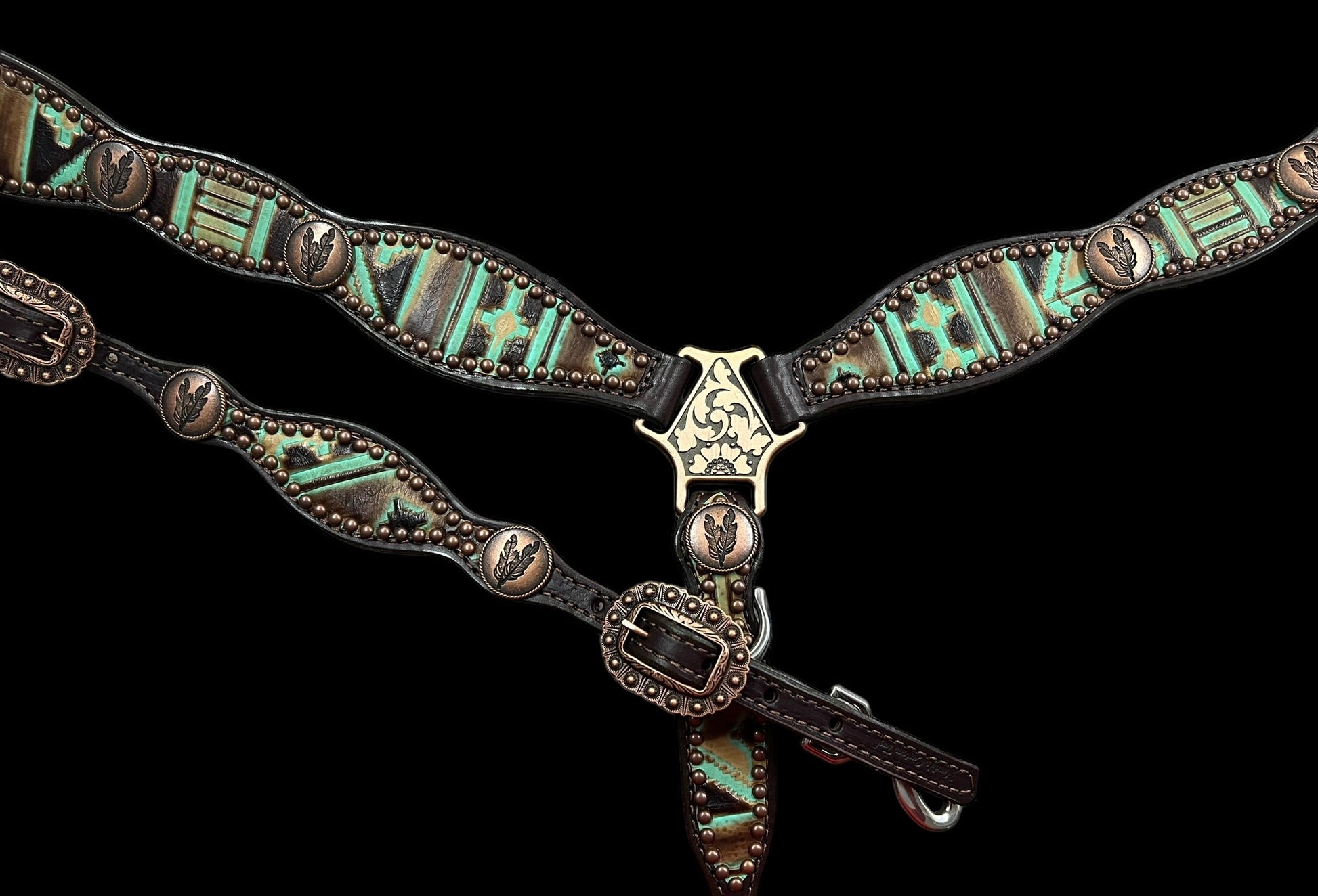 This ensemble features chocolate english bridle leather with mint and brown navajo embossed leather overlay, copper spots, and feather conchos