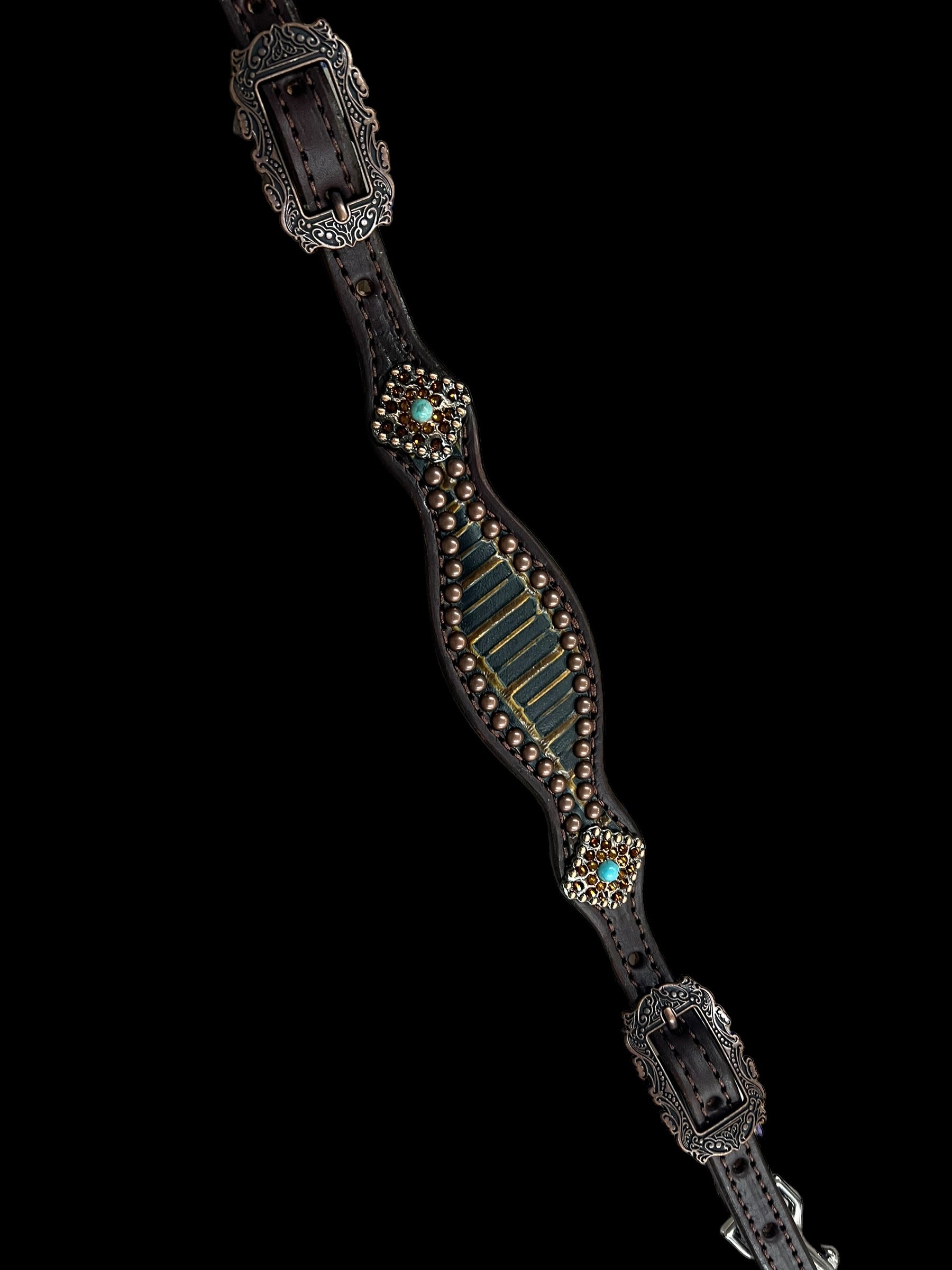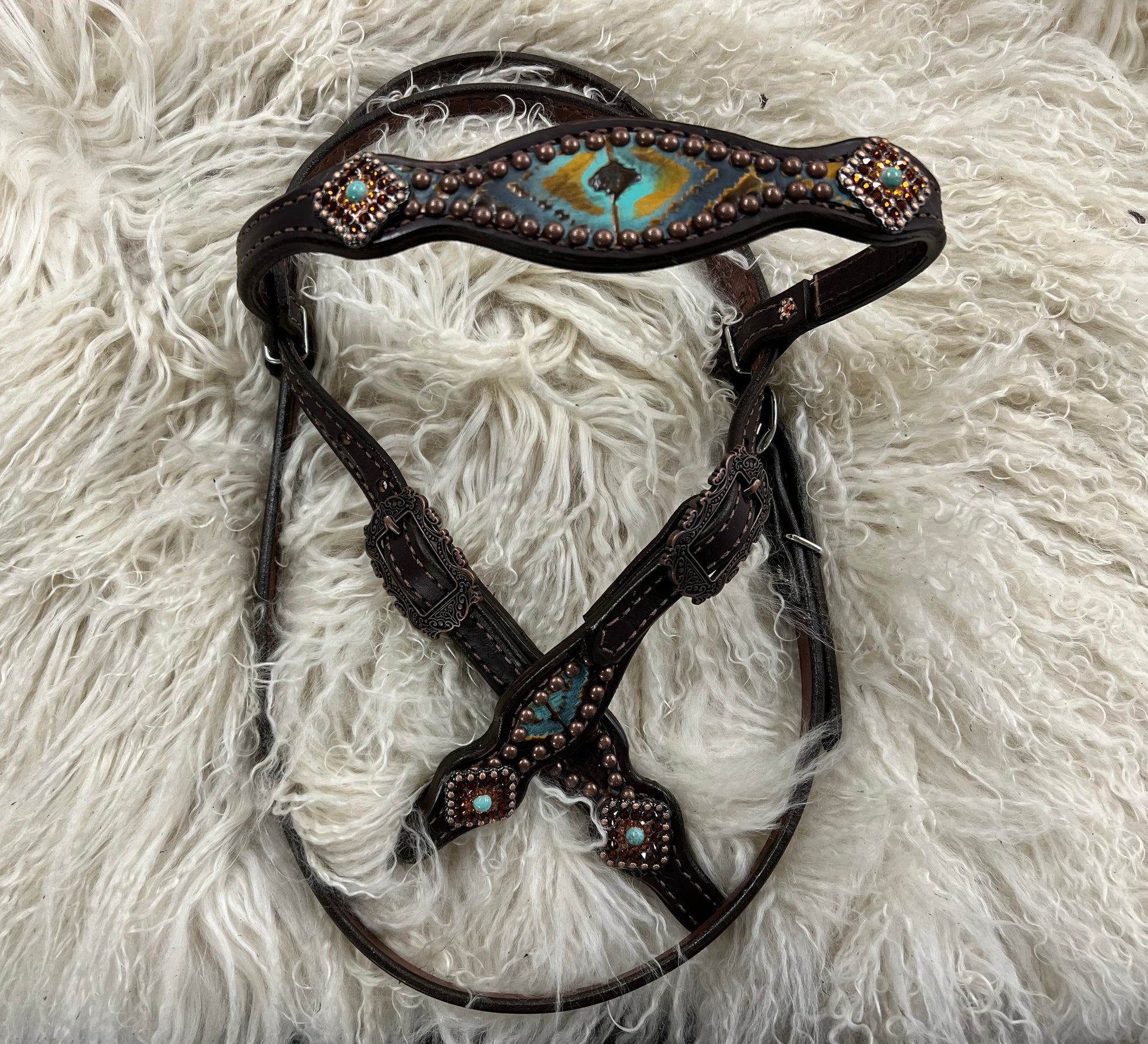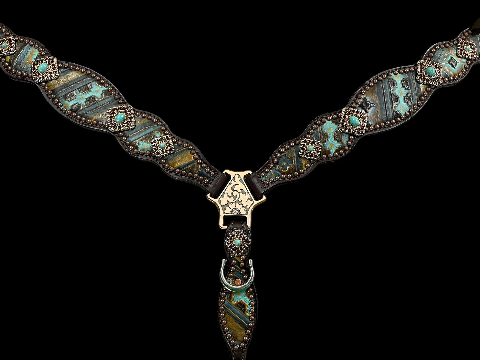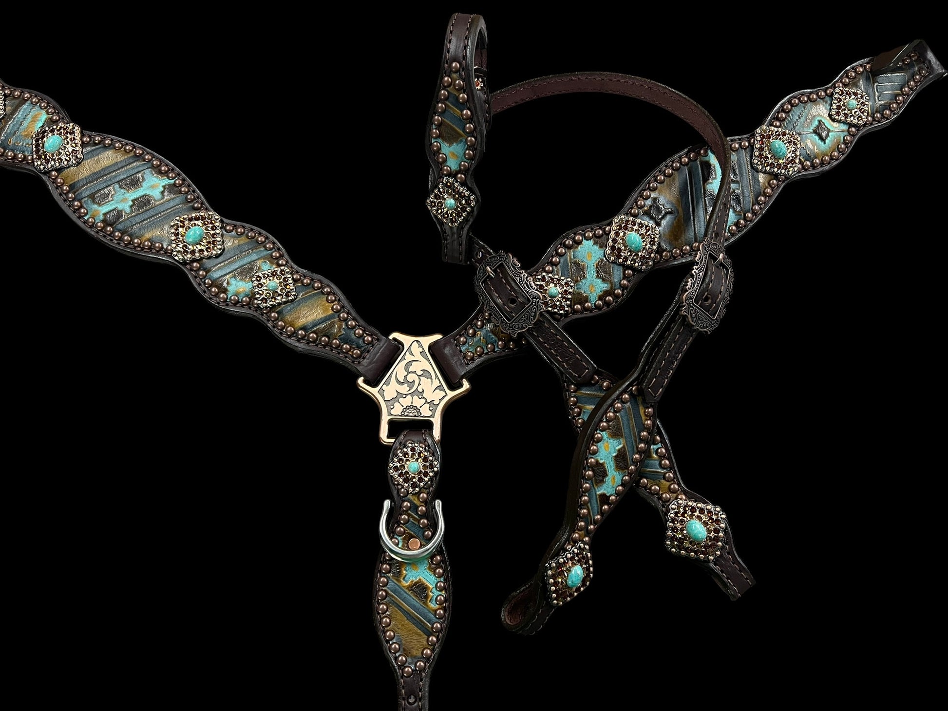 This ensemble features medium english bridle leather with aztec embossed overlay, stainless spots, and conchos with genuine rhinestones.