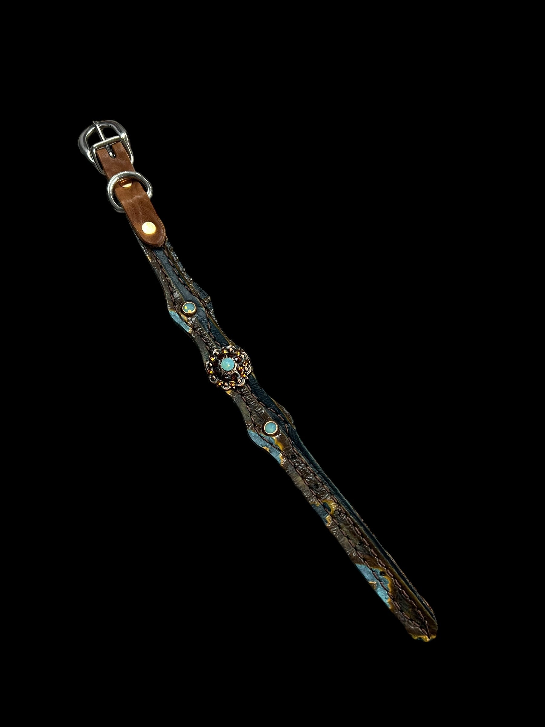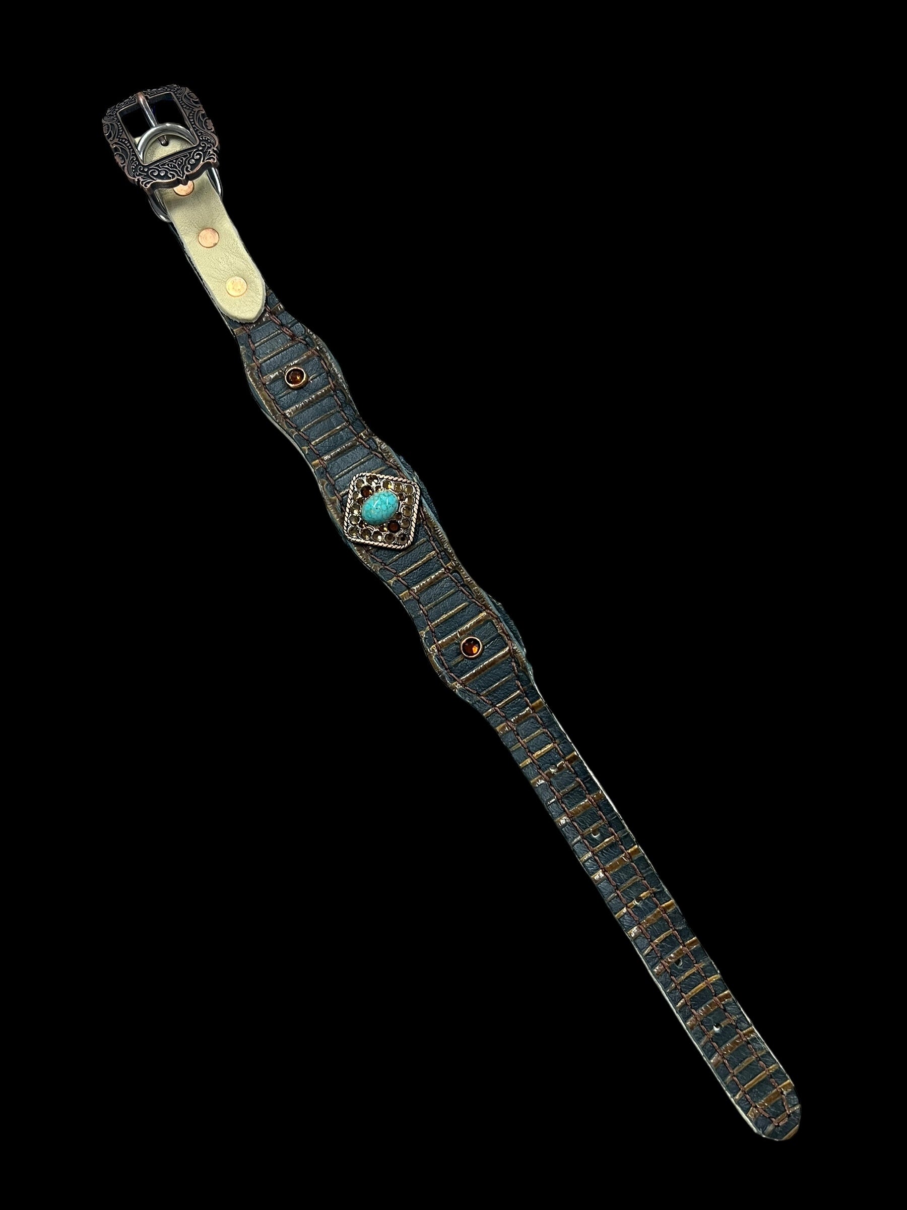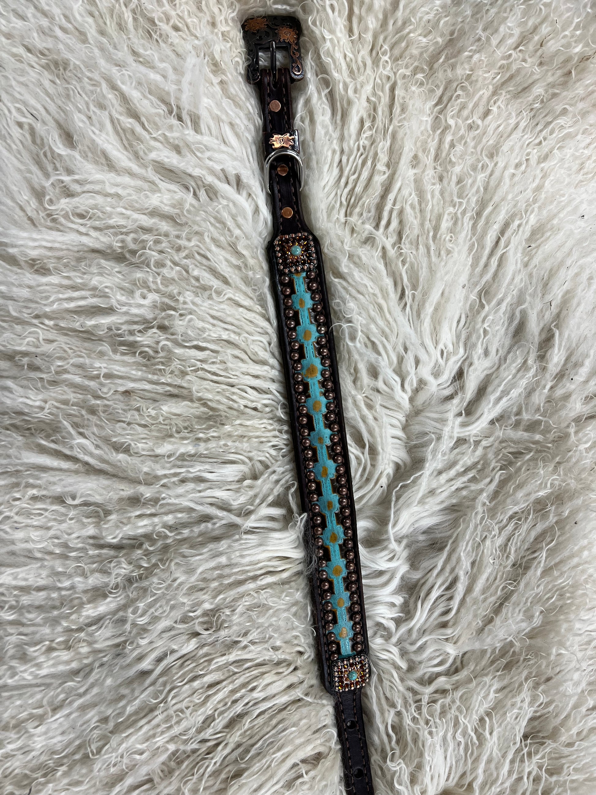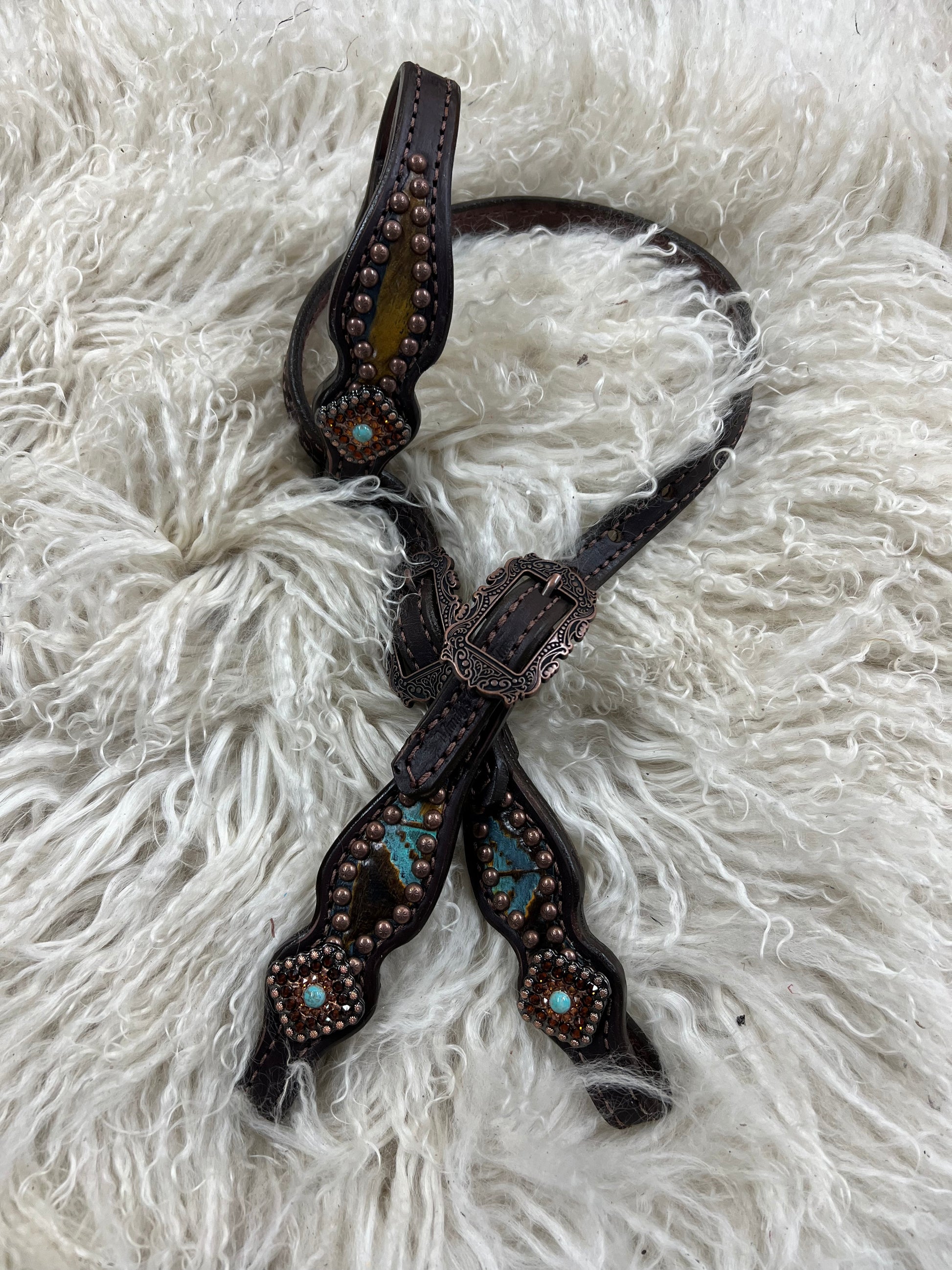 This ensemble features medium english bridle leather with aztec embossed overlay, stainless spots, and conchos with genuine rhinestones.