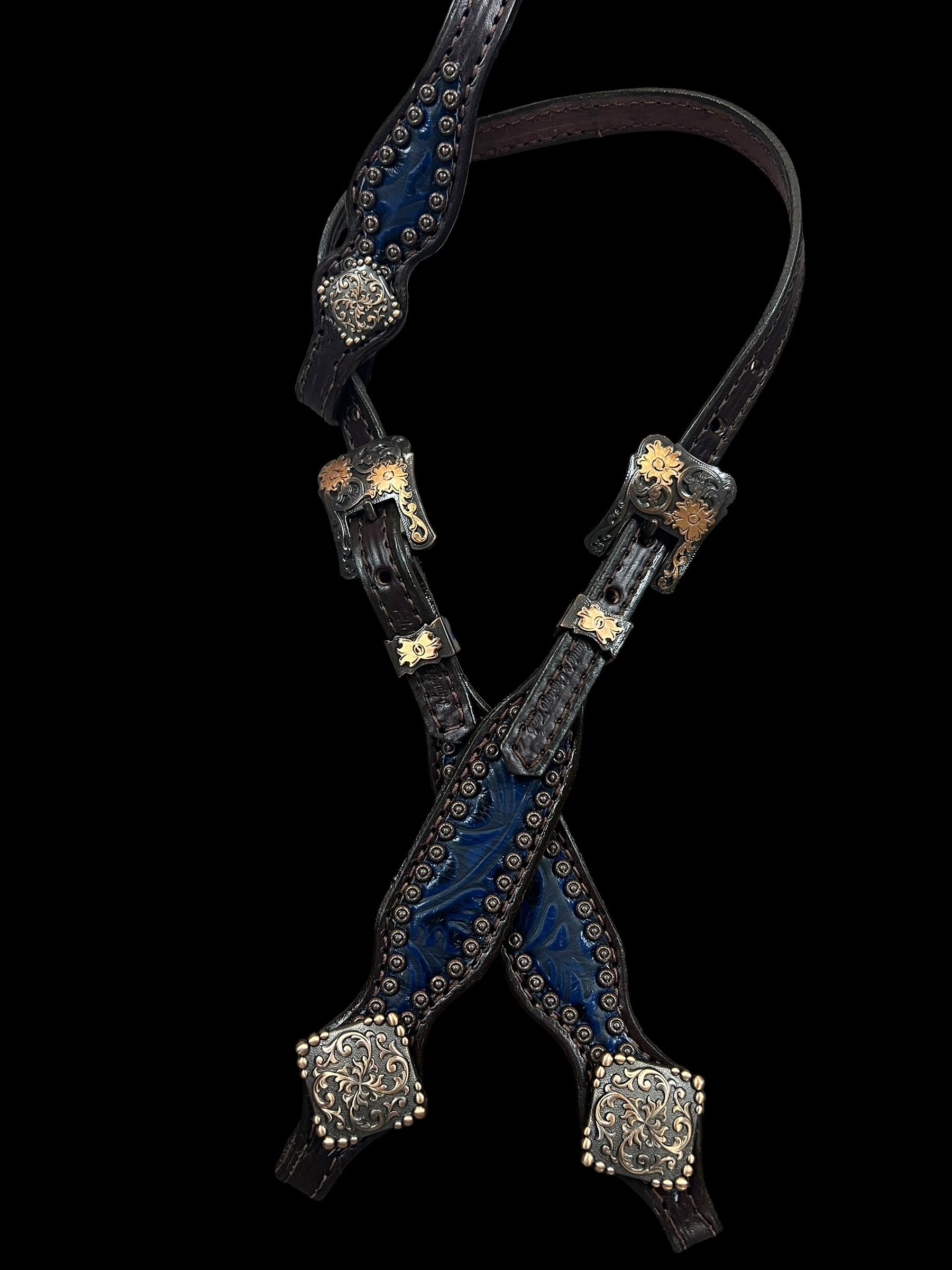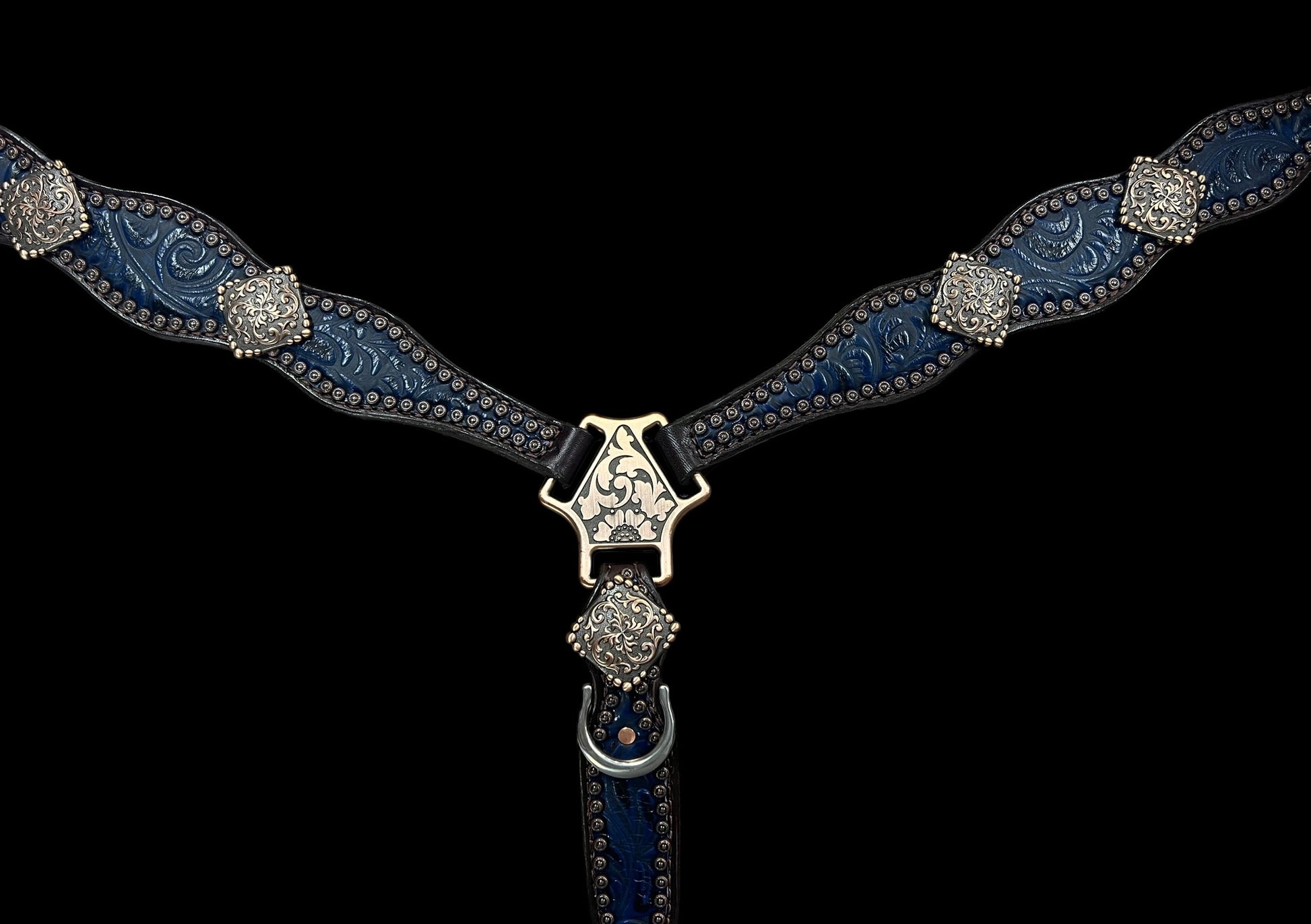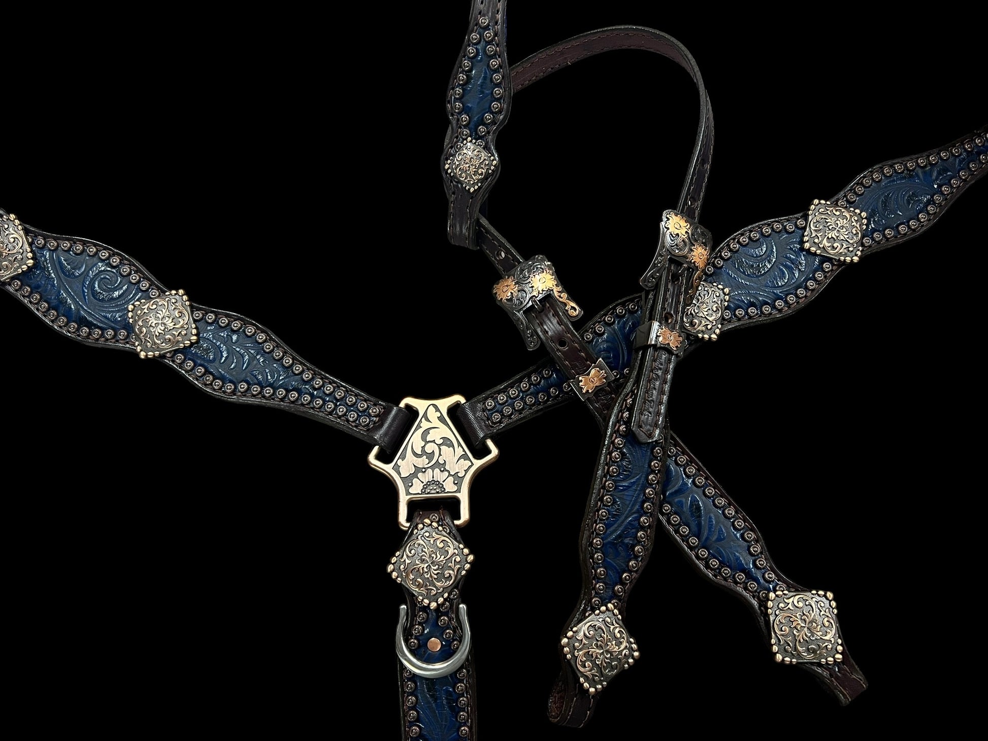 This ensemble features chocolate english bridle leather with navy floral embossed leather overlay, copper spots, and copper conchos
