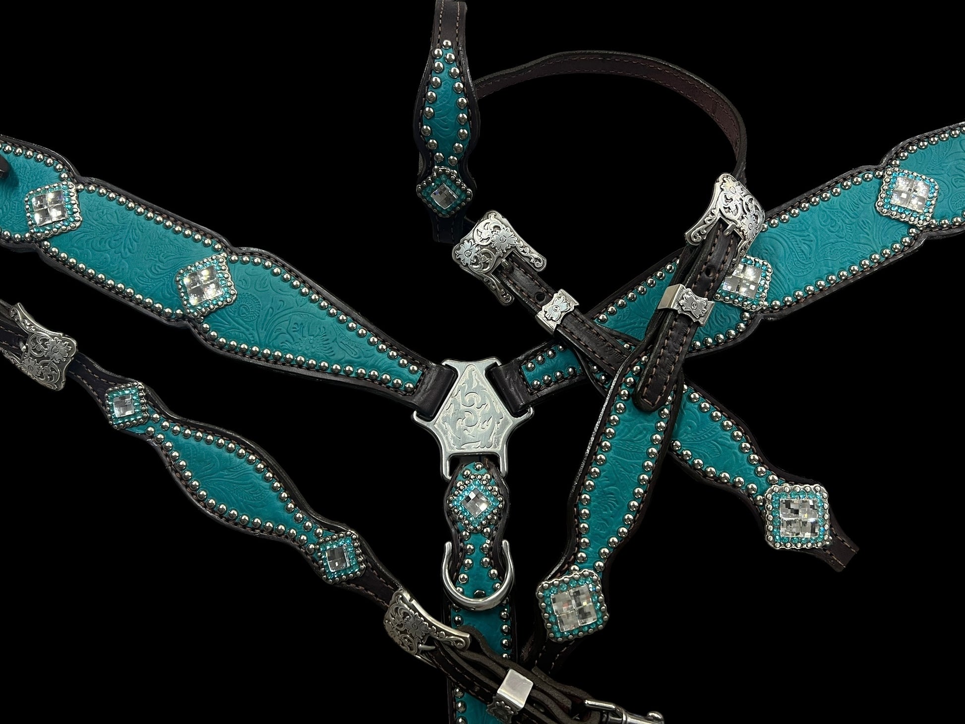 This ensemble features chocolate english bridle leather with teal floral embossed leather overlay, stainless spots, and conchos with Swarovski rhinestones.