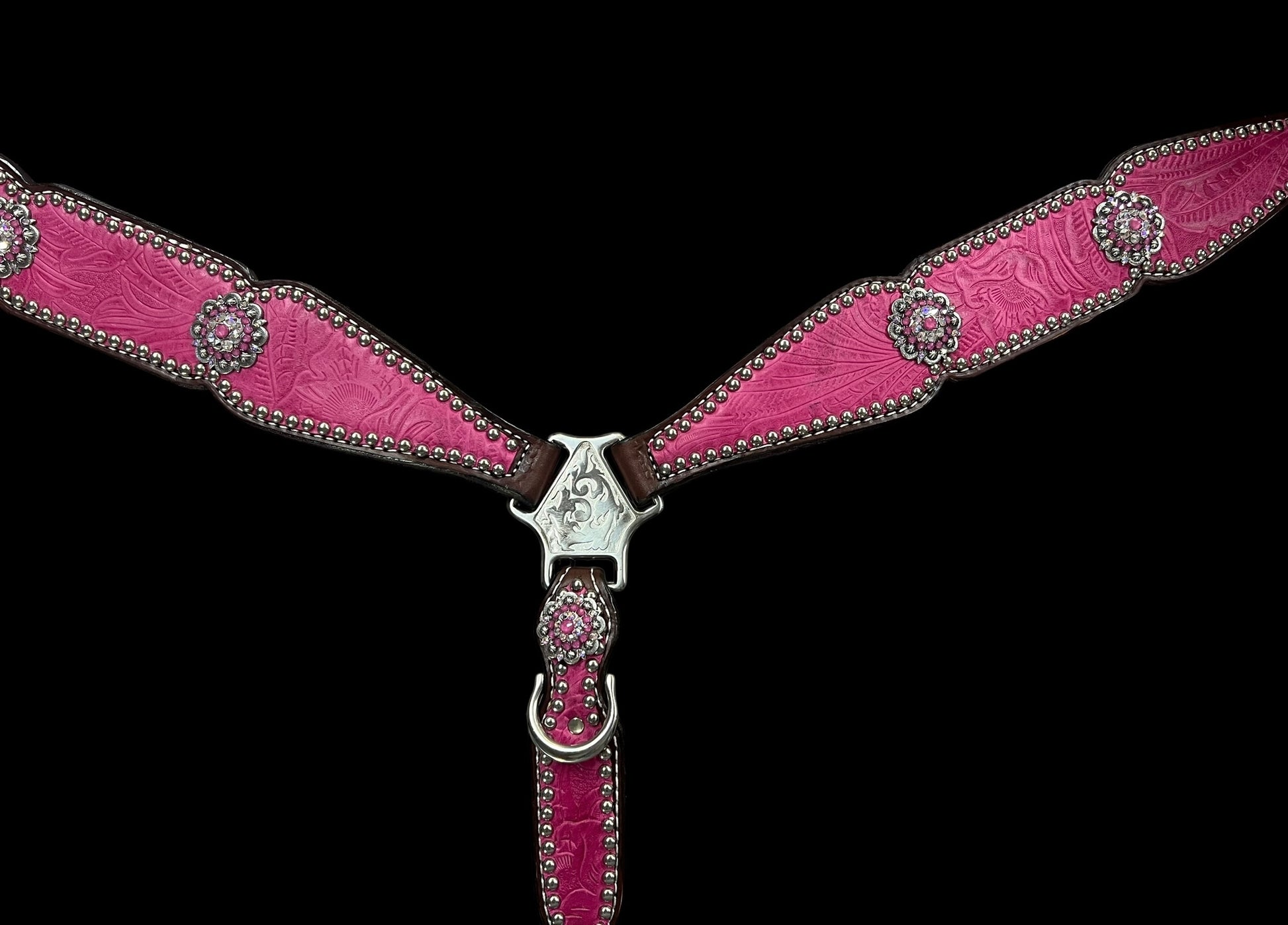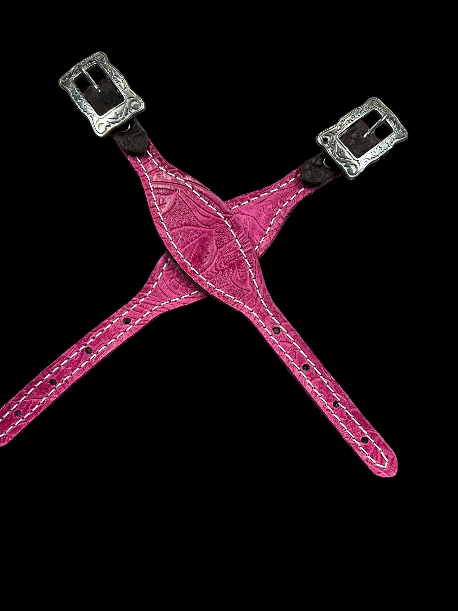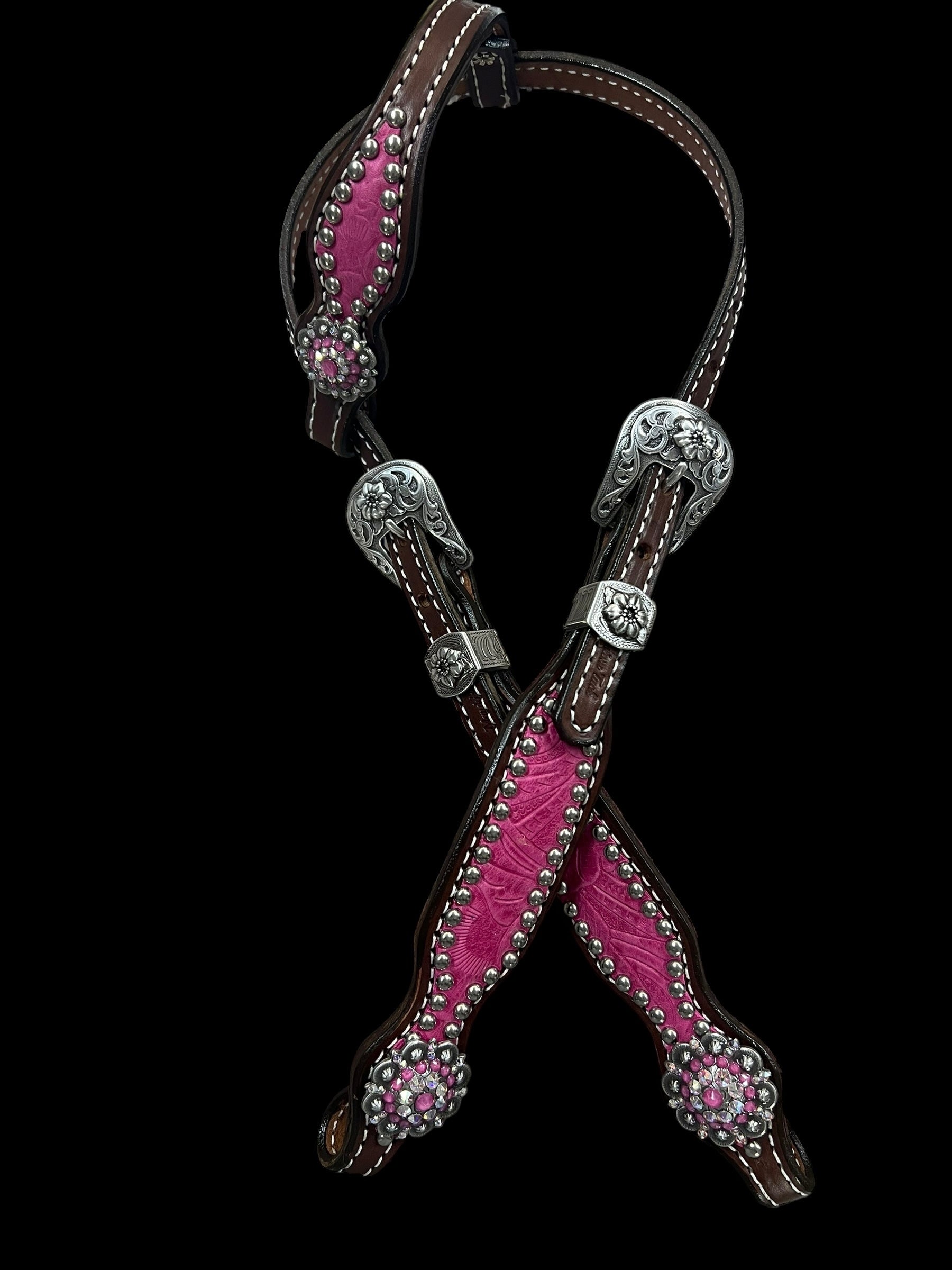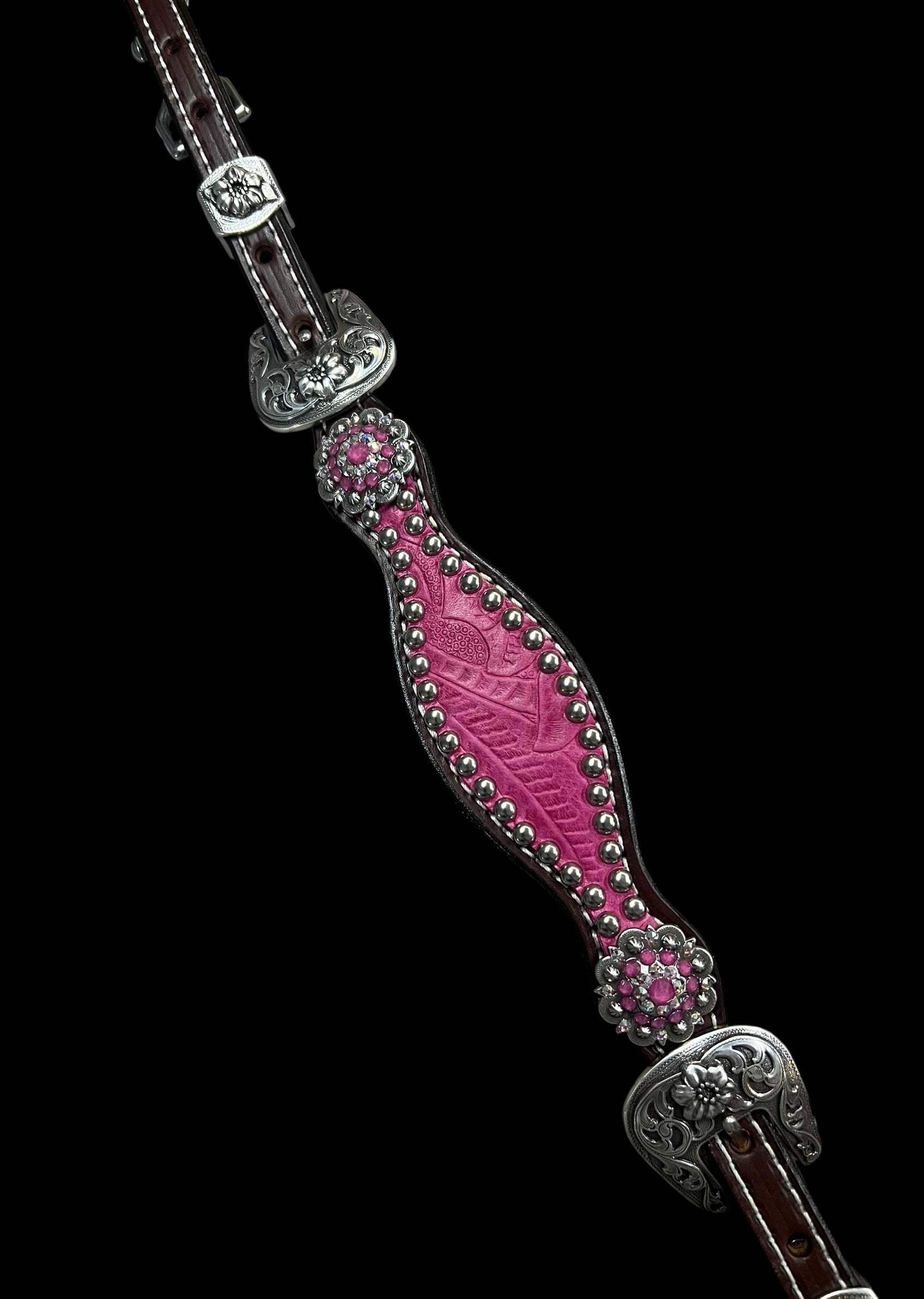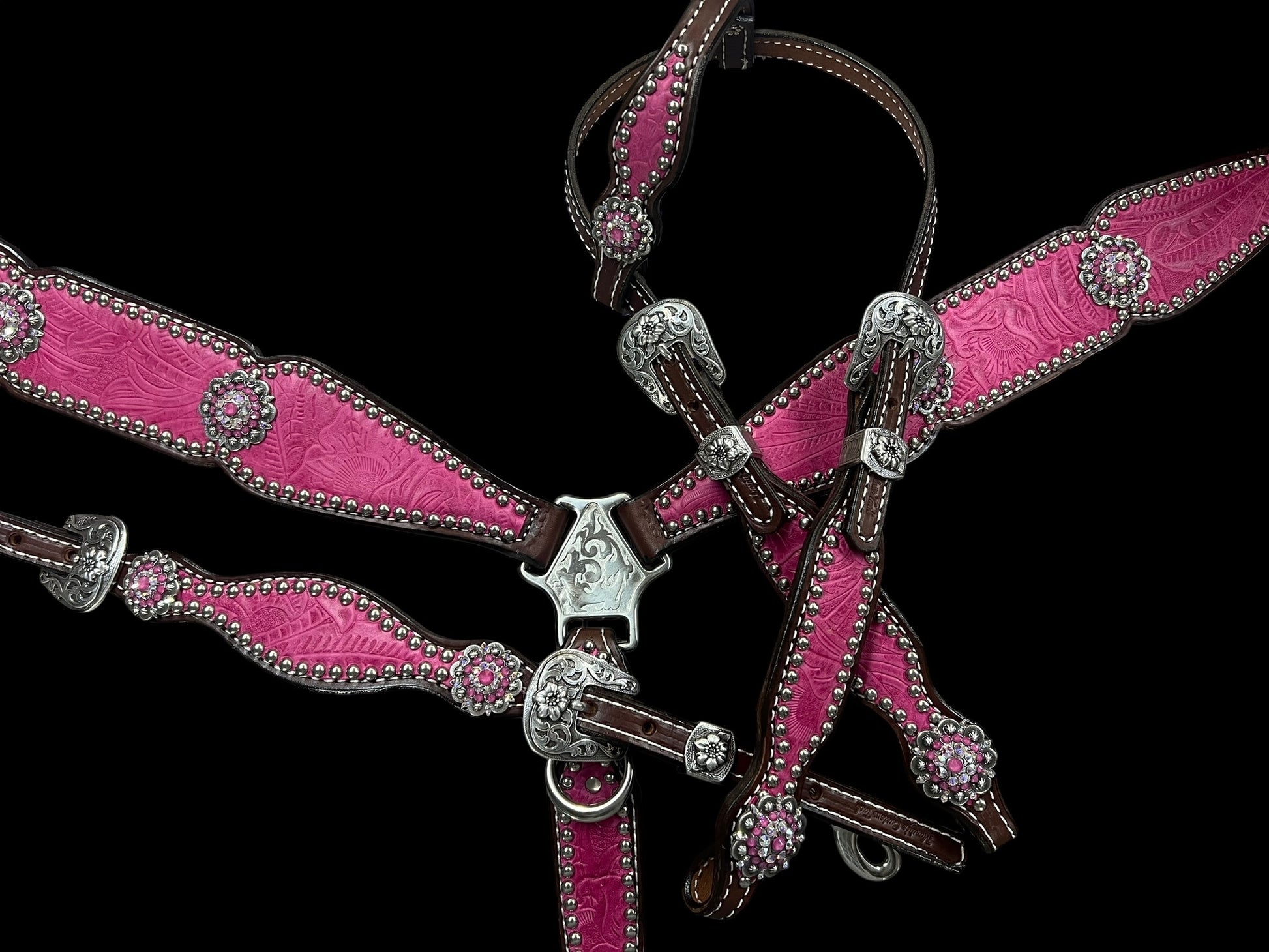This ensemble features walnut english bridle leather with pink dallas floral embossed leather overlay, stainless spots, and conchos with genuine rhinestones.