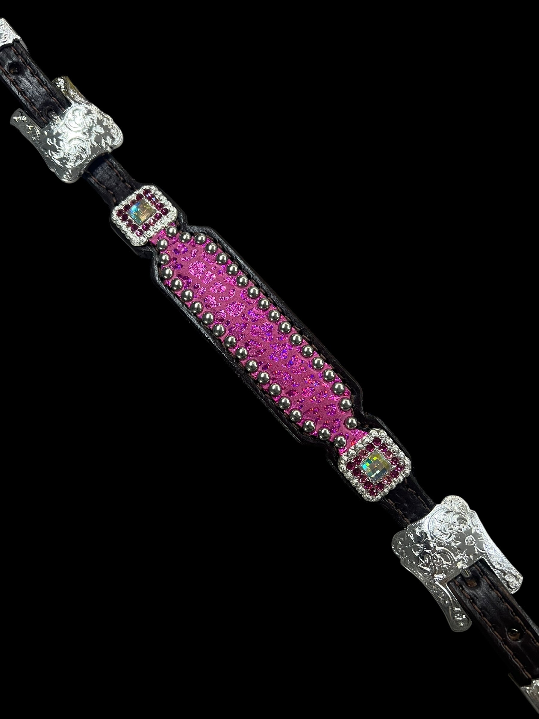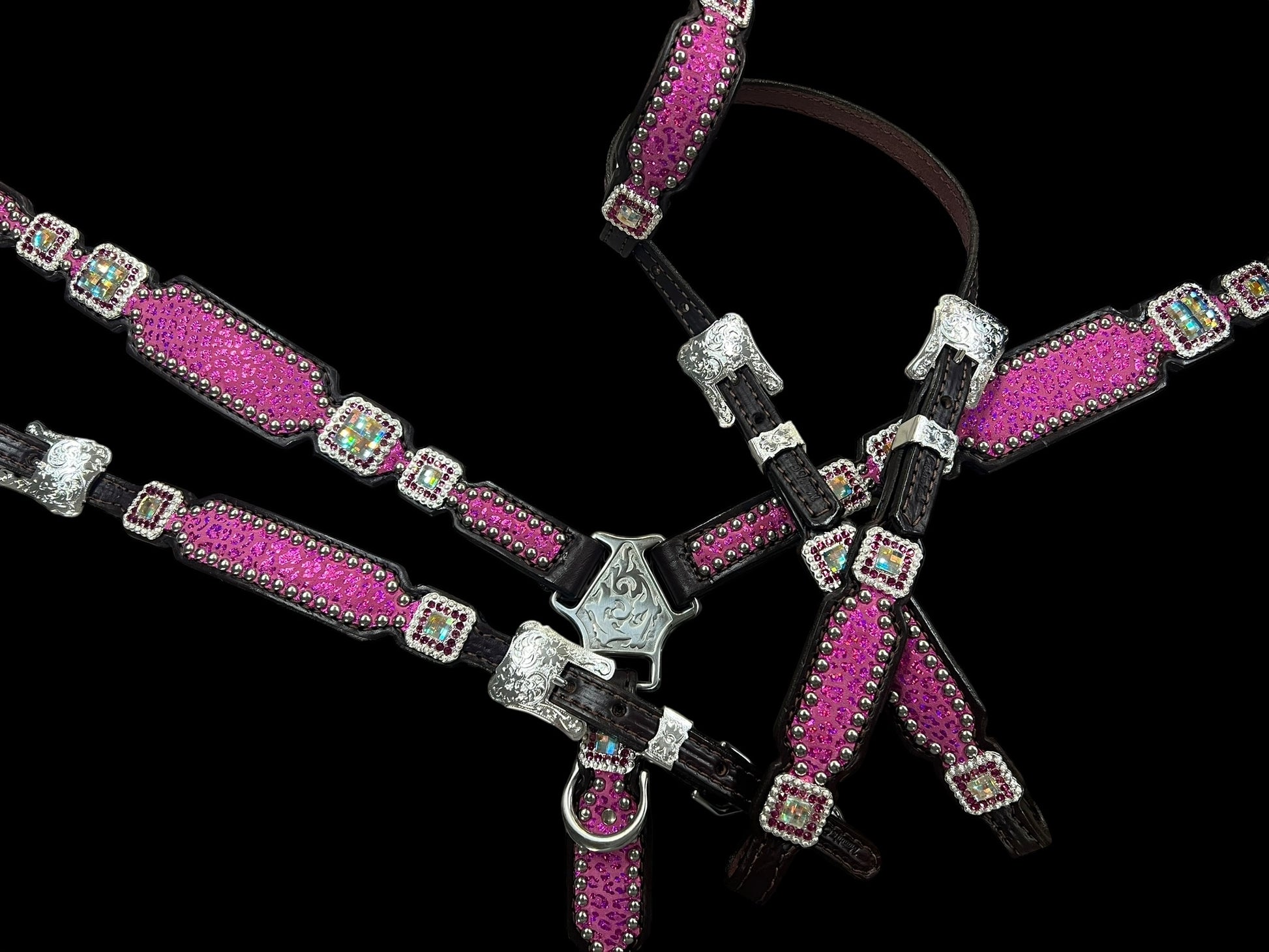 This ensemble features dark english bridle leather with metallic pink leopard print leather overlay, stainless spots, and conchos with genuine rhinestones.