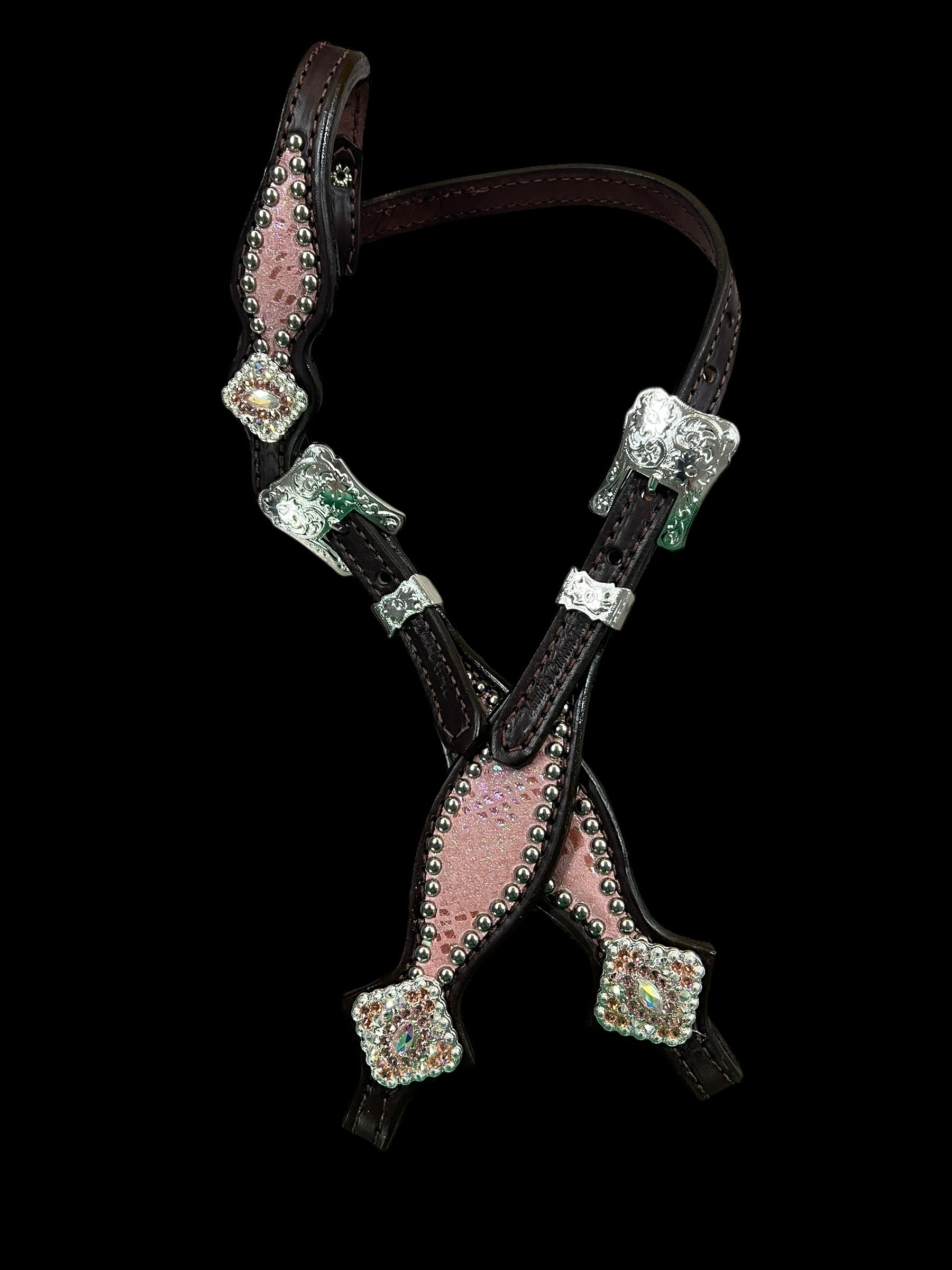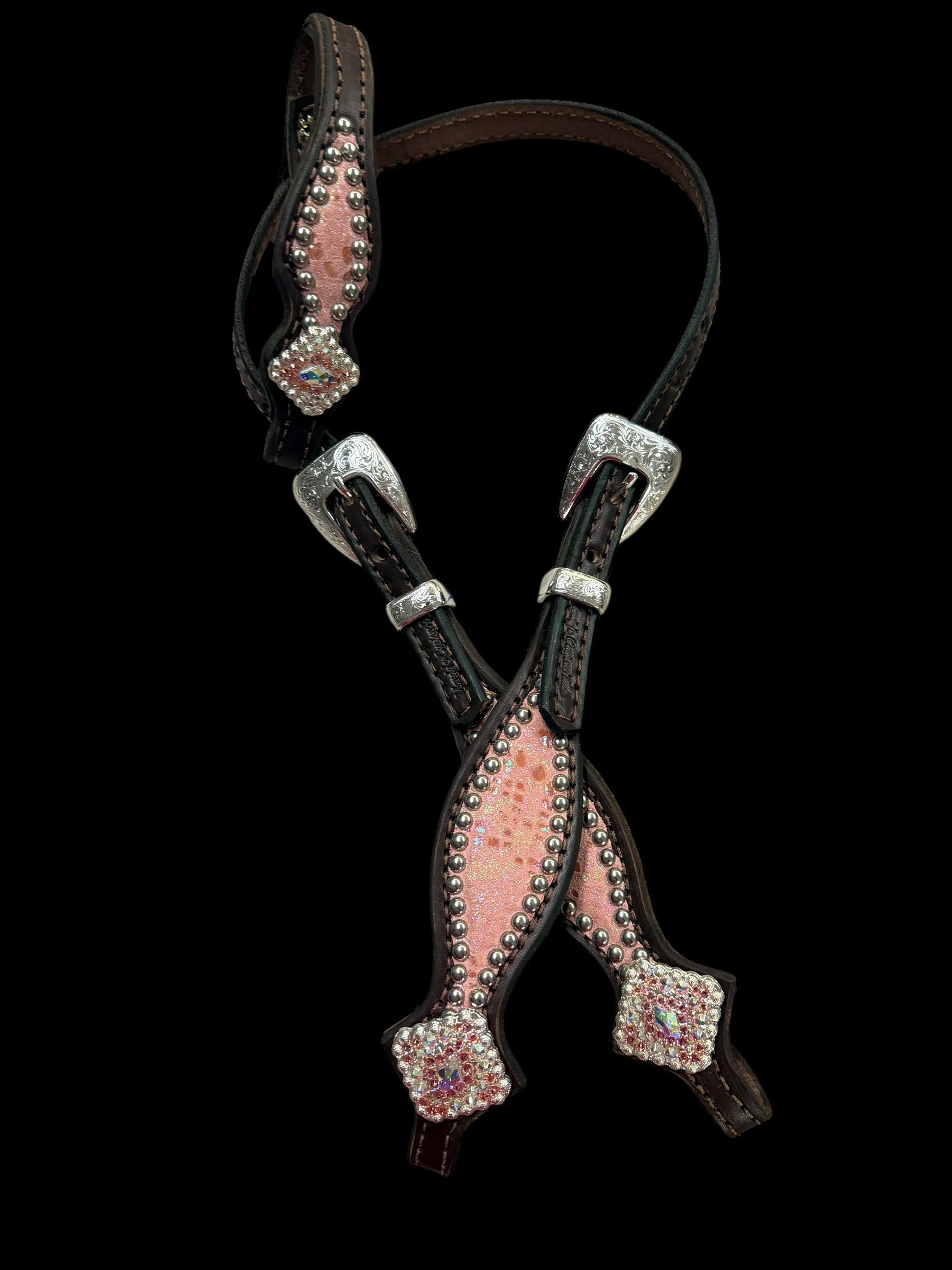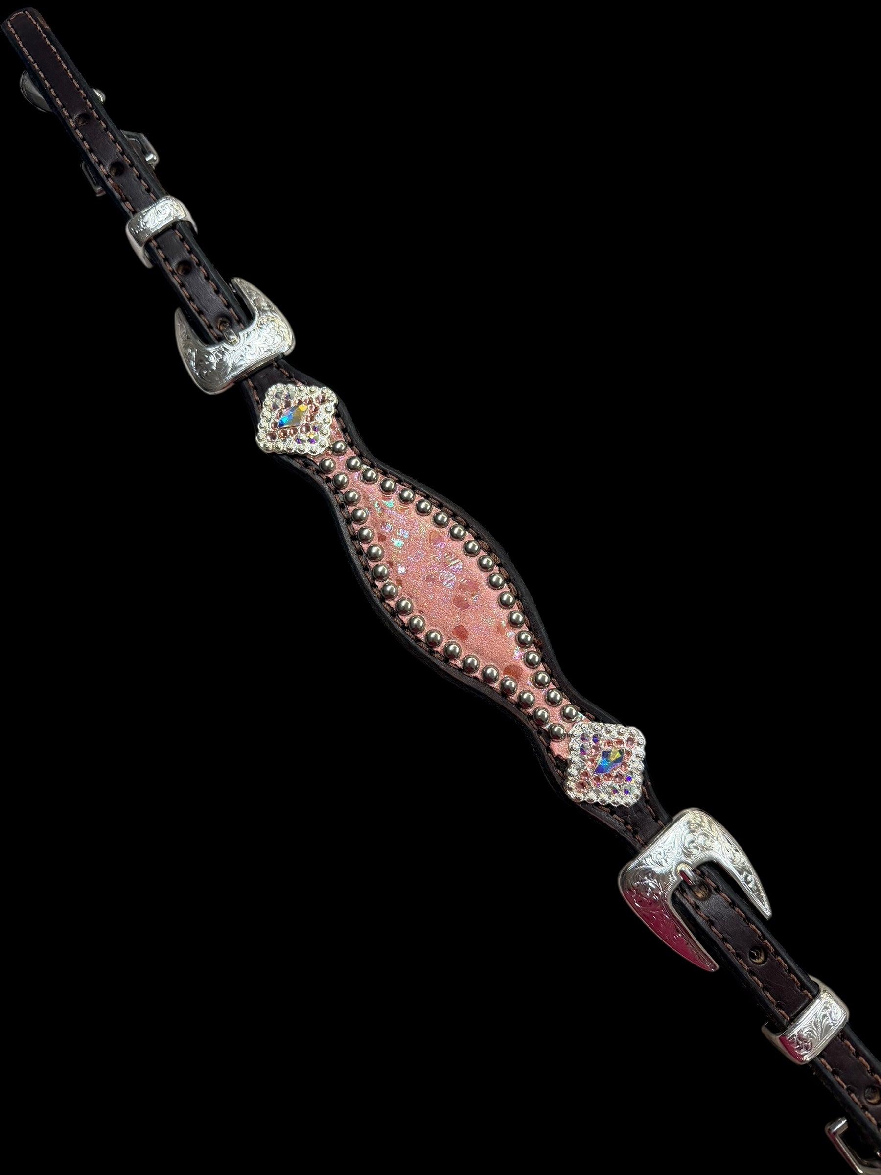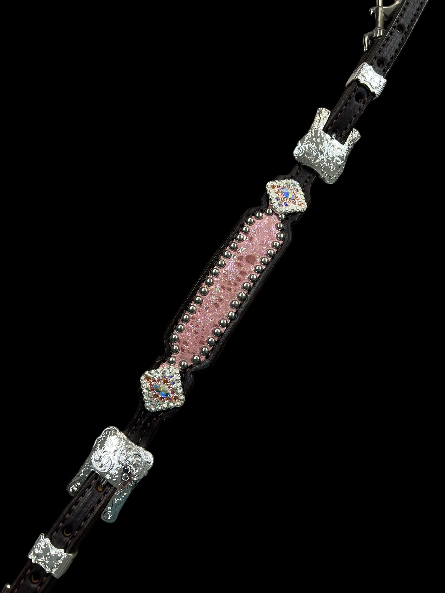 This breast collar features dark brown english bridle leather with pink mystic leather overlay, stainless spots, and conchos with genuine rhinestones .