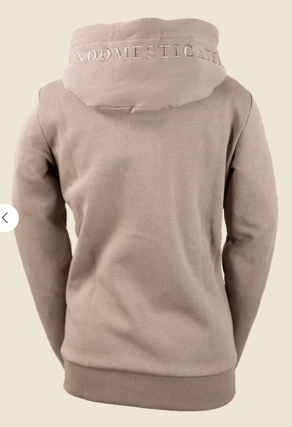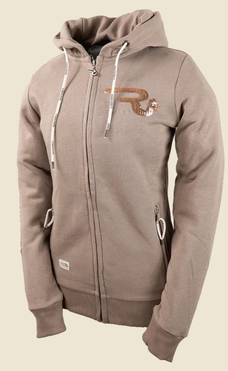 The Ranch Girls Hooded Sweatshirt `SELMA` sand, is an elegant cut with longer sleeves, providing the perfect fit for our equestrian requirements. Side pockets can be closed with zips. Our unmistakable brand design has been carefully realised with a shimmering sequin embroidery. The practical hooded zip jacket is of course made from our best three-thread fabric to meet the demands of everyday use