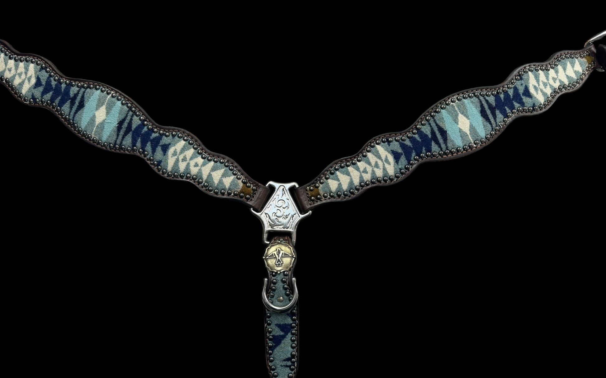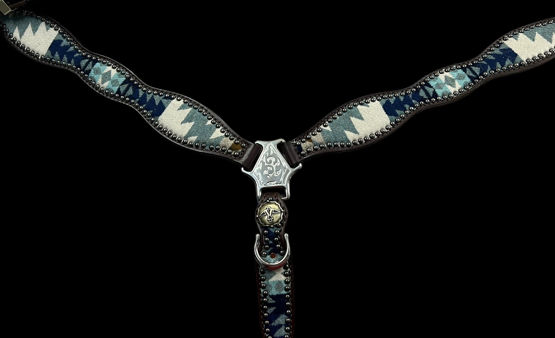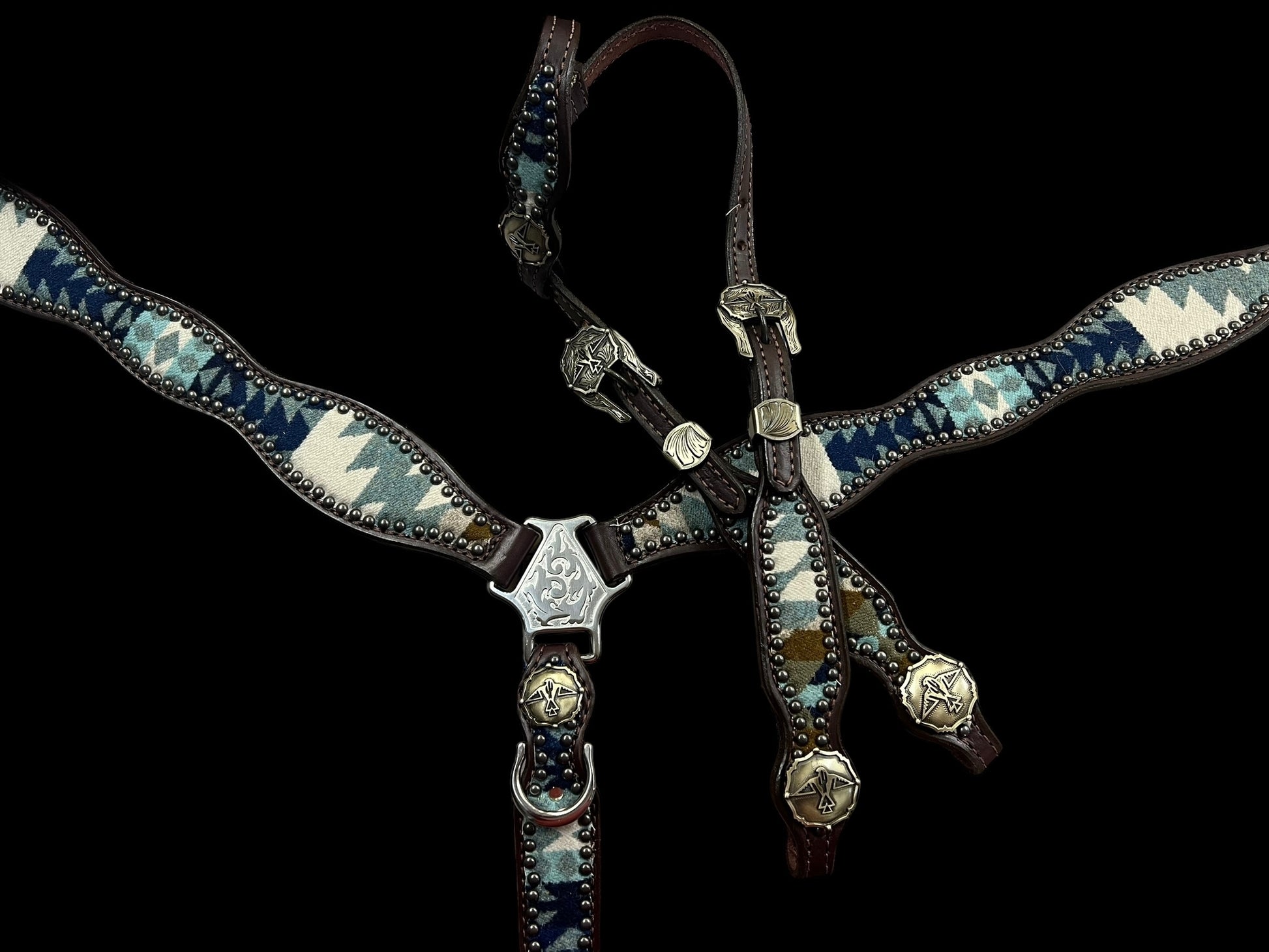 This ensemble features chocolate english bridle leather, with Pendleton® wool overlay, antique spots, and beautiful conchos.