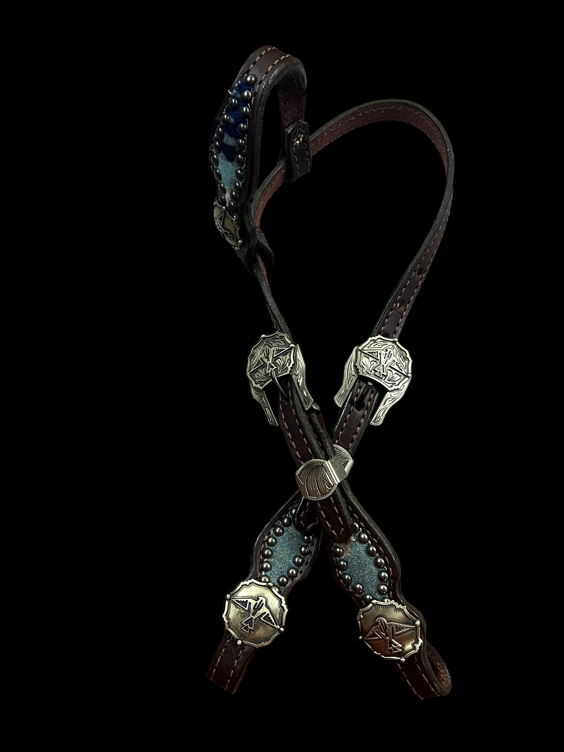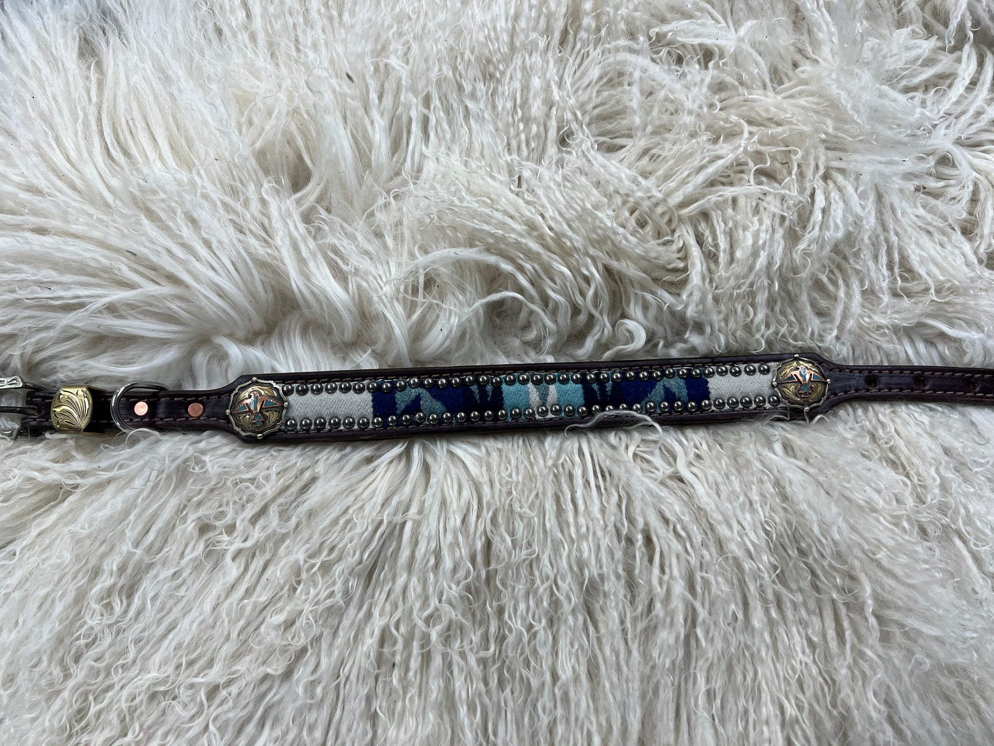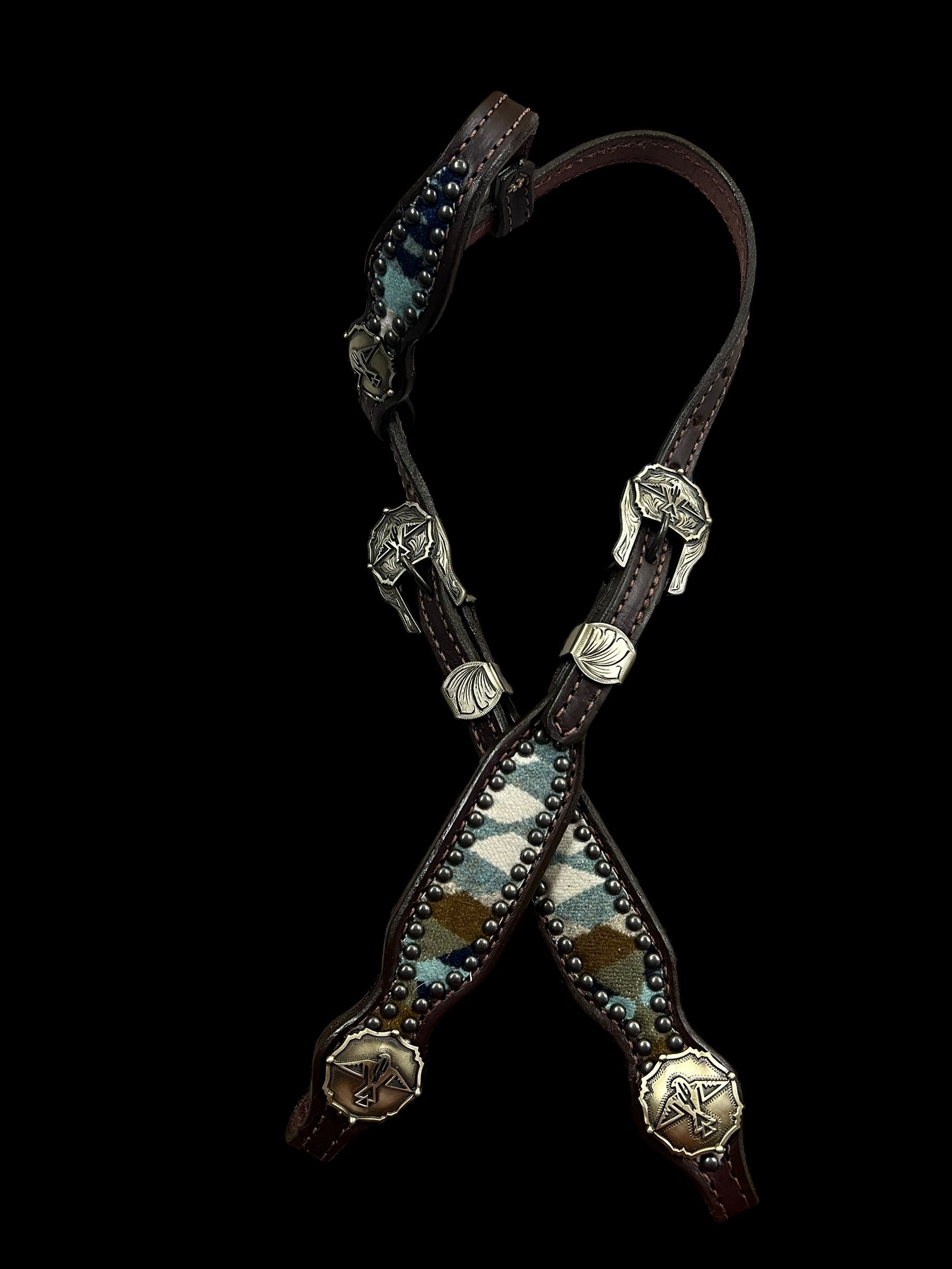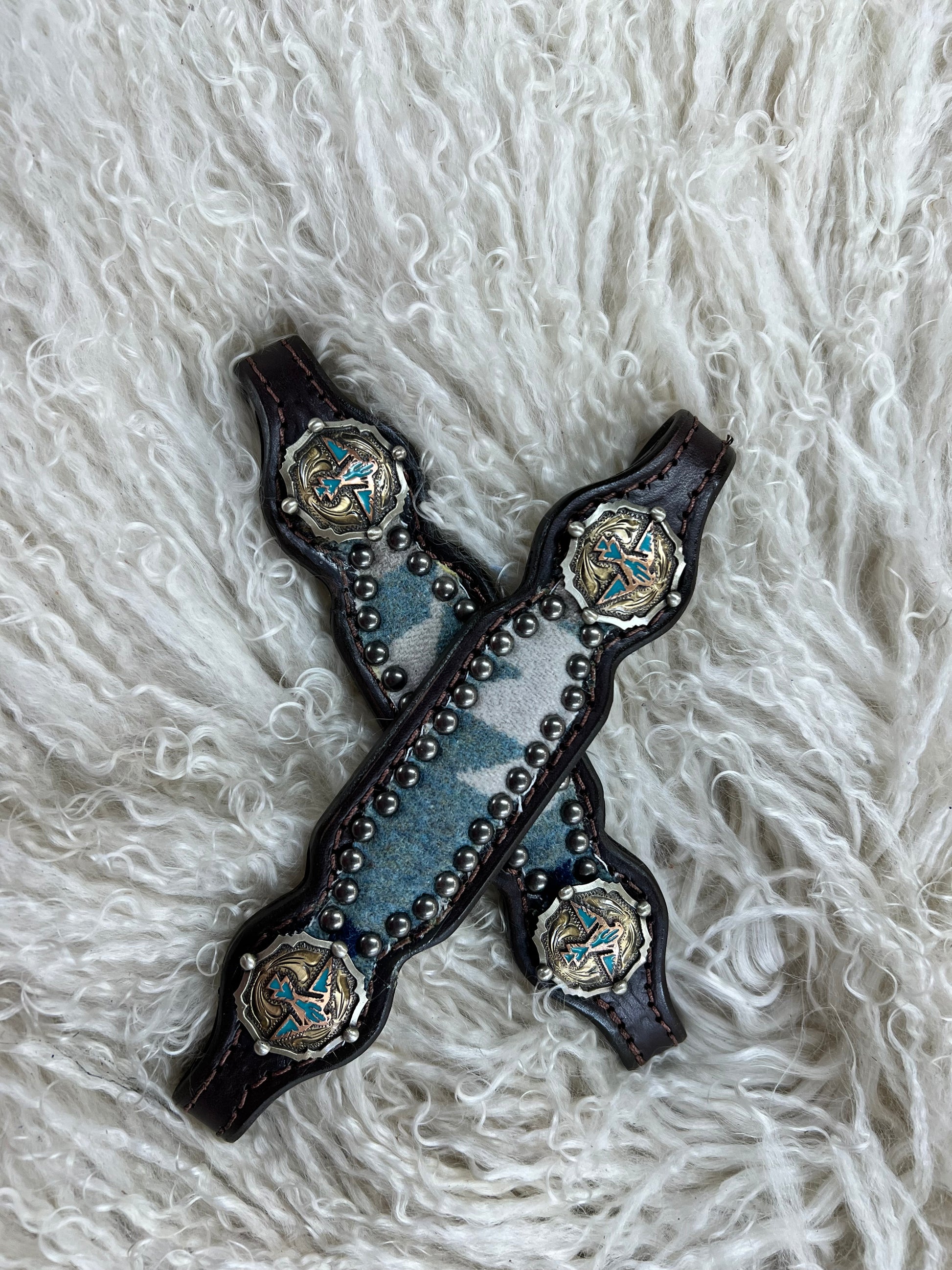 This ensemble features chocolate english bridle leather, with Pendleton® wool overlay, antique spots, and beautiful conchos.