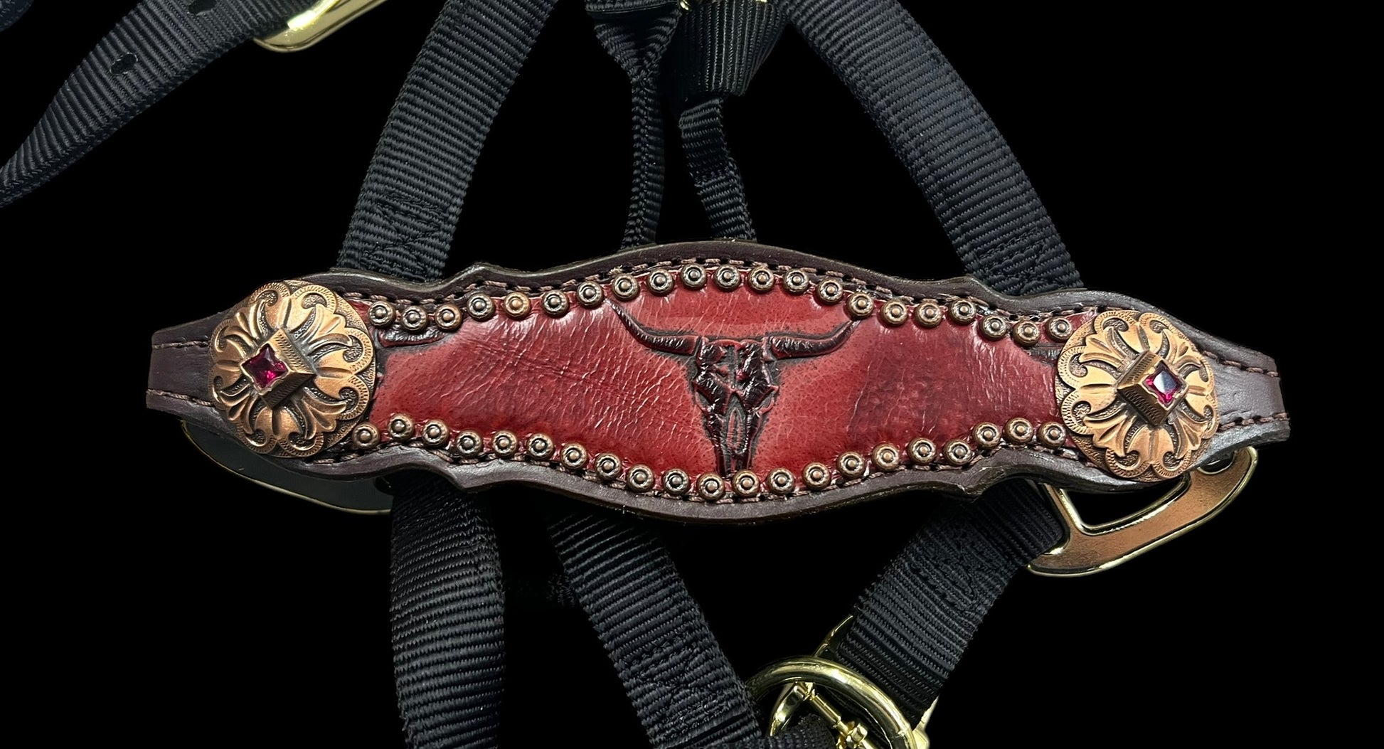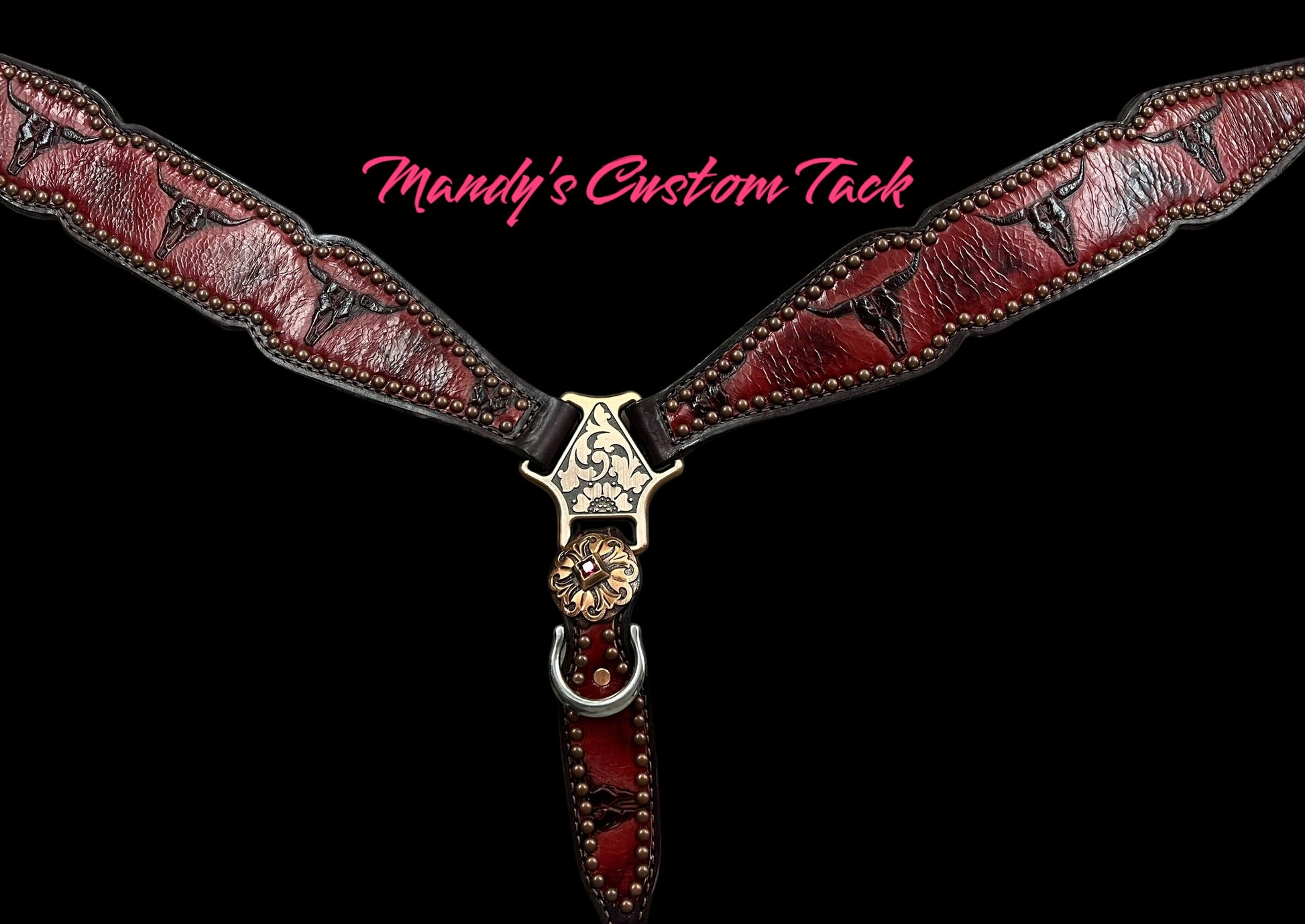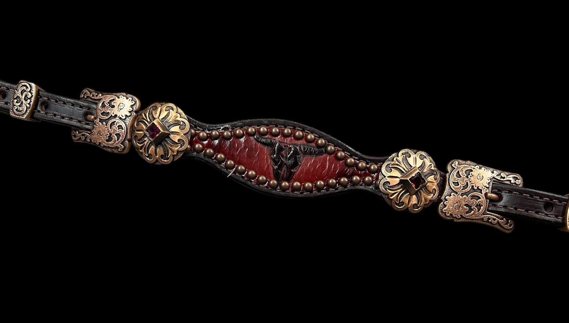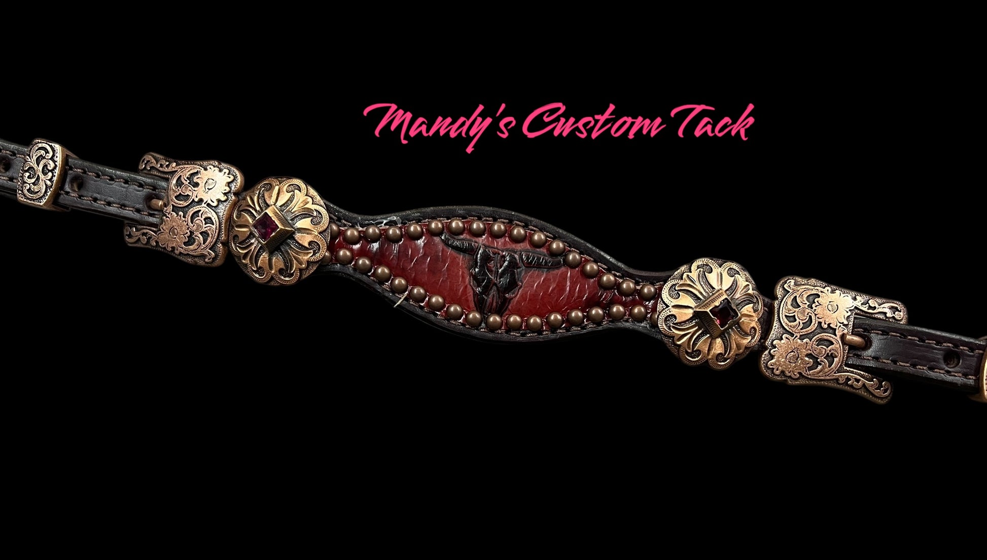 This ensemble features dark brown english bridle leather with red longhorn embossed leather overlay, copper spots, and handmade conchos