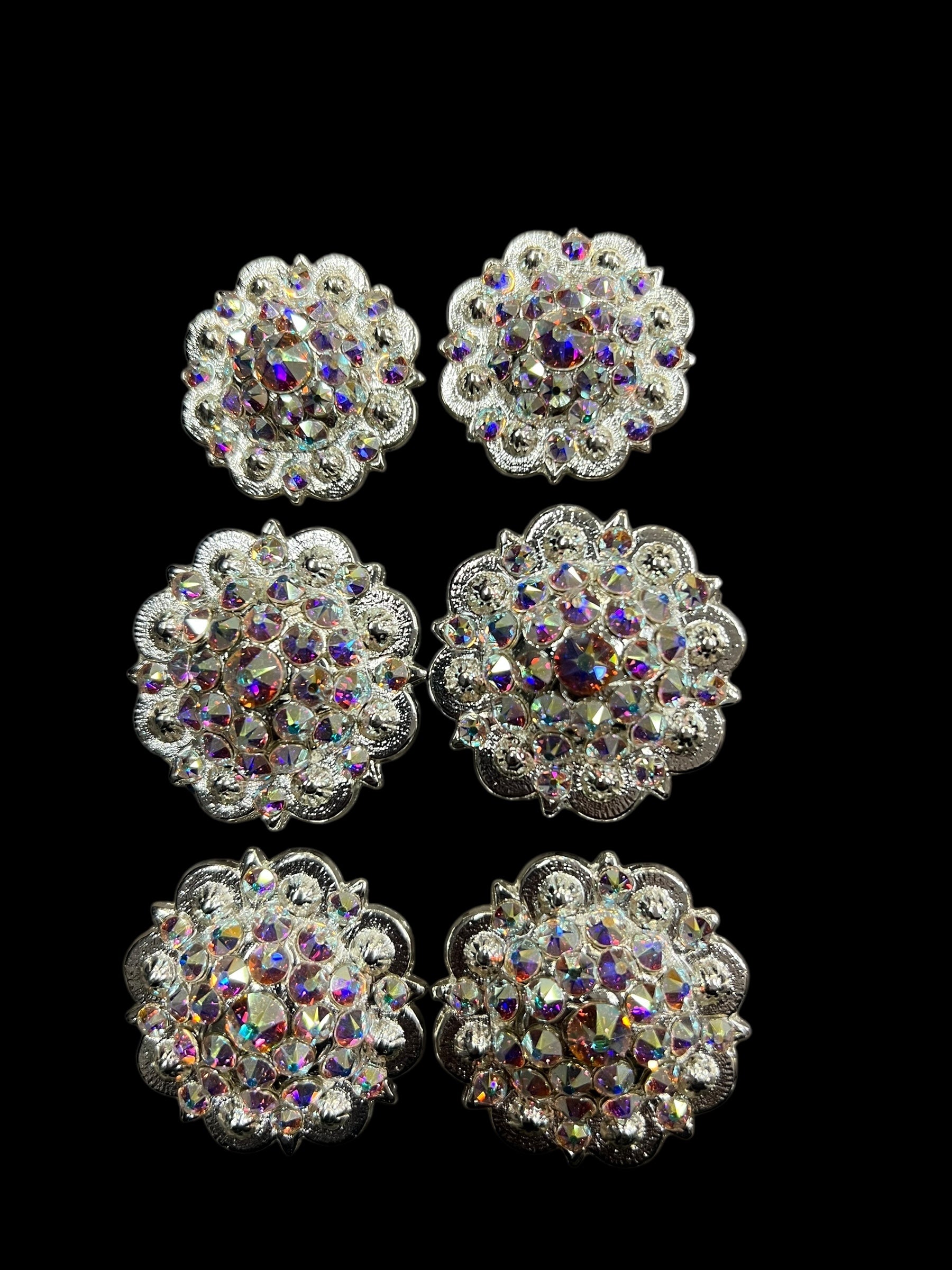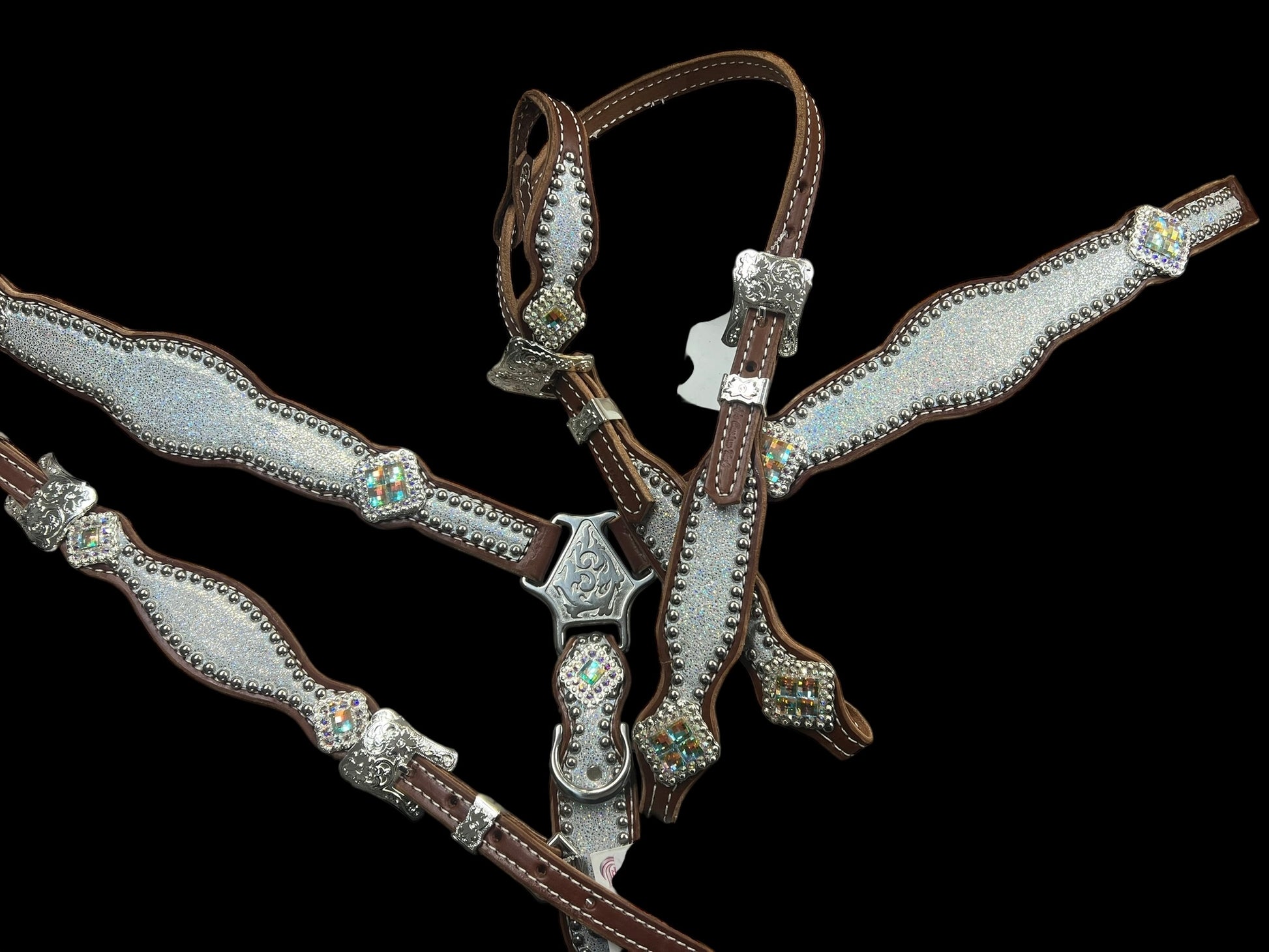 This ensemble features medium english bridle leather with silver ice overlay, stainless spots, and conchos with genuine rhinestones.
