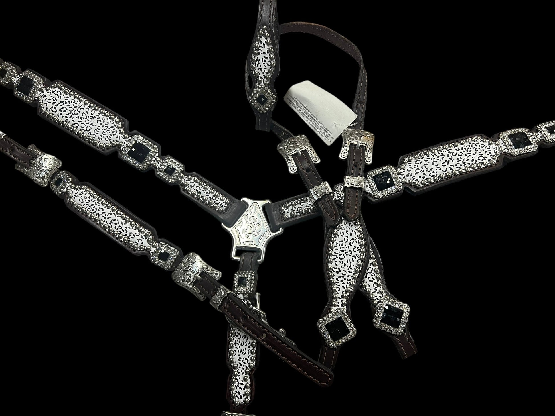 This ensemble features dark brown english bridle leather with snow leopard print leather overlay, stainless spots, and conchos with genuine rhinestones.