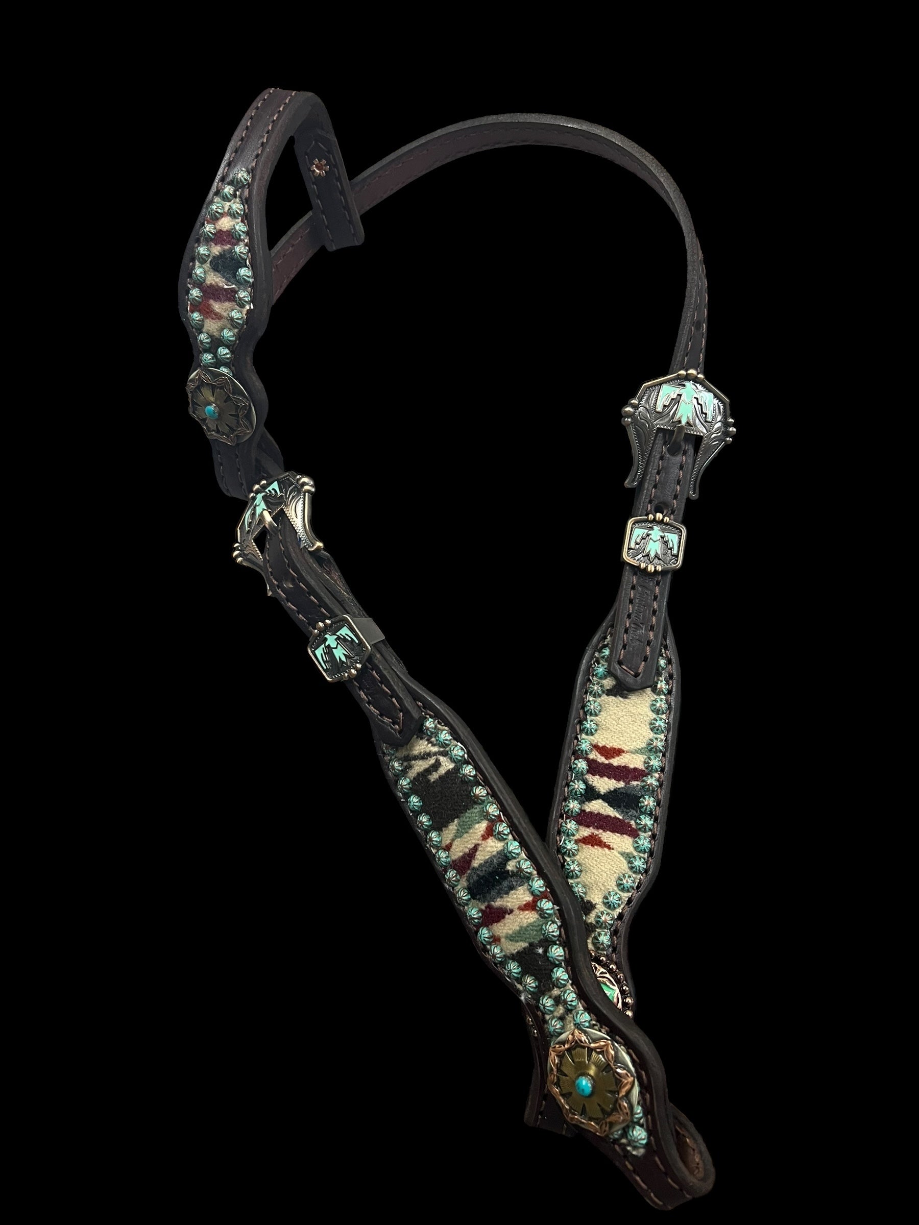 This ensemble features chocolate english bridle leather with Pendleton® wool overlay, copper patina spots, and handmade conchos