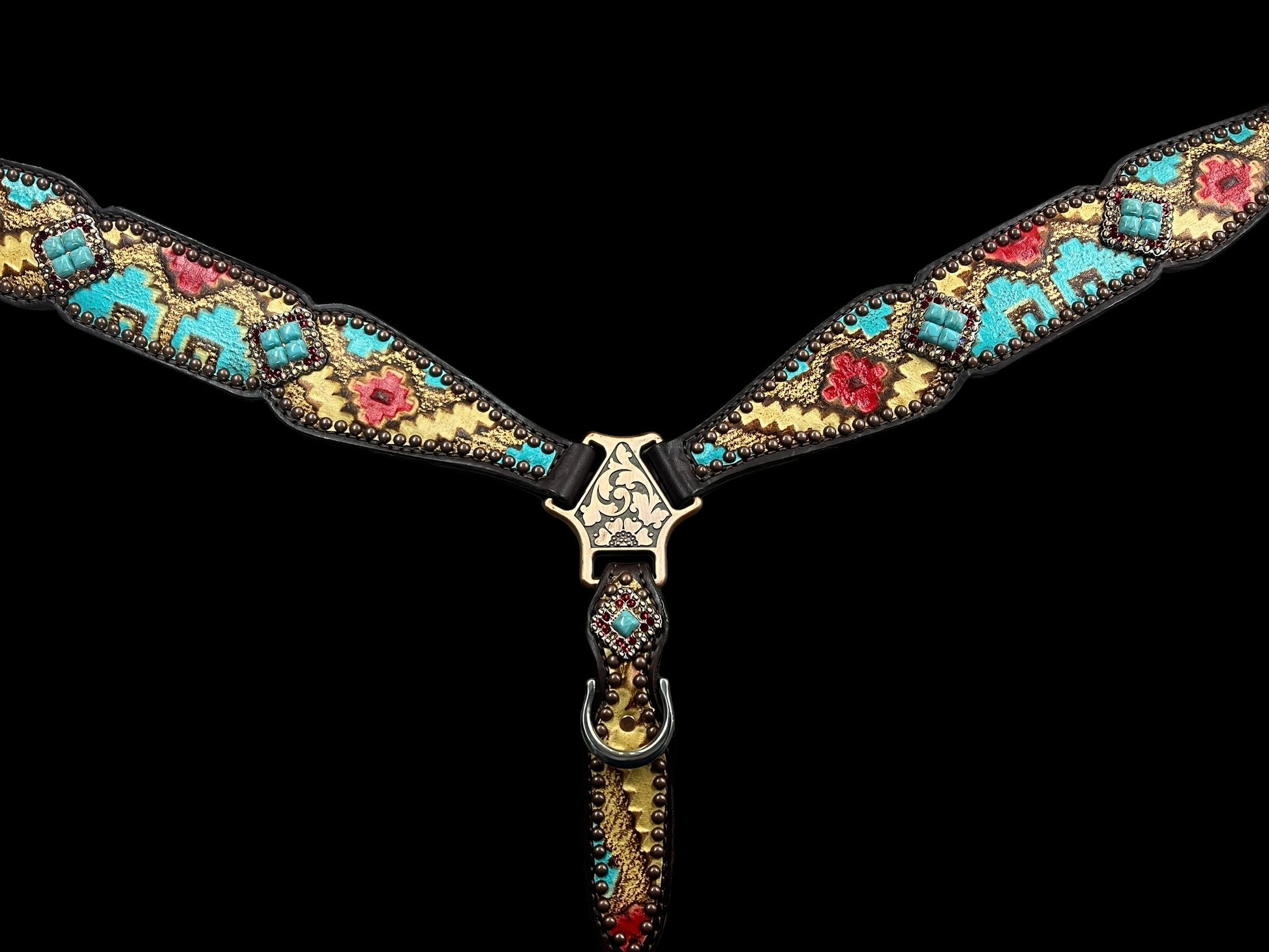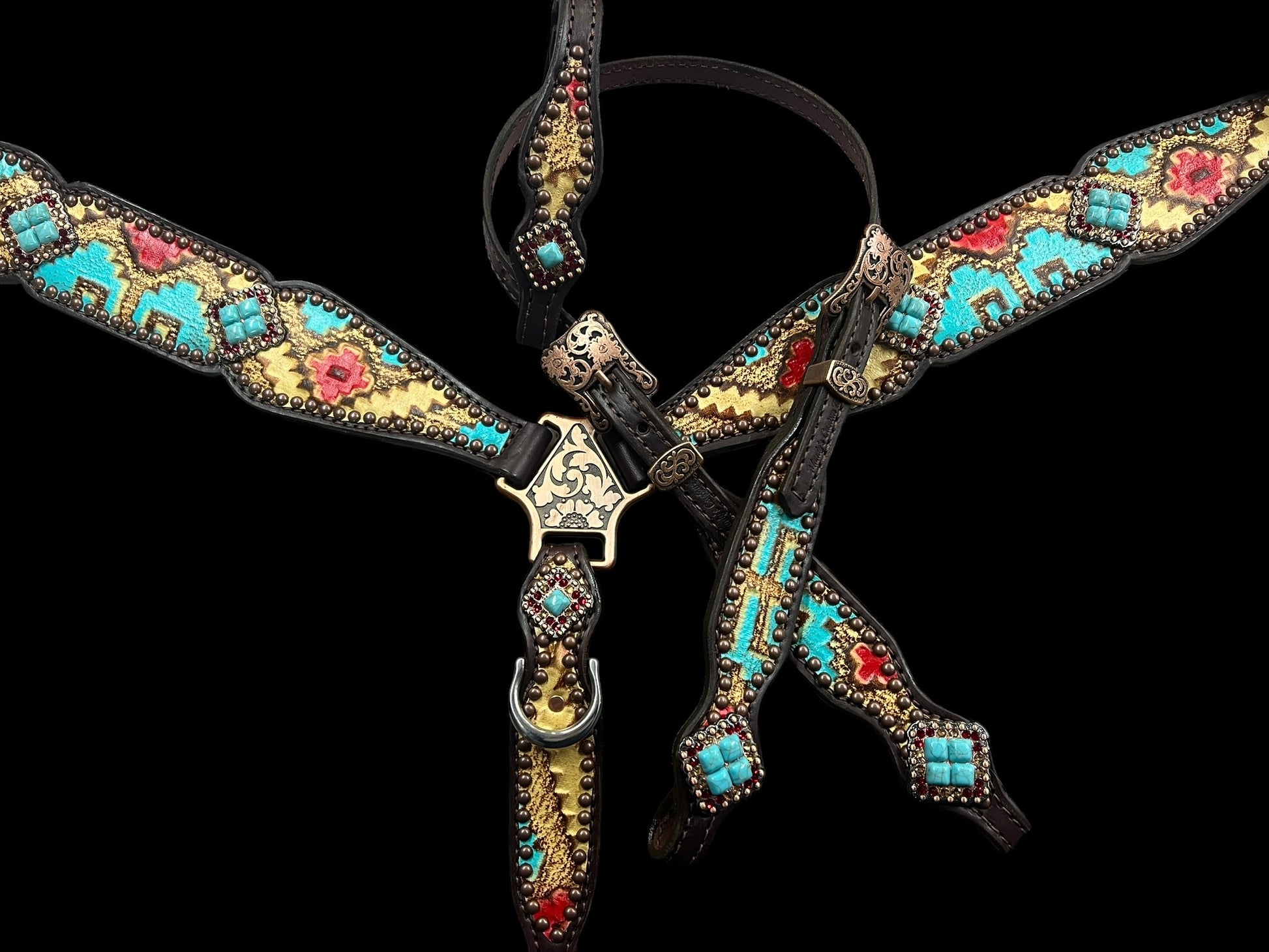 This ensemble features chocolate english bridle leather with tan, red, and turquoise Taos embossed leather overlay, copper spots, and conchos with genuine rhinestones and turquoise squares.