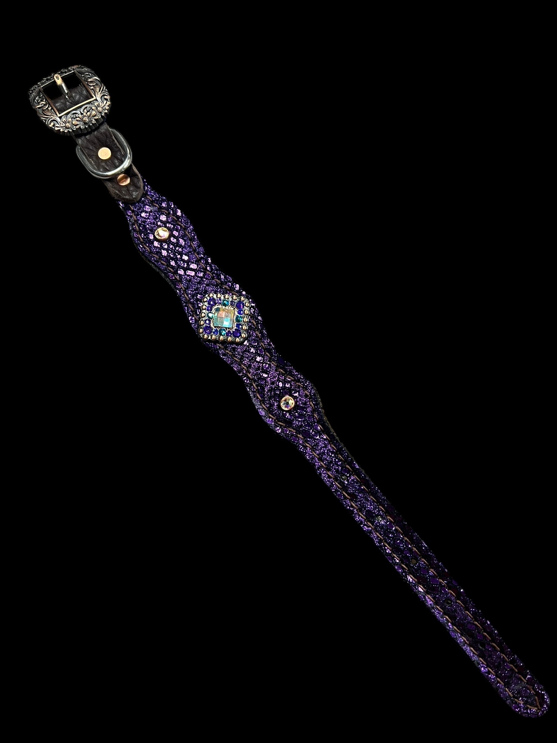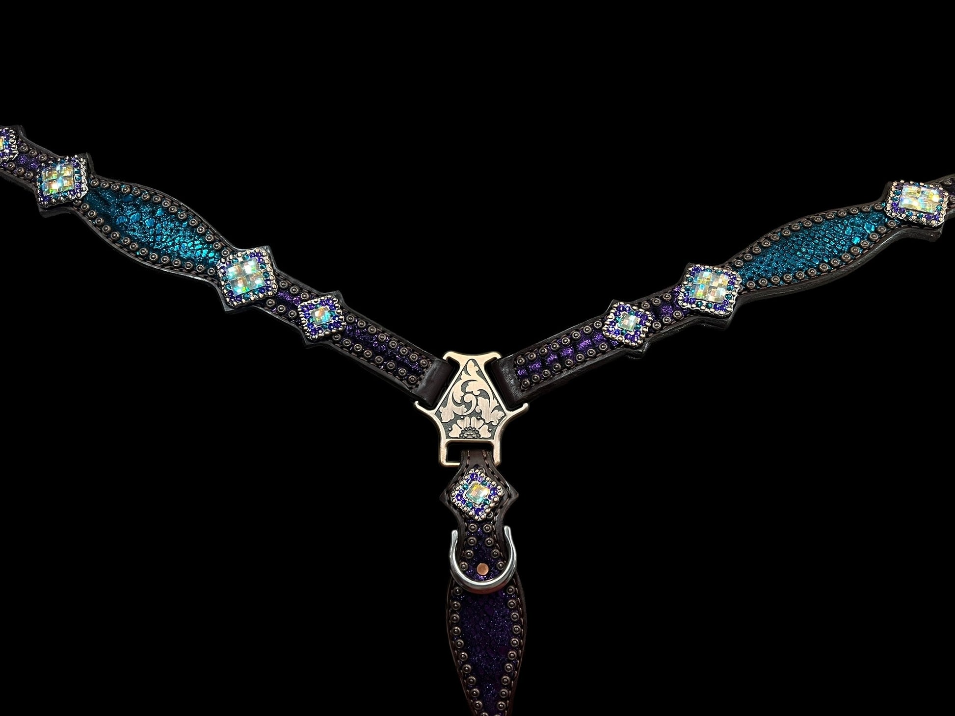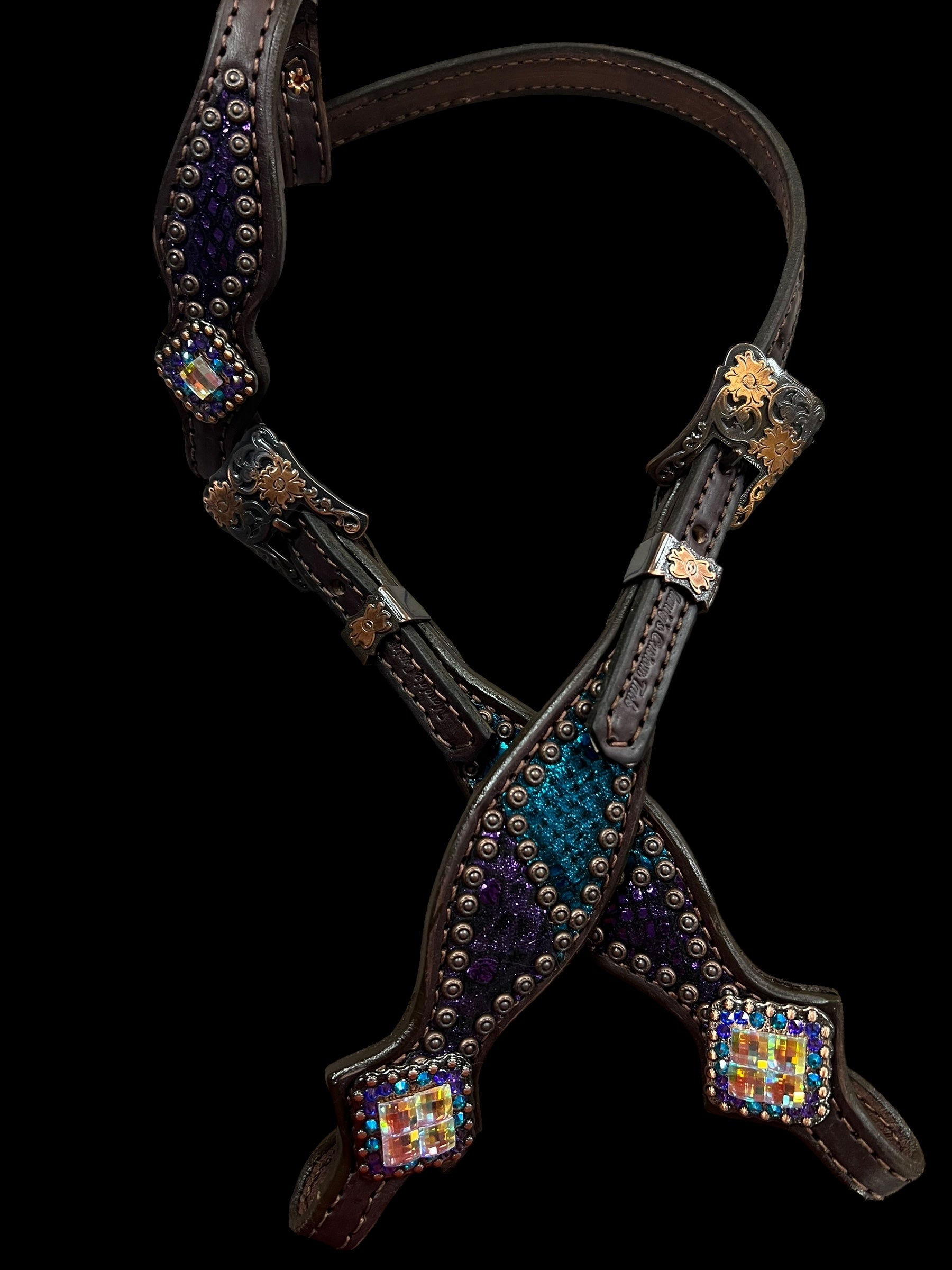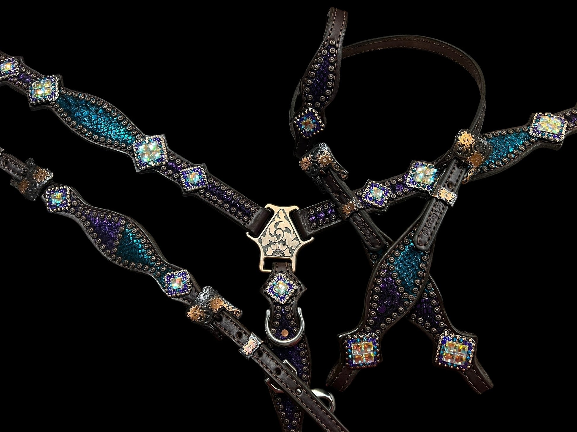 This ensemble features dark chocolate english bridle leather with teal and purple mystic leather overlay, copper spots, and conchos with genuine rhinestones.