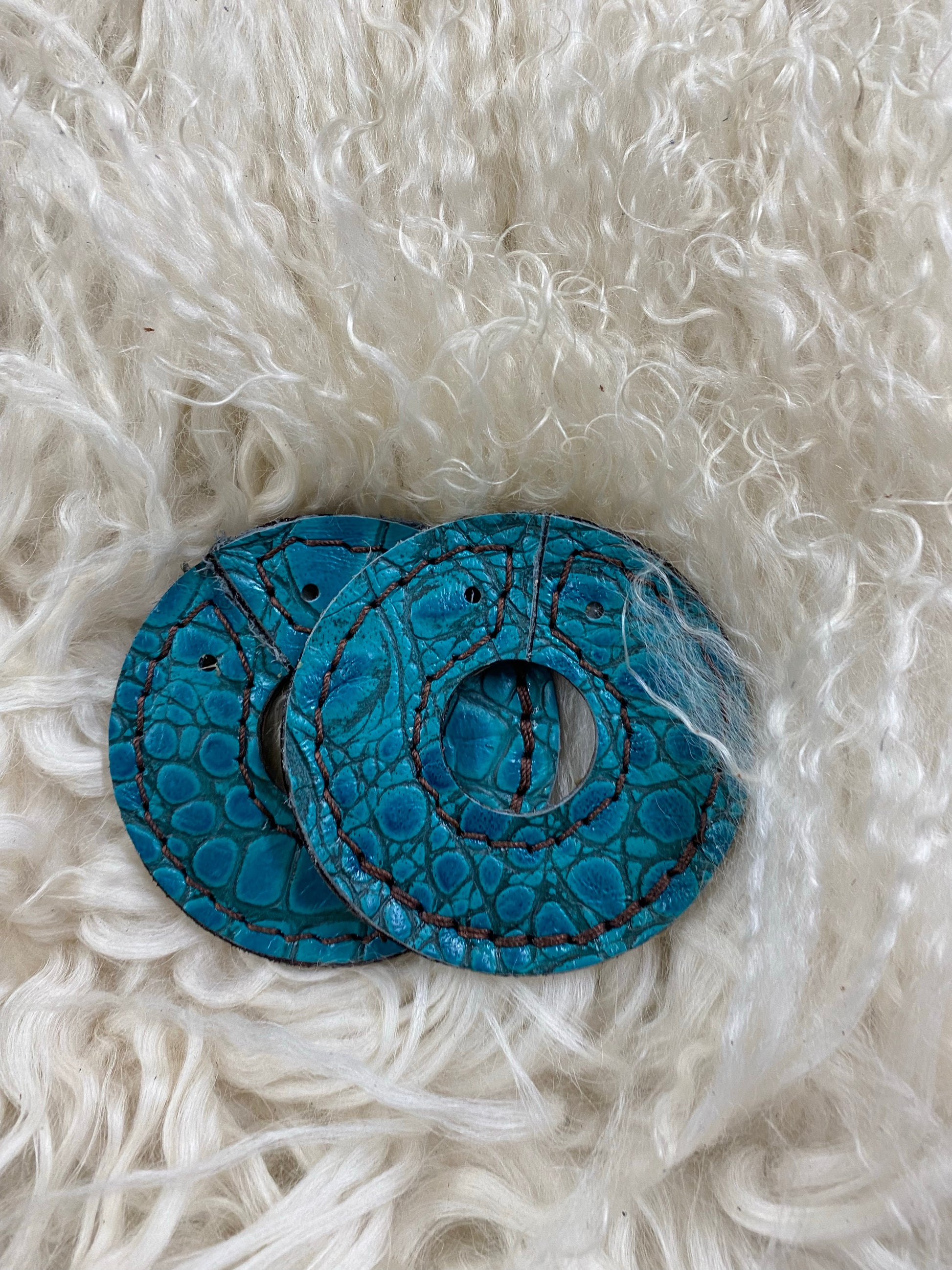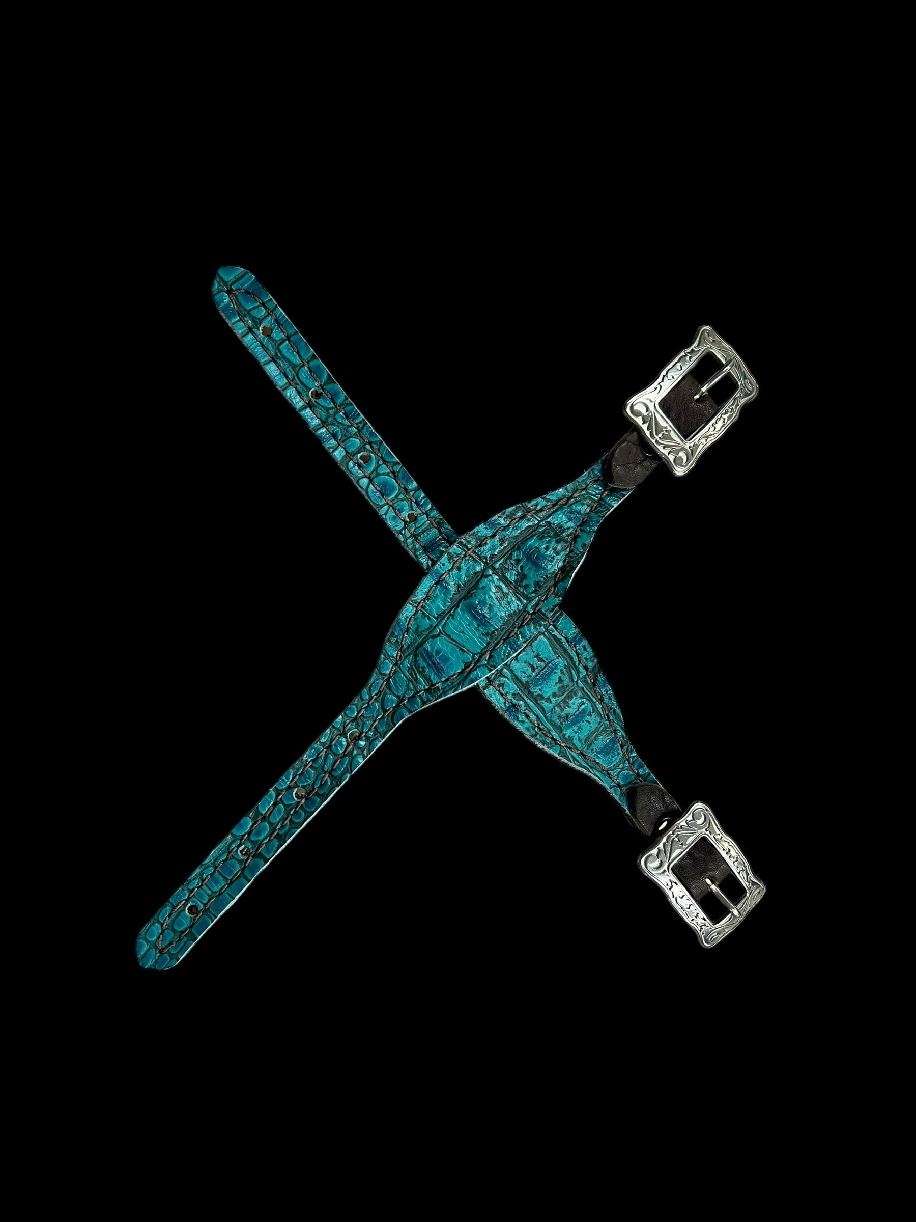 This ensembles features chocolate brown English bridle leather with teal gator embossed leather overlay, copper spots, and conchos with Swarovski rhinestones.
