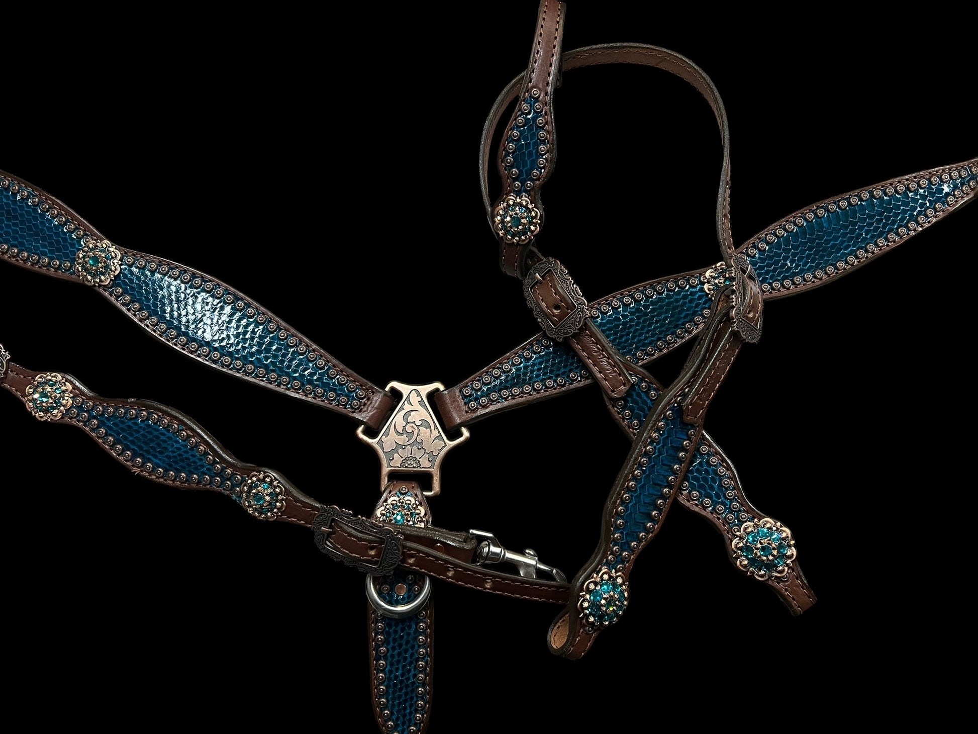 This ensemble features dark chocolate english bridle leather with a beautiful and  genuine deep teal snake overlay, copper spots, and genuine rhinestones.  This one is going to get you noticed!!