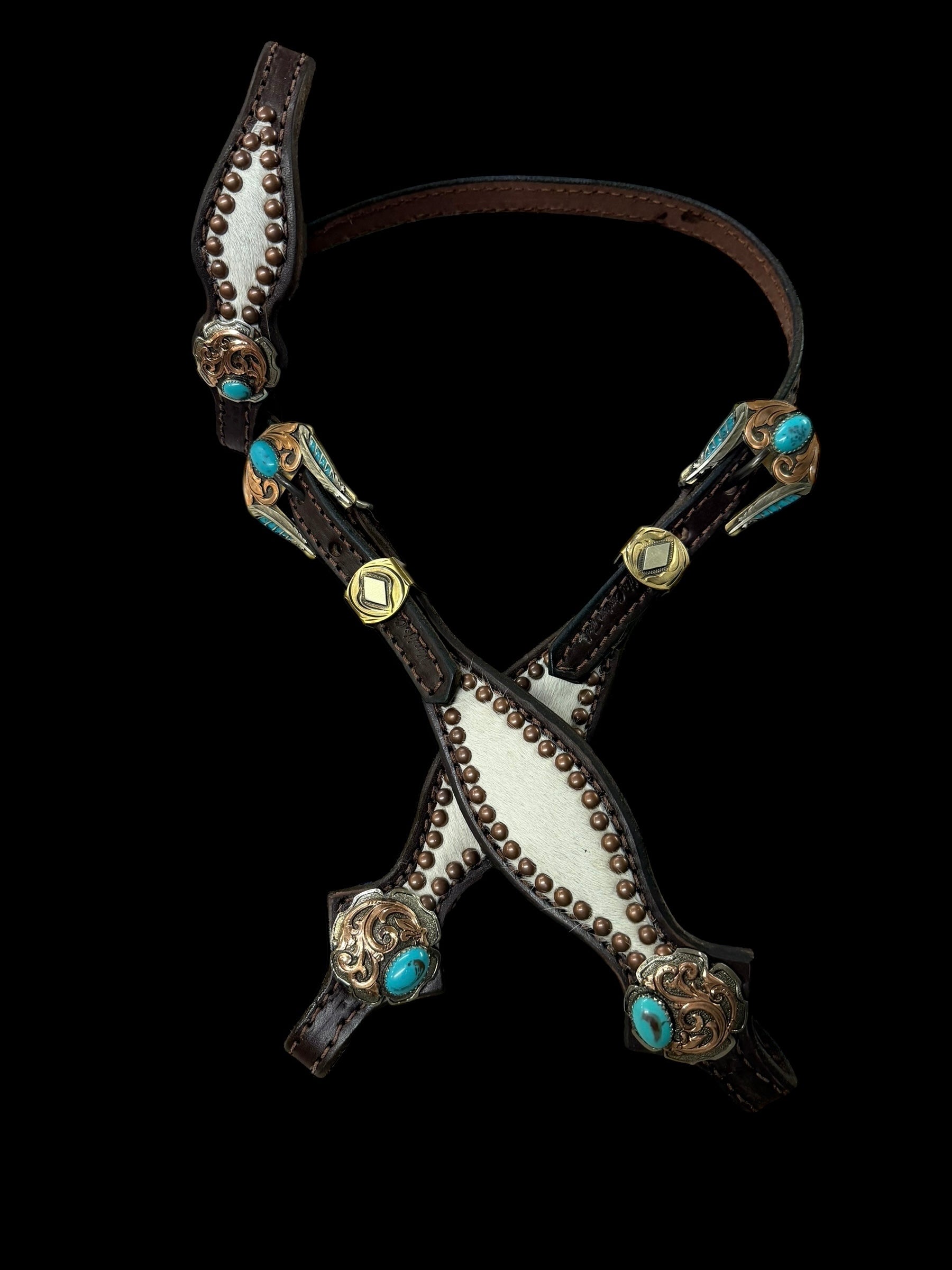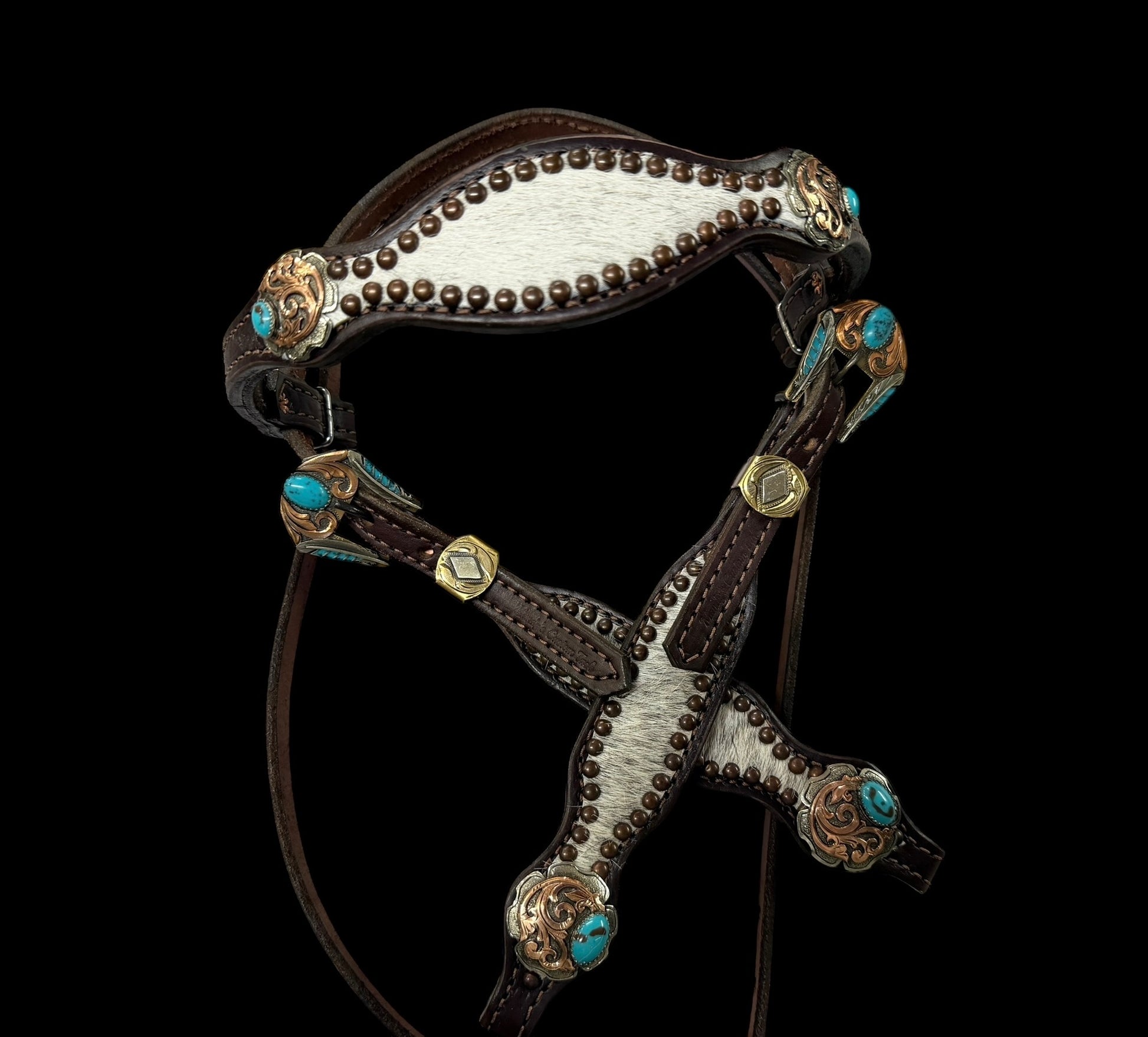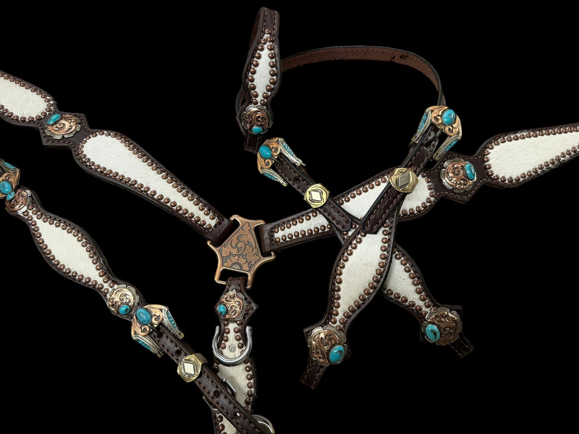 This ensemble features dark english bridle leather with white and grey brindle hair on hide leather overlay, copper spots, and handmade conchos and buckles
