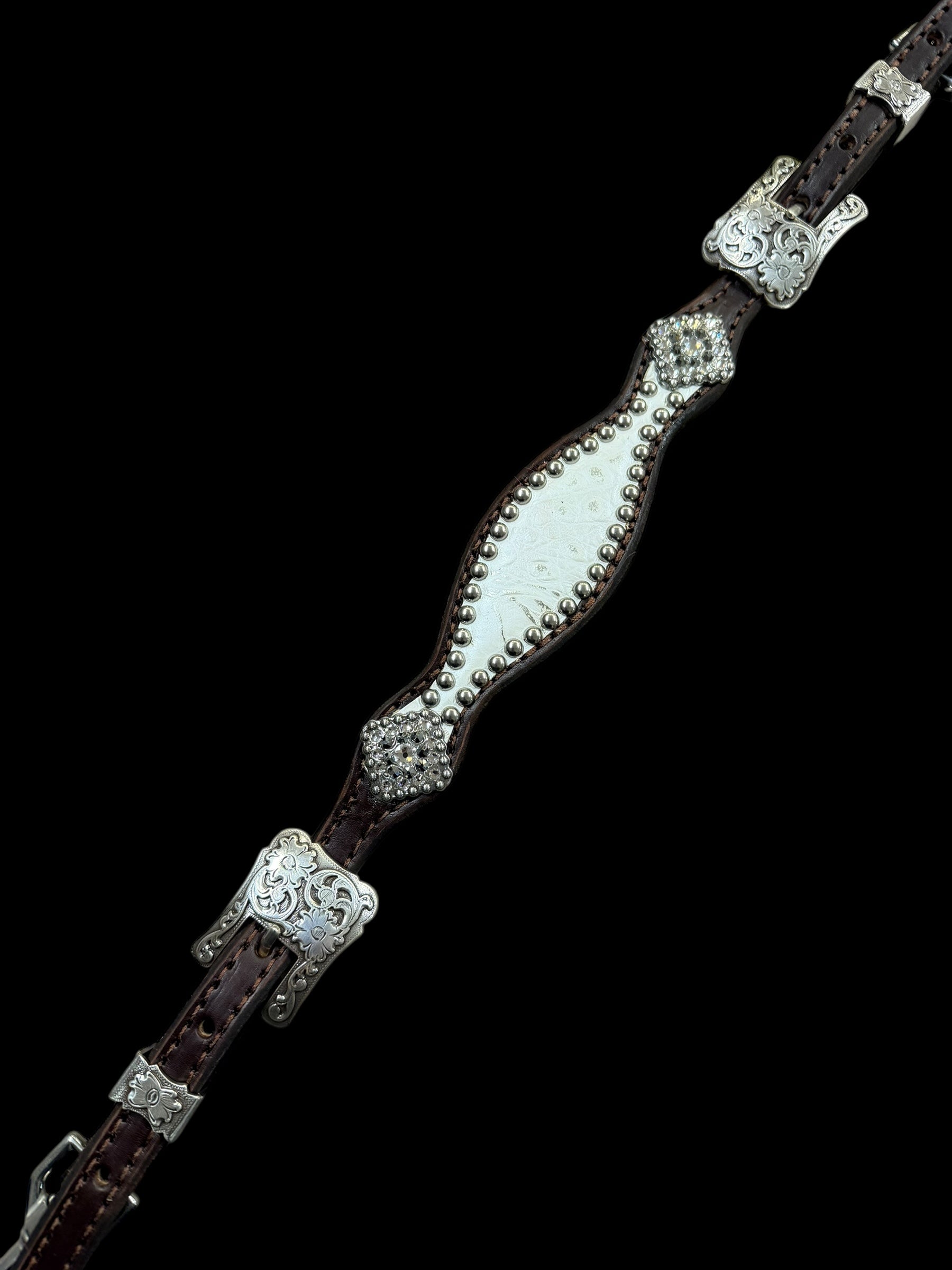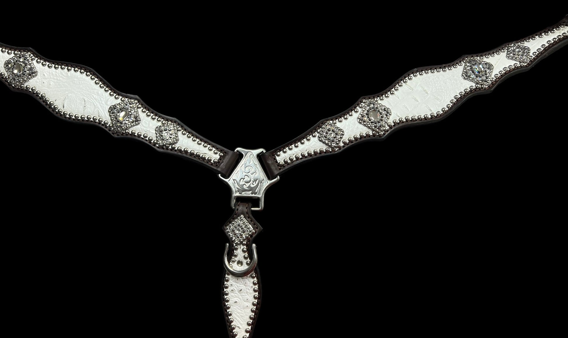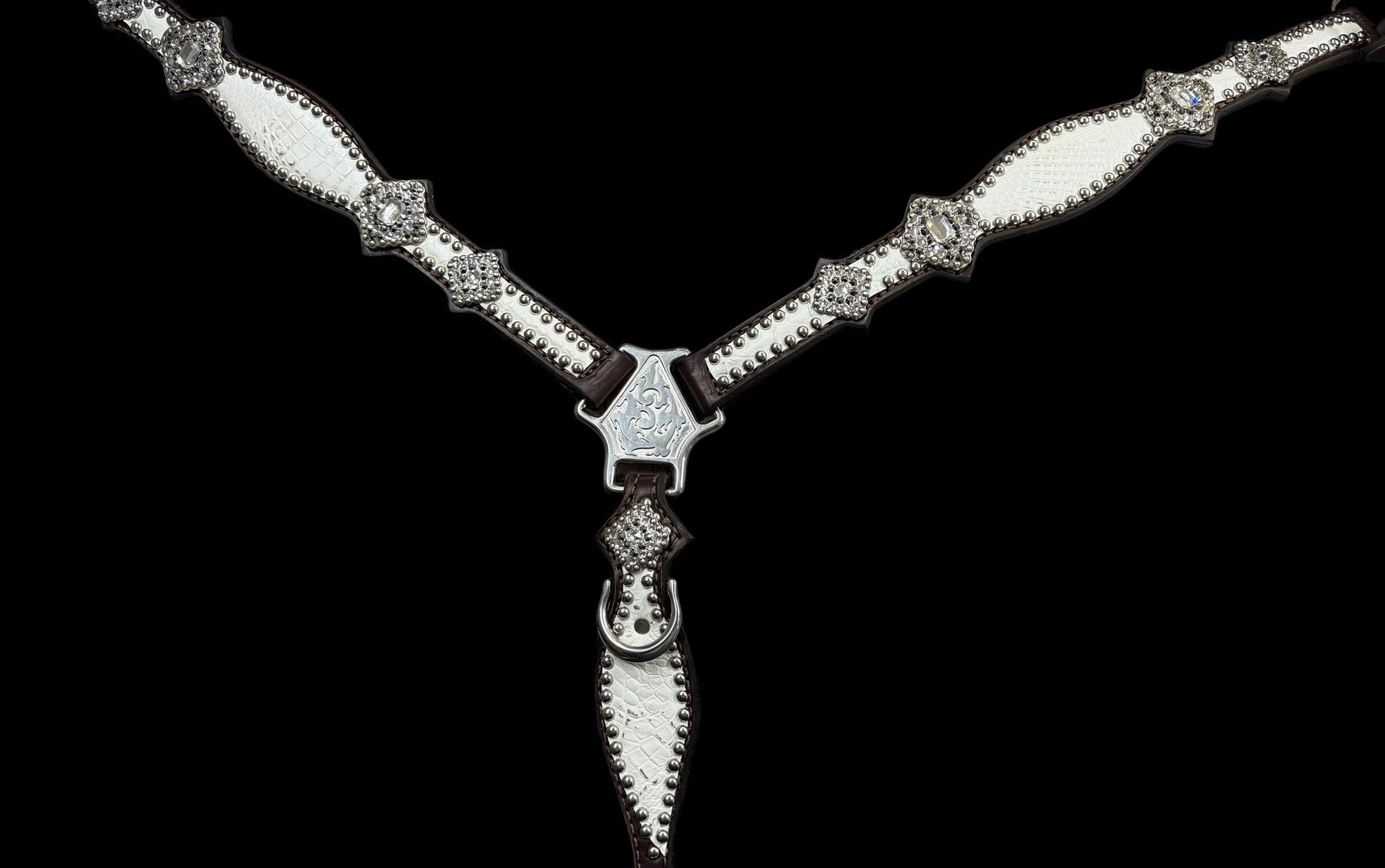 This ensemble features dark chocolate english bridle leather with white with silver tips gator embossed leather overlay, stainless spots, and conchos with genuine rhinestones.