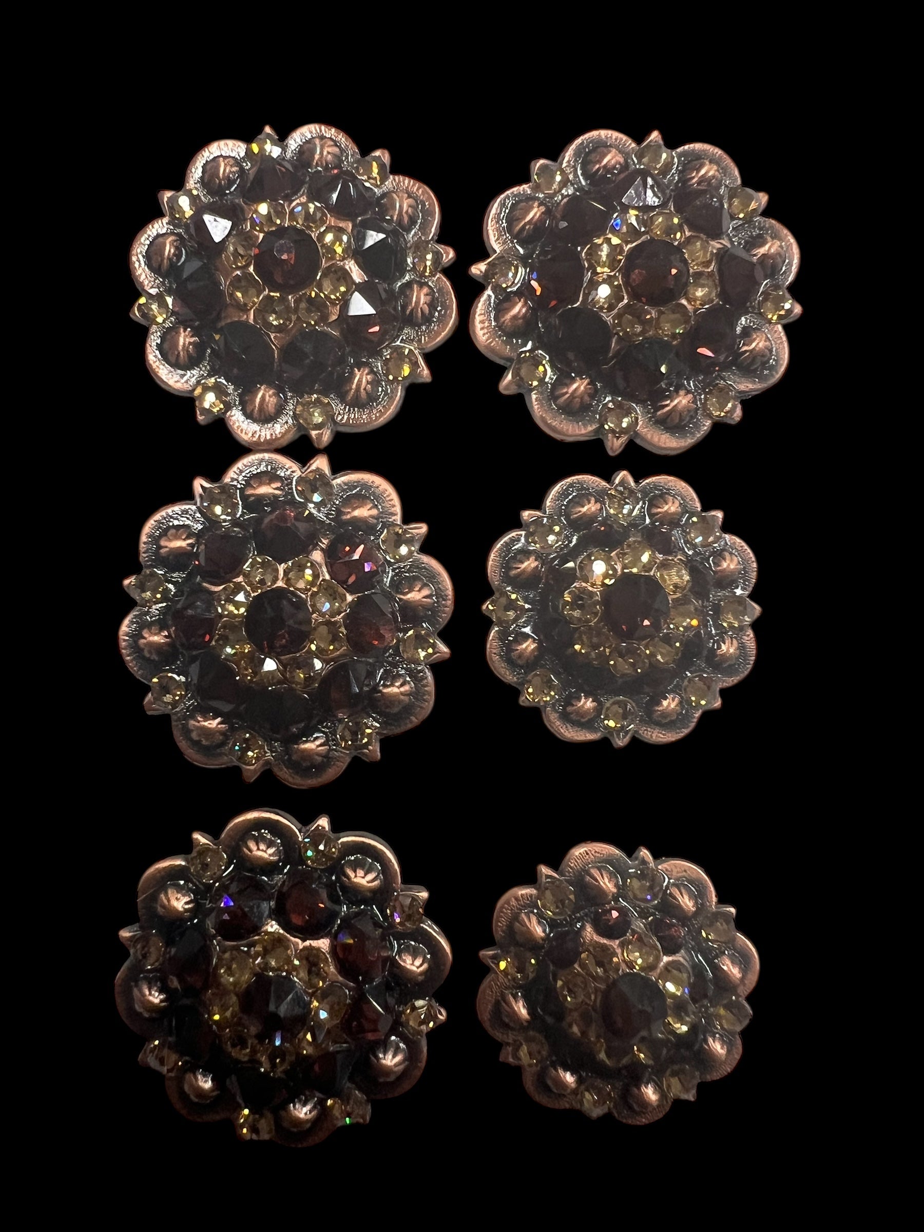 This ensemble features dark chocolate english bridle leather with wine gator embossed leather overlay, copper spots, and conchos with genuine rhinestones .